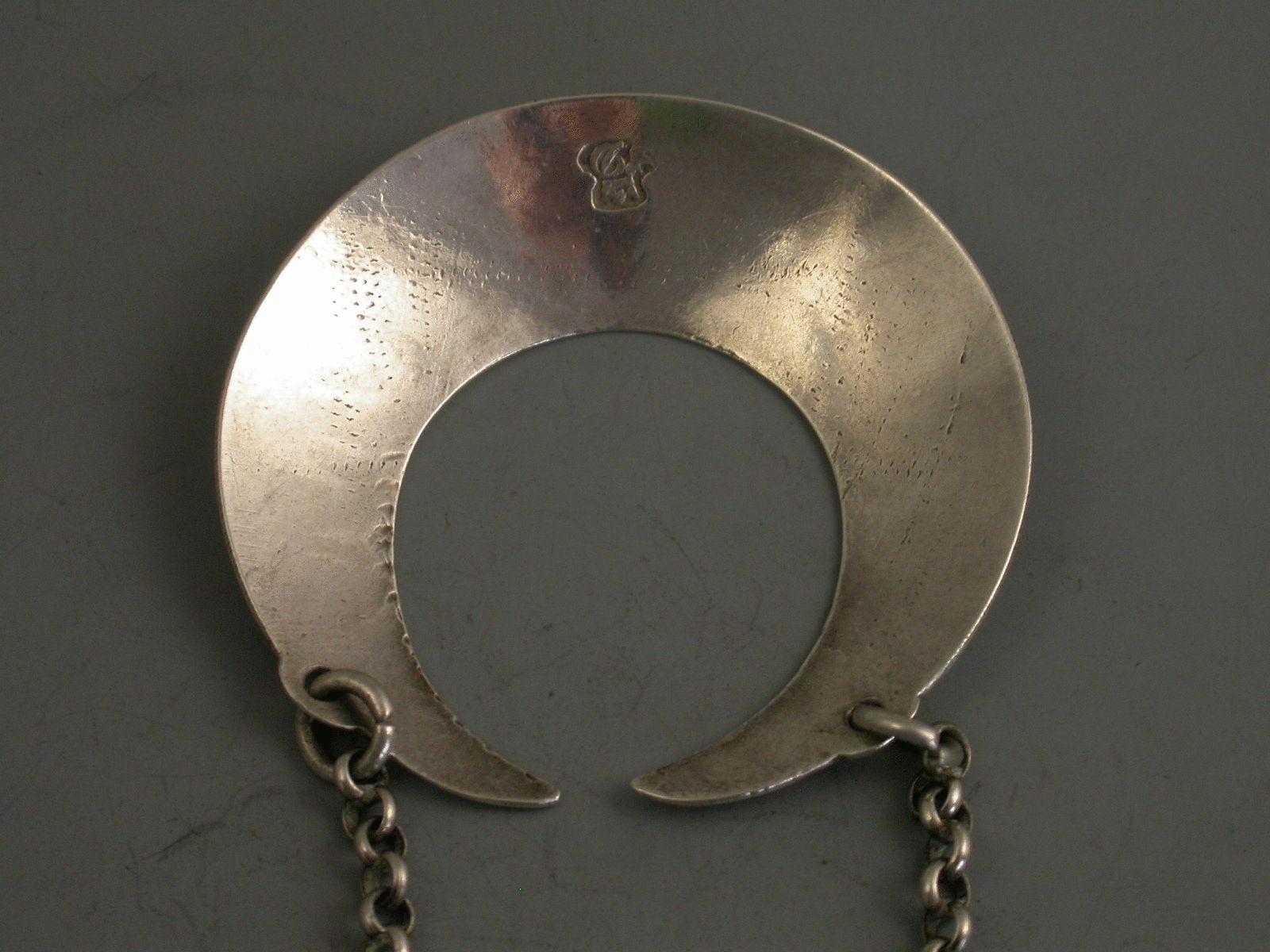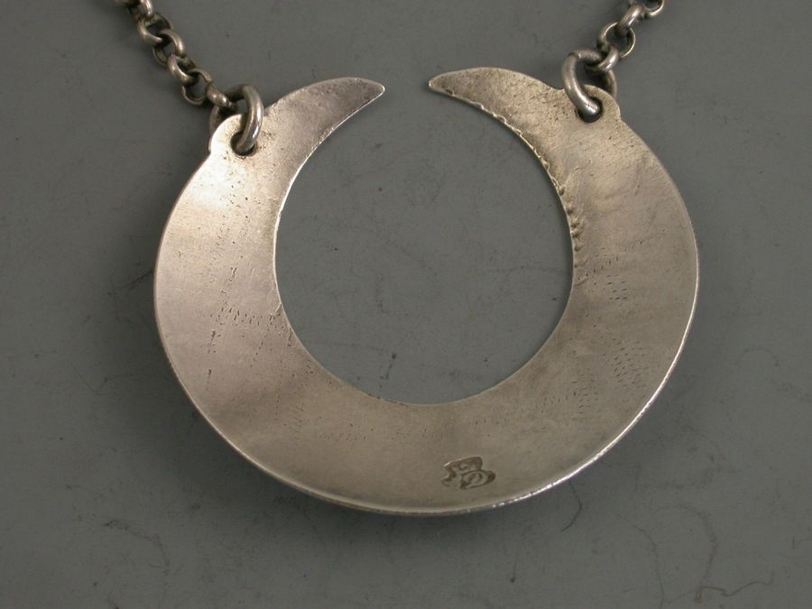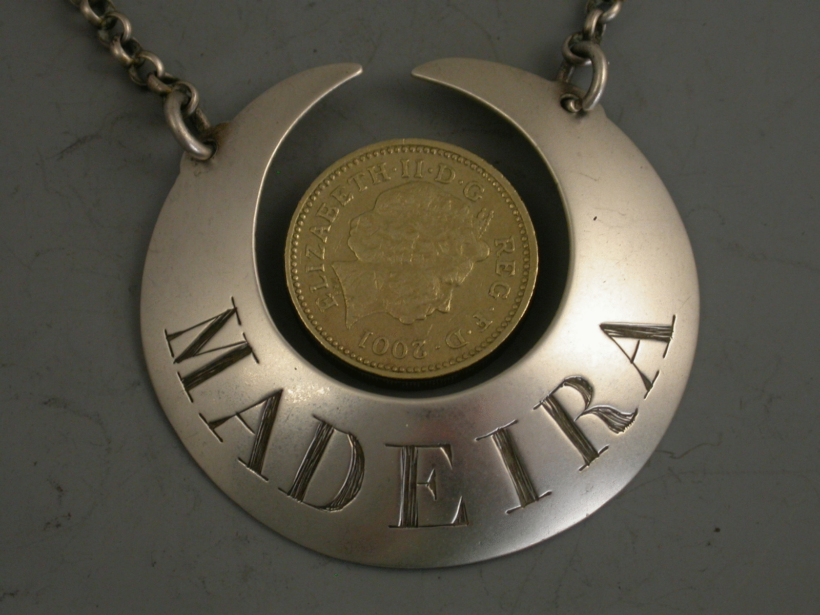 An extremely rare George II silver Wine Label of large plain crescent form with protruding ears holding the jumper rings for the suspension chain, incised for Madeira.