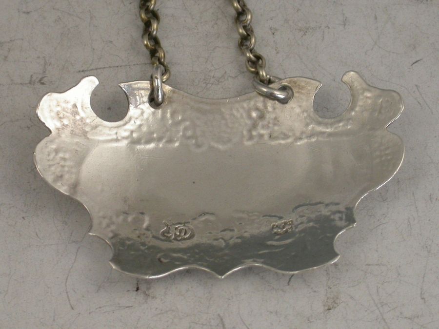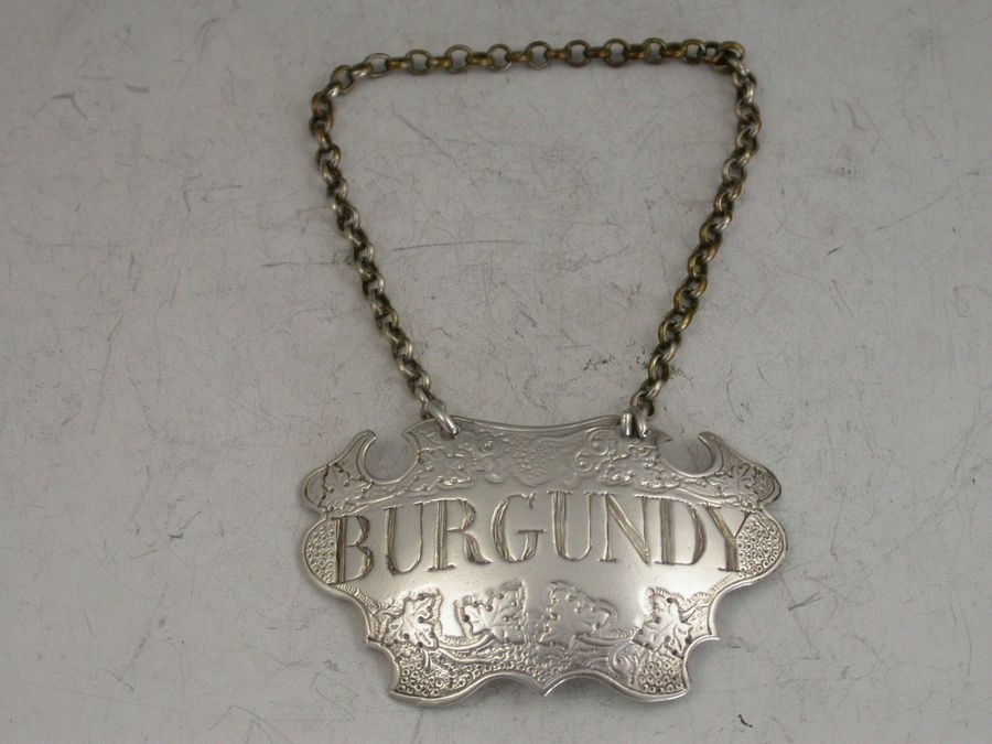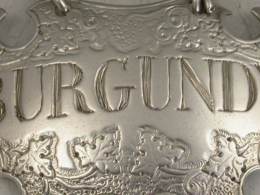 A rare George II silver Wine Label of engraved escutcheon form decorated with vine leaves and grapes, incised for Burgundy.