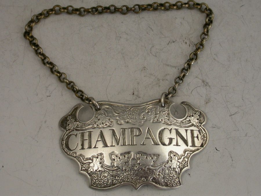 A good George II silver Wine Label of engraved escutcheon form, decorated with vine leaves and grapes on a matt-background, incised for Champagne.