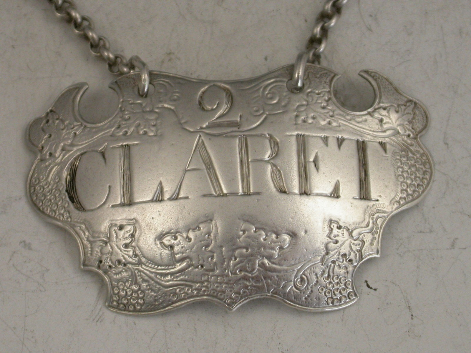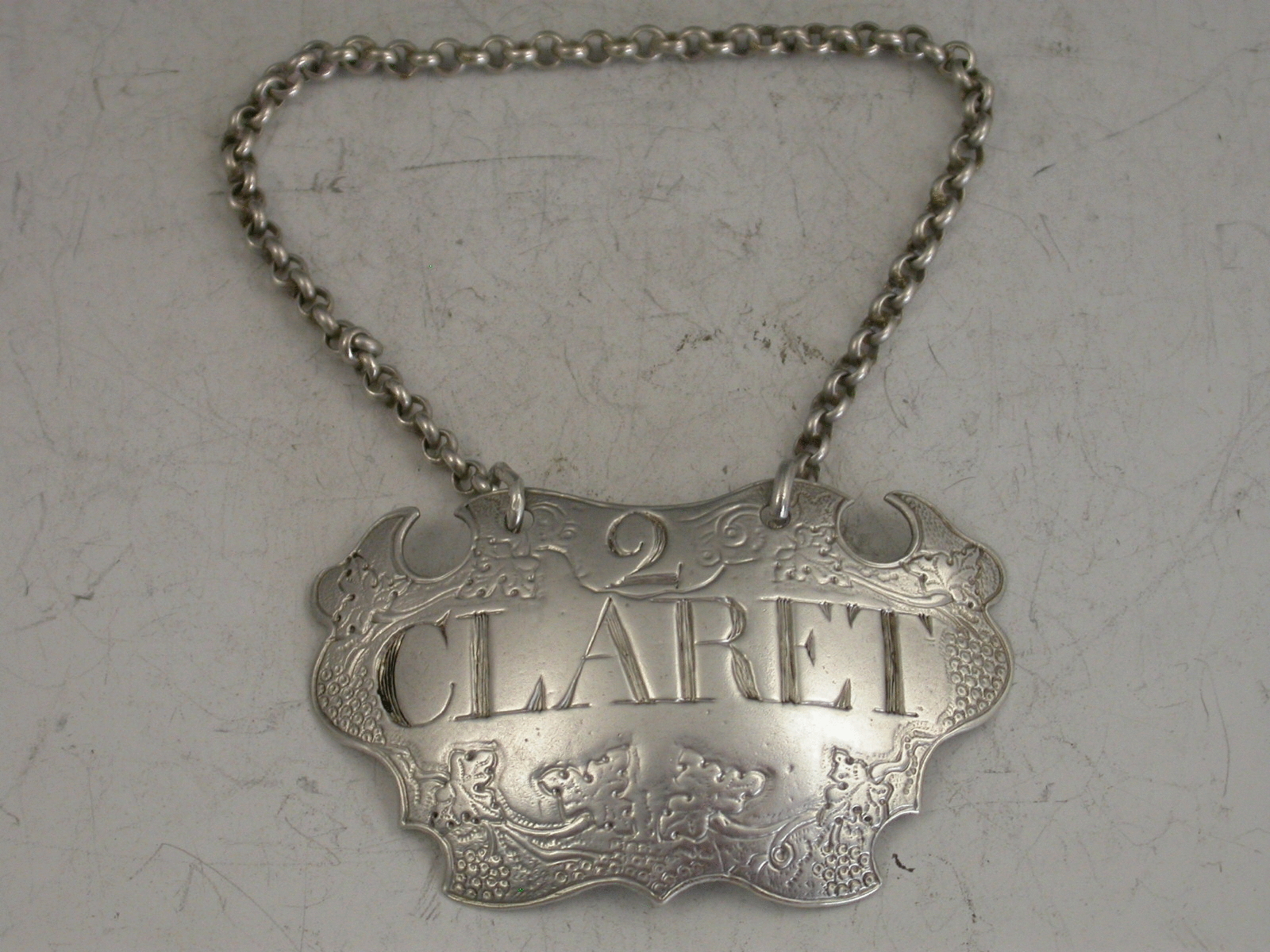 A rare George II silver Wine Label of engraved escutcheon form, decorated with vine leaves and grapes on a matt background, incised for Claret with the number 2 above (for difference).