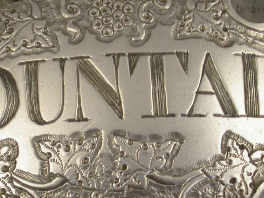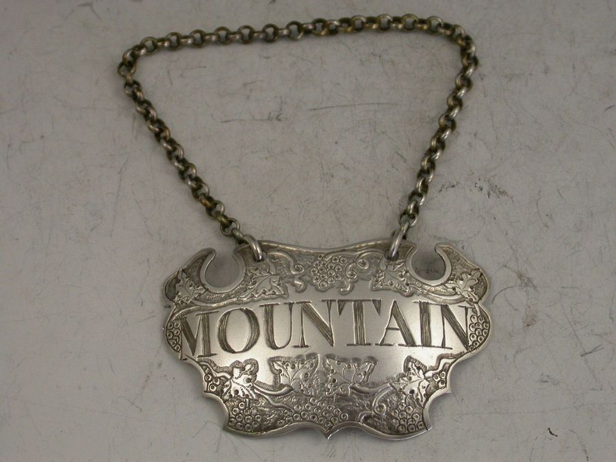 A good George II silver Wine Label of engraved escutcheon form, decorated with vine leaves and grapes on a matt-background, incised for Mountain.