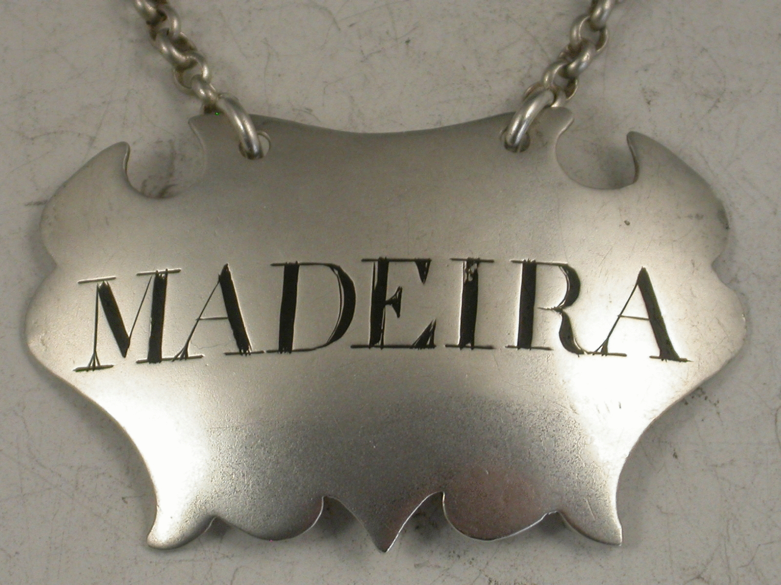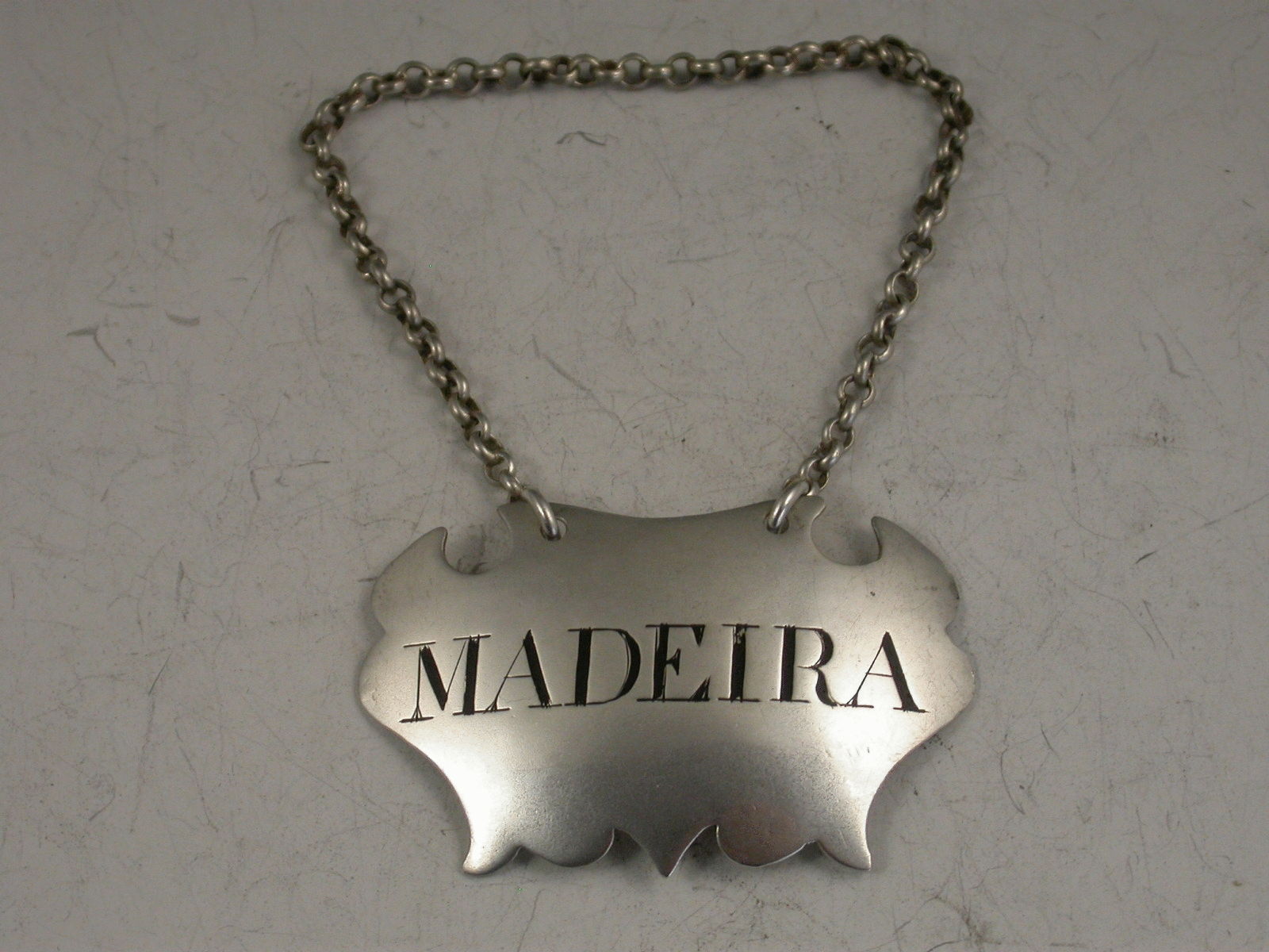 A good George II silver Wine Label of plain escutcheon form incised and niello filled for Madeira.