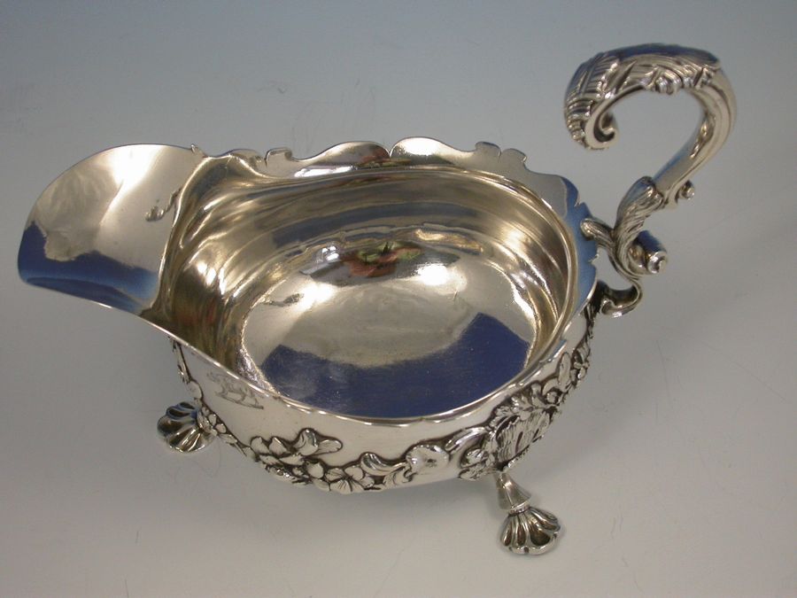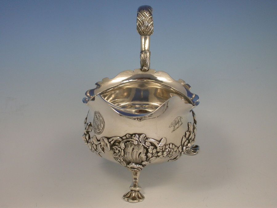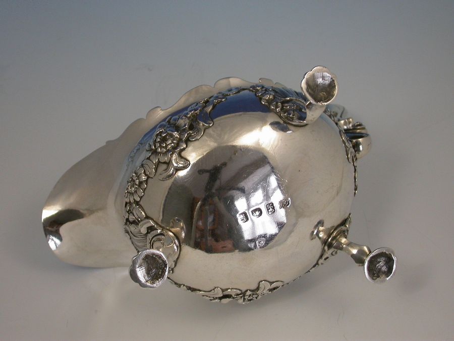 A very fine George II silver Sauce Boat of squat oval form with leaf capped flying scroll handle and cut out shaped rim, the body applied with bands of foliage and flower heads, standing on three scrolled shell feet.