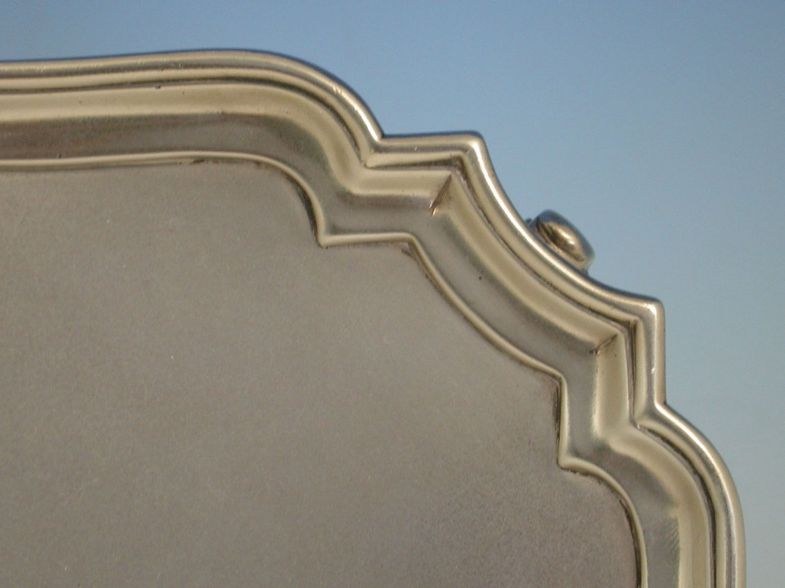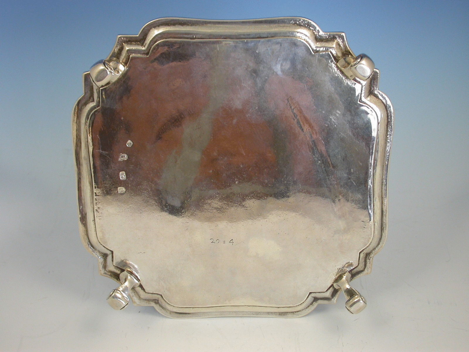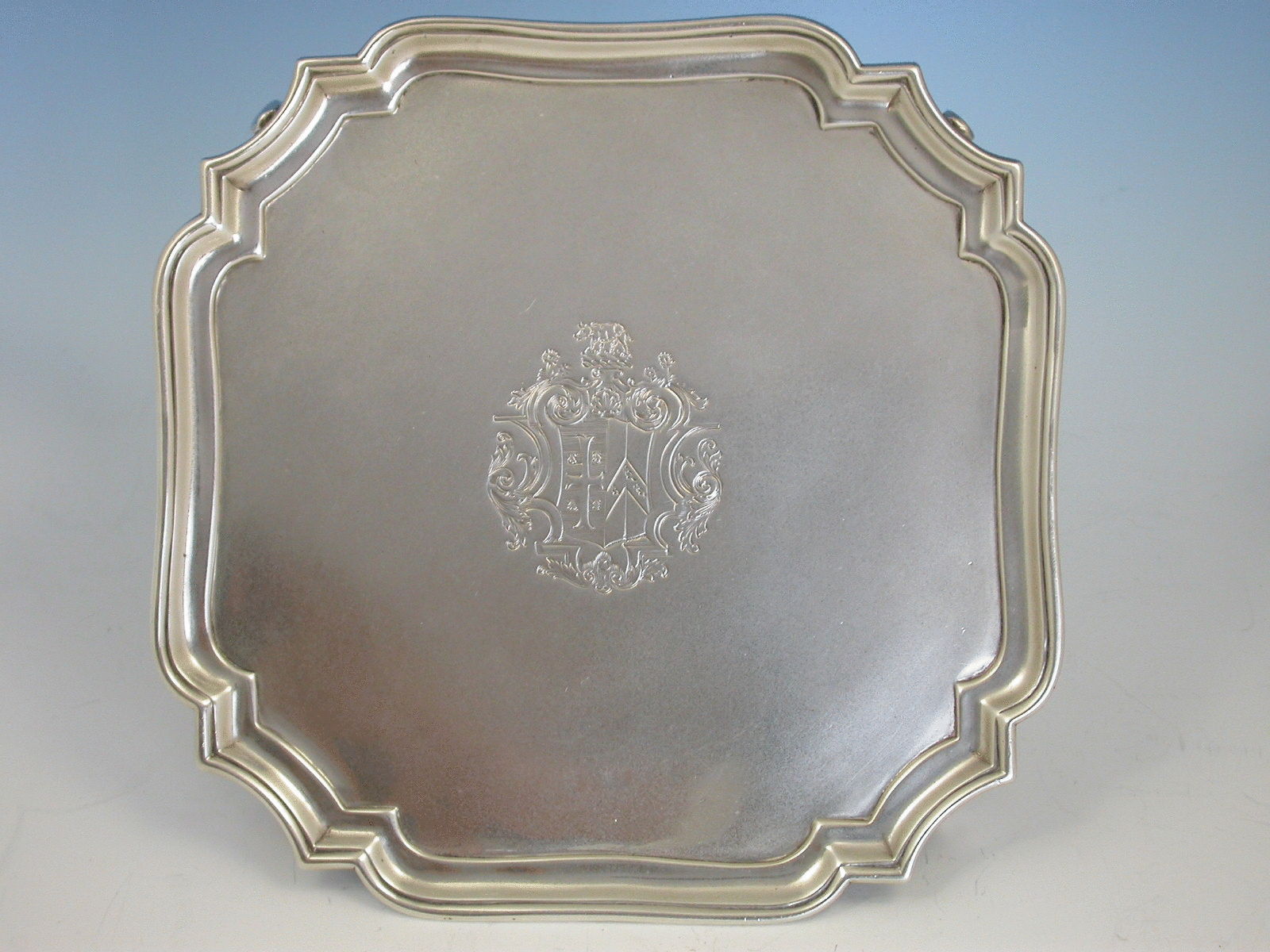 A fine quality early George II silver Waiter of shaped square form with moulded border, standing on four scrolled feet and engraved with a contemporary Coat of Arms and Crest.