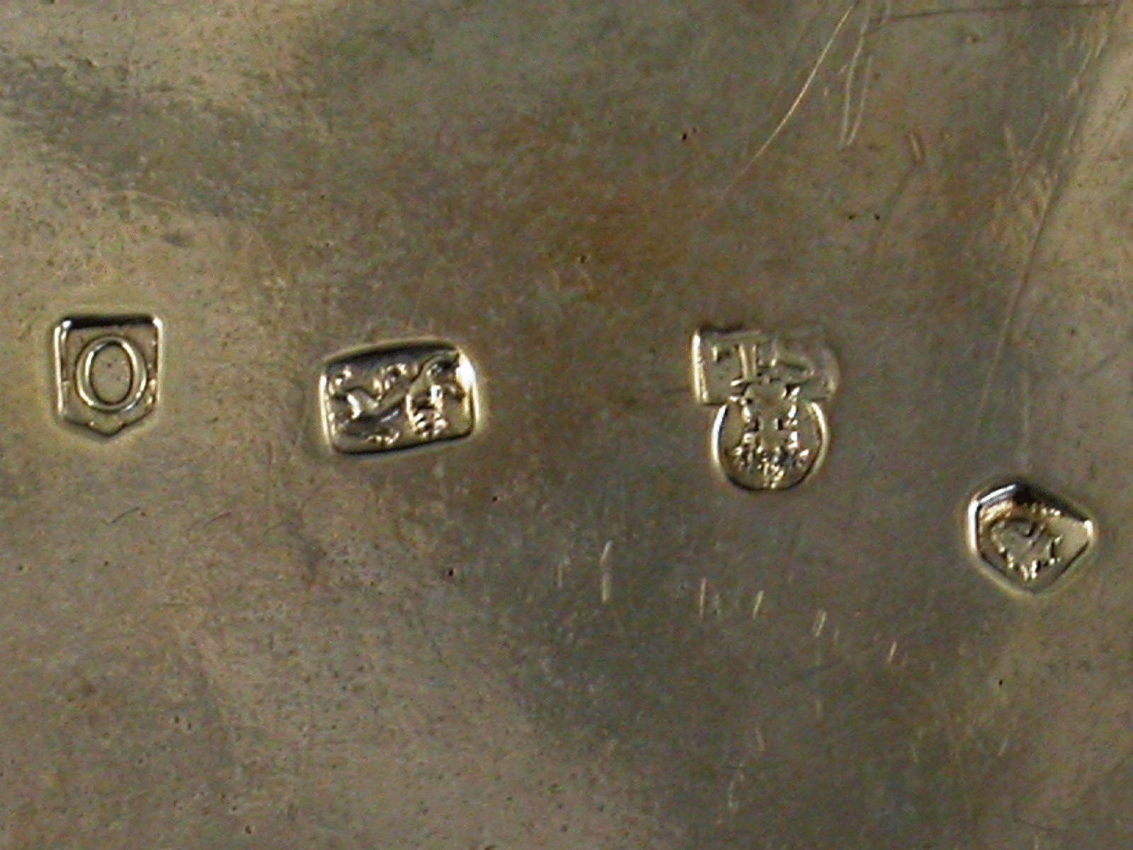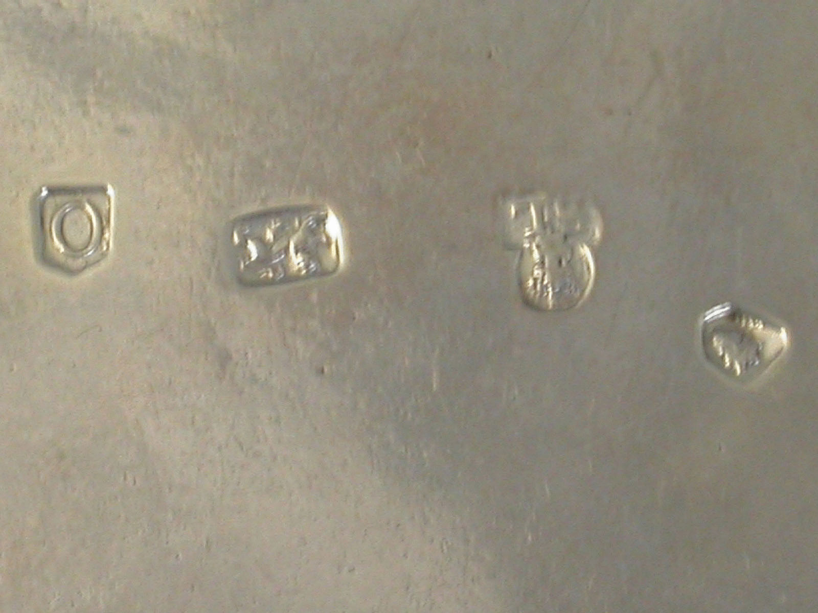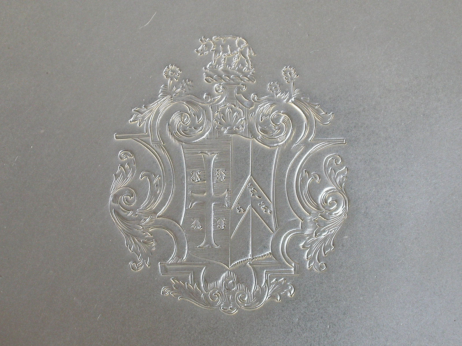 A fine quality early George II silver Waiter of shaped square form with moulded border, standing on four scrolled feet and engraved with a contemporary Coat of Arms and Crest.