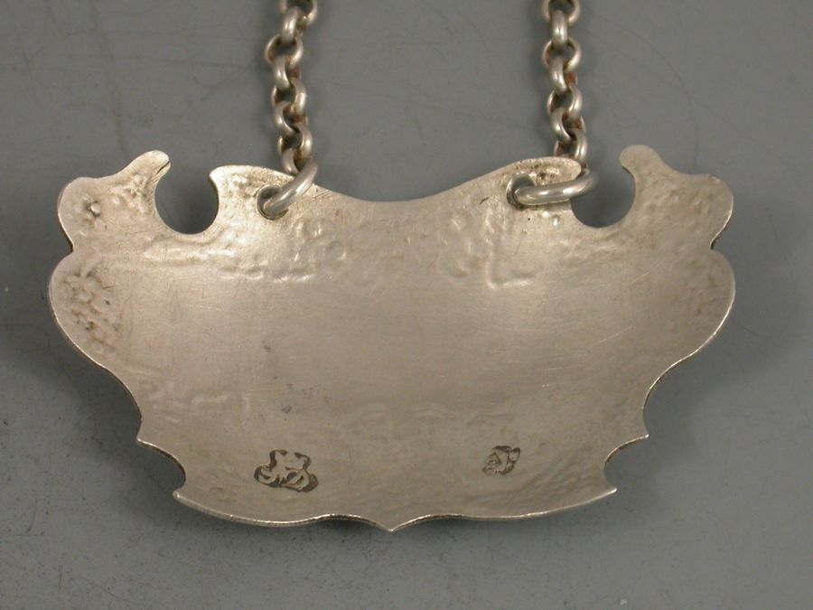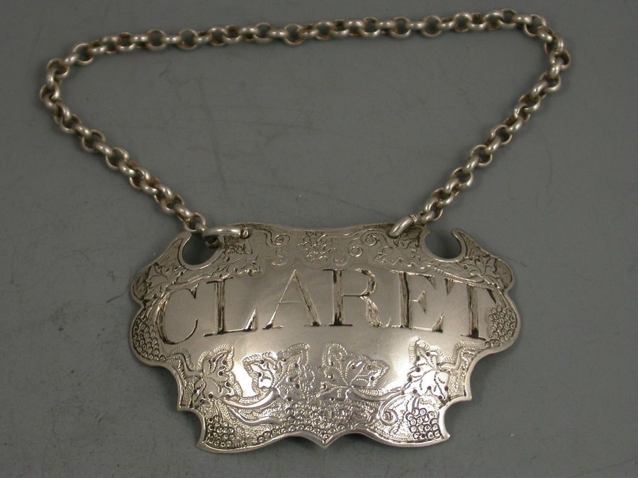 A good George II silver Wine Label of chased escutcheon form incised for Claret between vine leaves and grapes.
