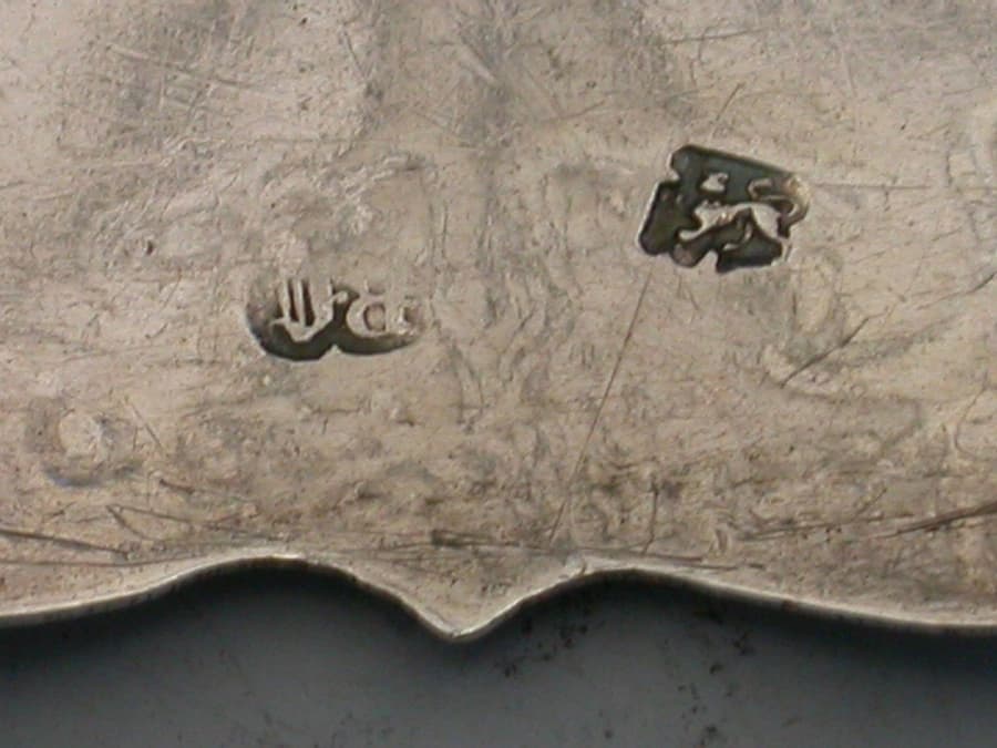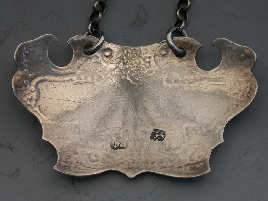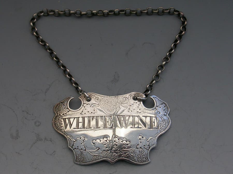 A good George II silver chased escutcheon Wine Label, incised for White Wine.
