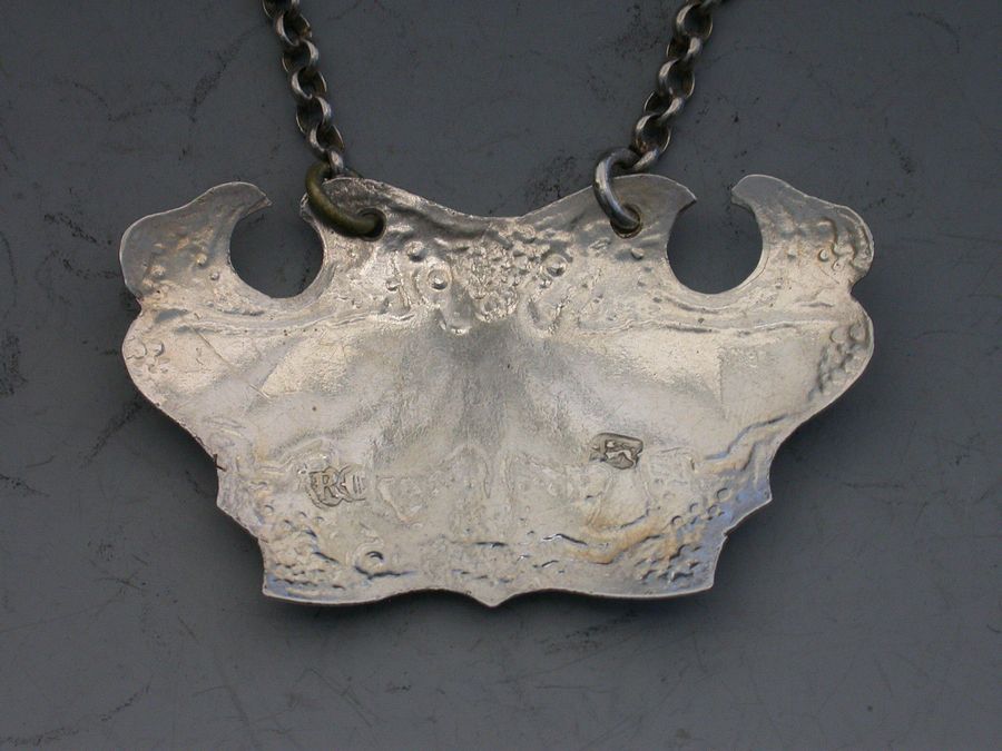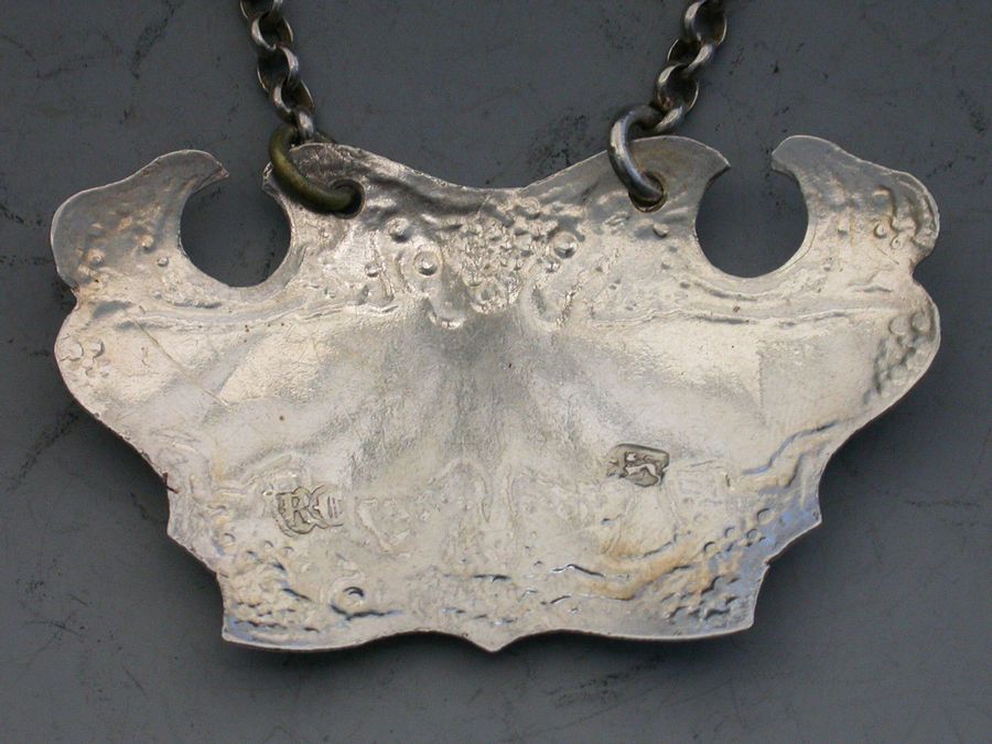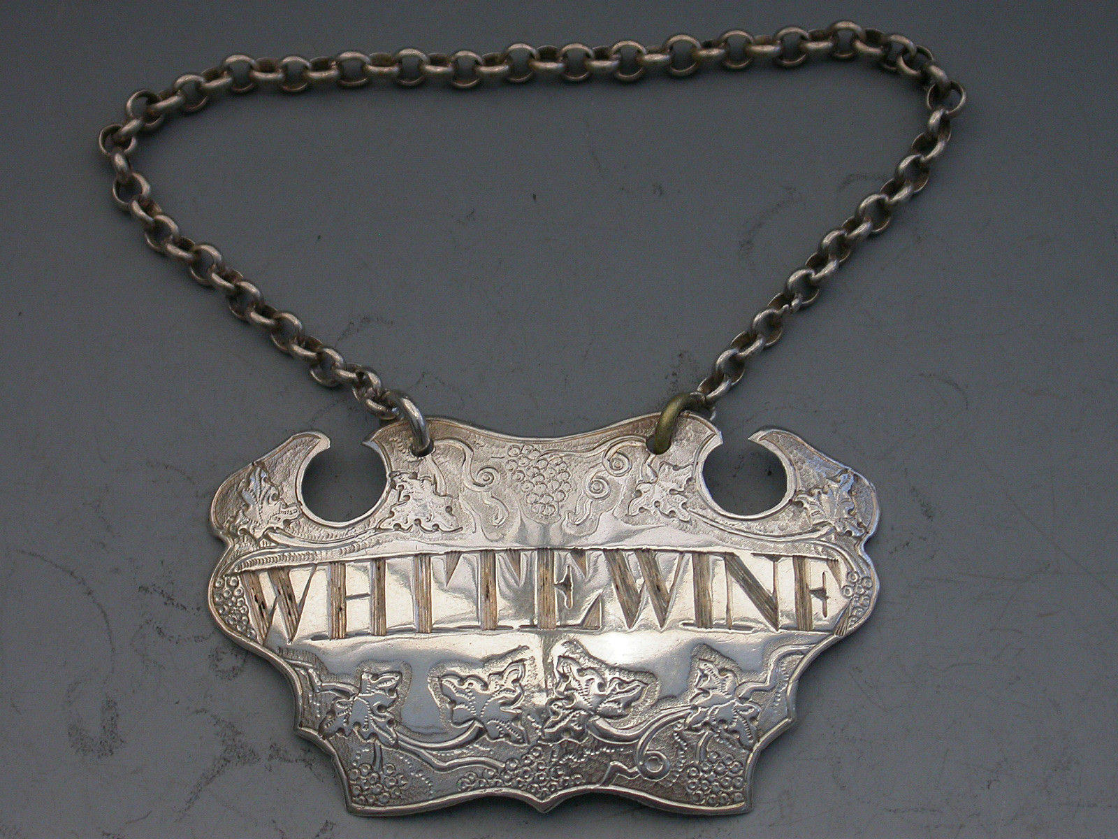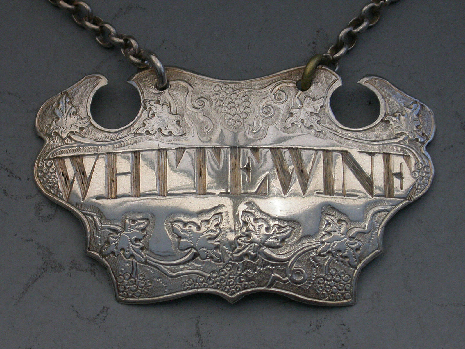 A good George II silver chased escutcheon Wine Label, incised for White Wine.