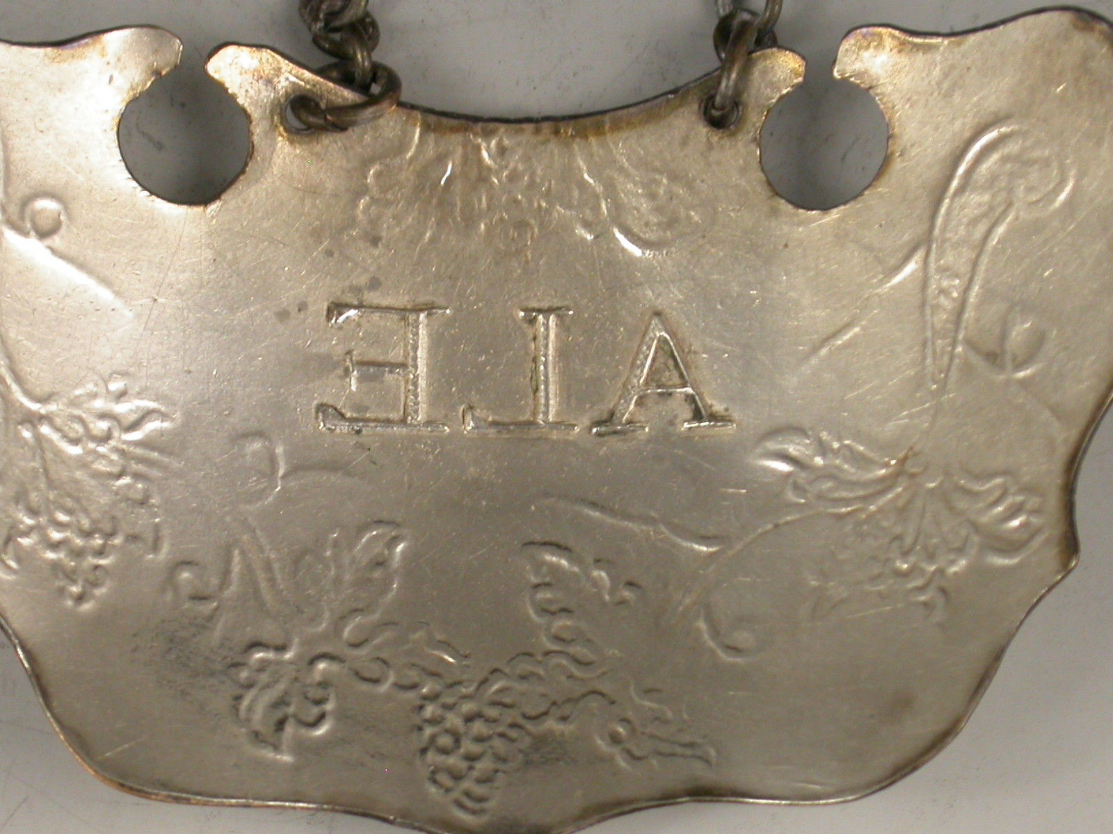 A rare mid 18th century die-stamped Old Sheffield plate Wine Label of 'copper back' escutcheon form decorated with vine leaves, grapes and tendrils, incised for White.