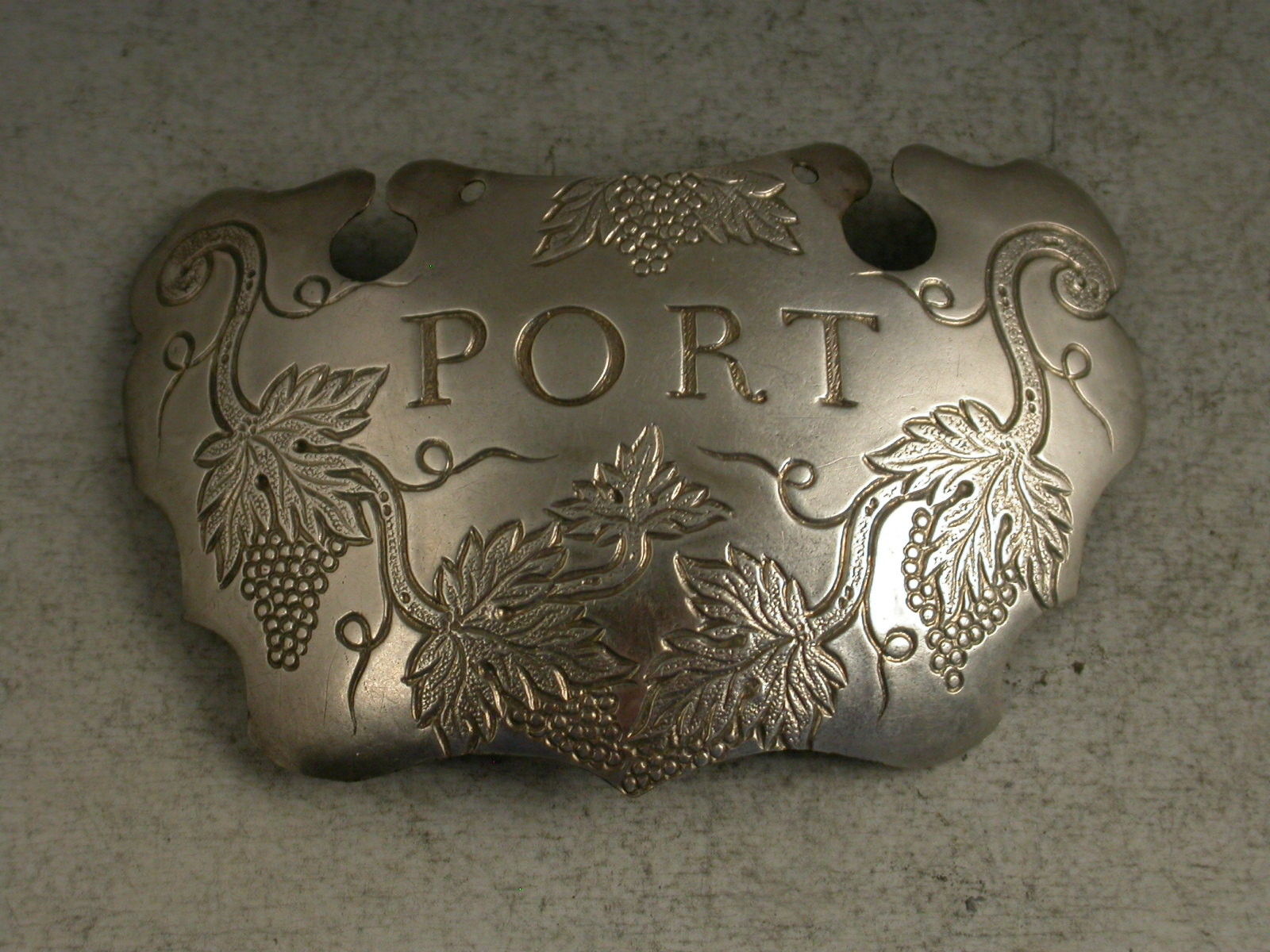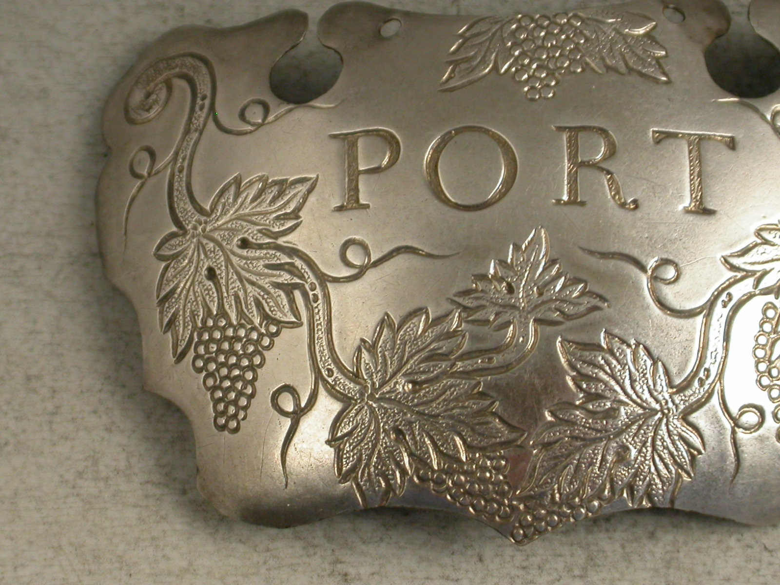 A rare mid 18th century die-stamped Old Sheffield Plate Wine Label of copper-back escutcheon form decorated with vine leaves and grapes, stamped for Port.