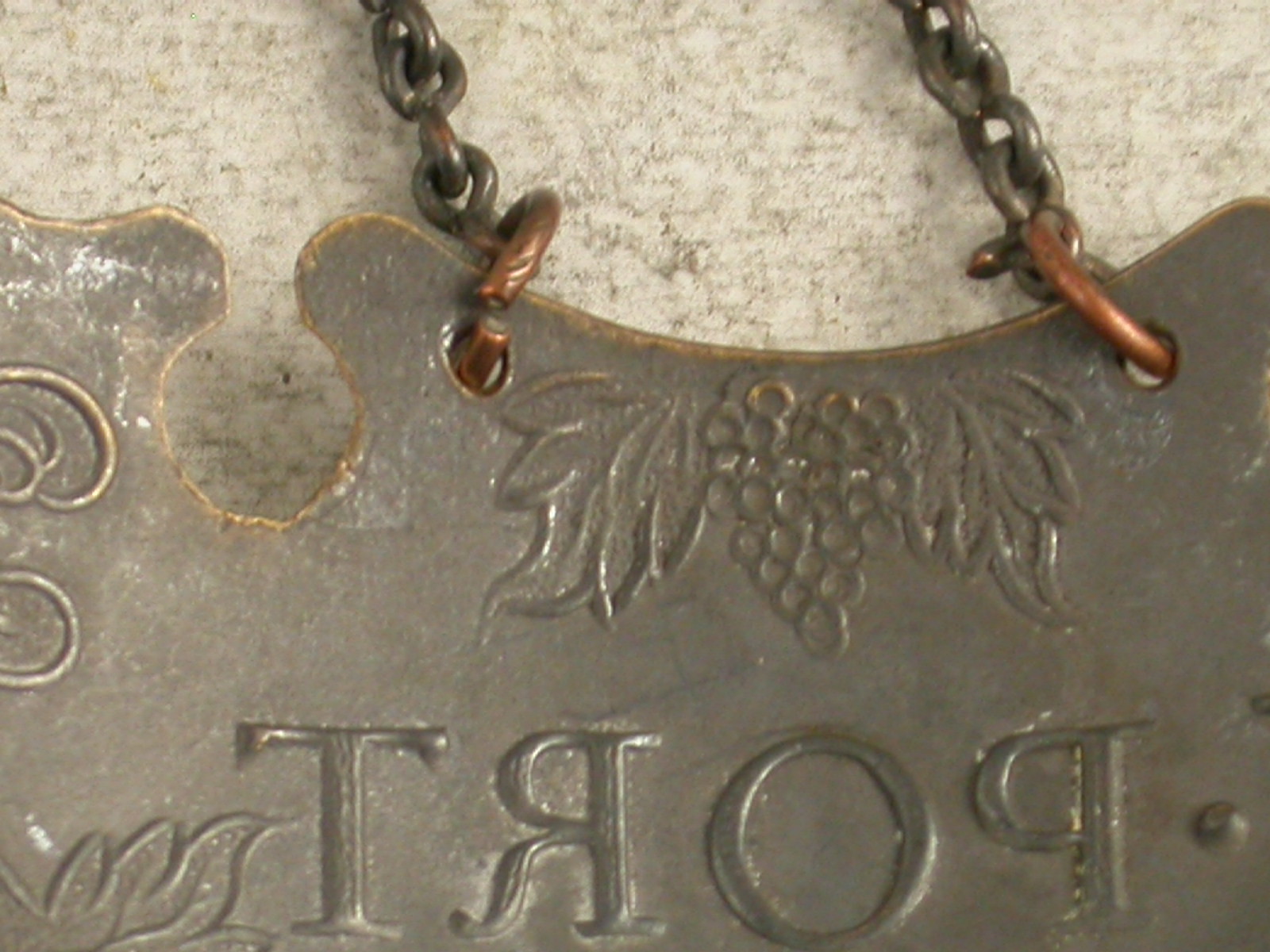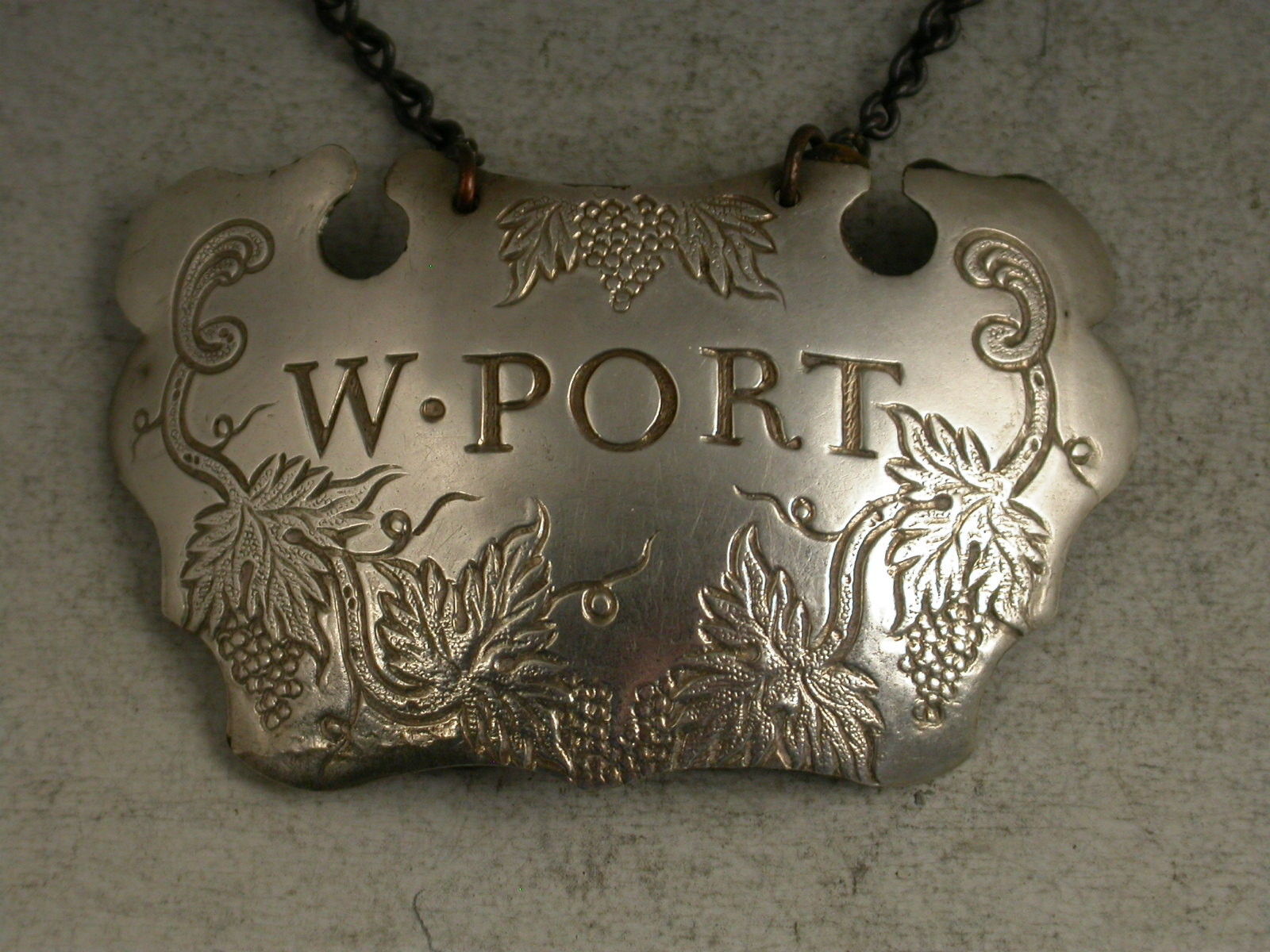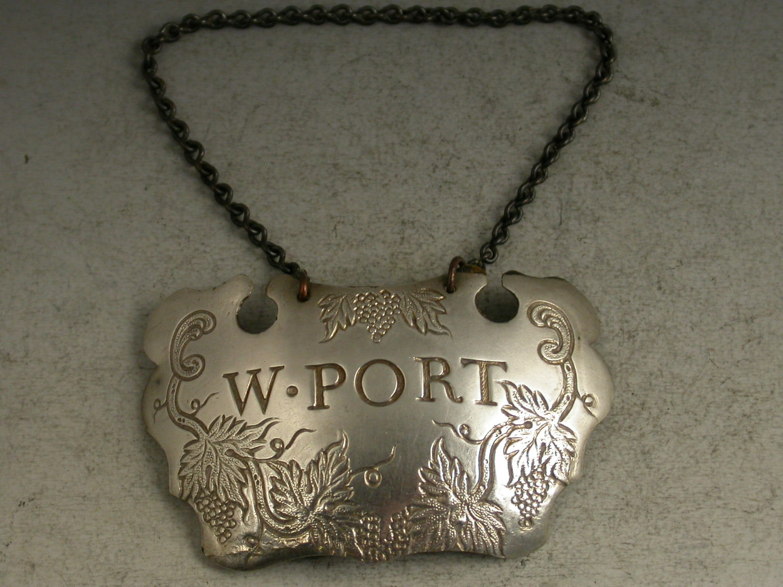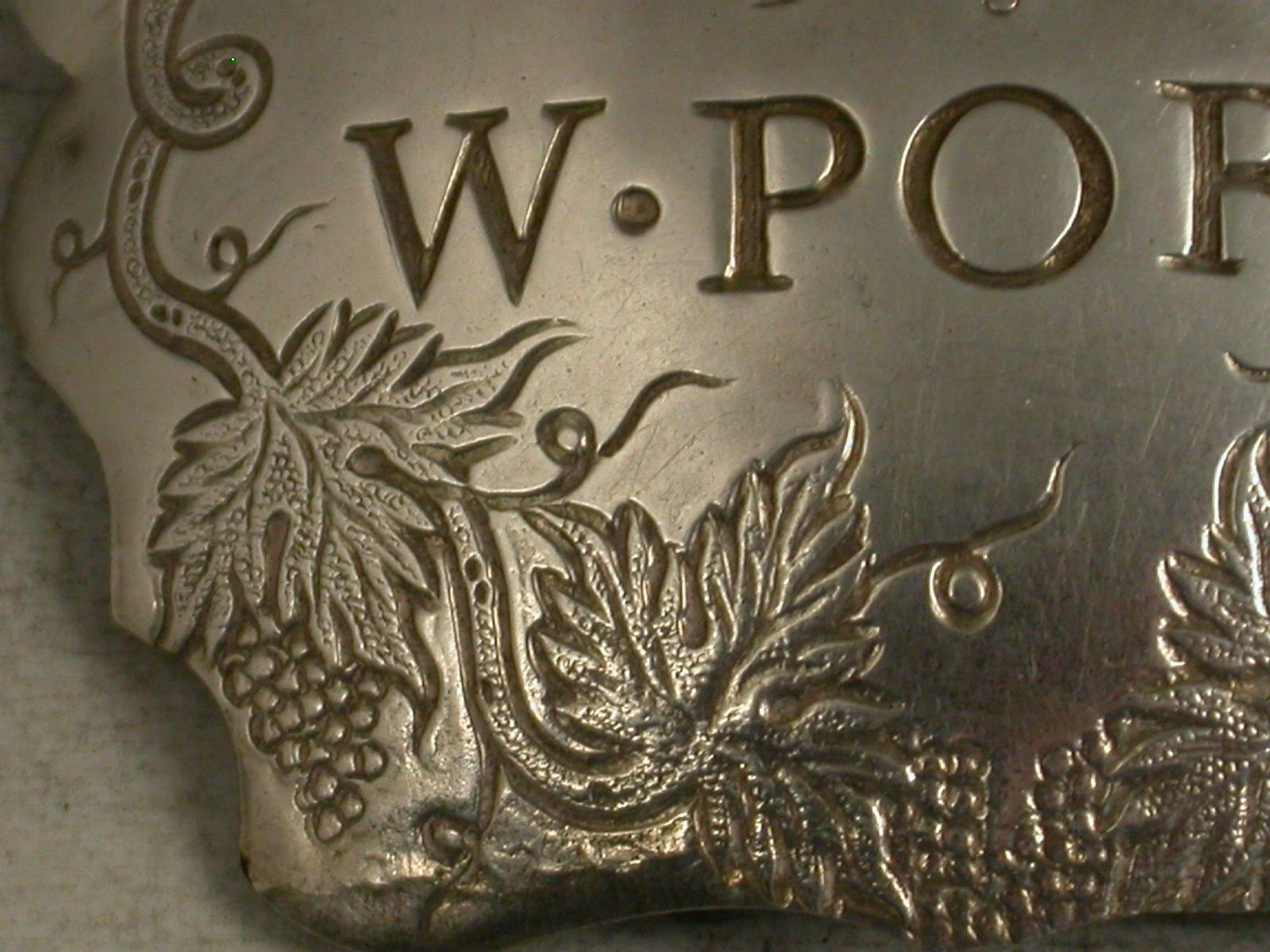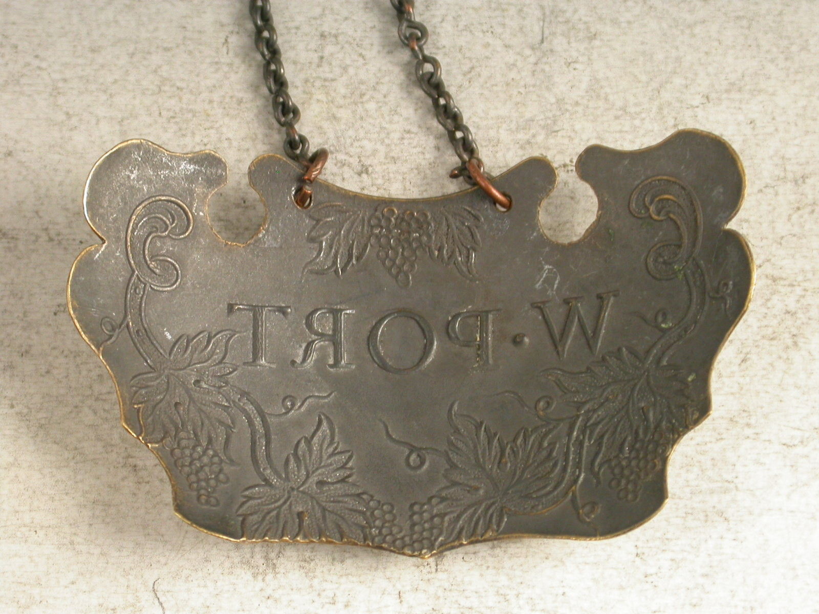 A rare mid 18th century die-stamped Old Sheffield Plate Wine Label of copper-back escutcheon form, decorated with vine leaves and grapes, stamped for W*Port.