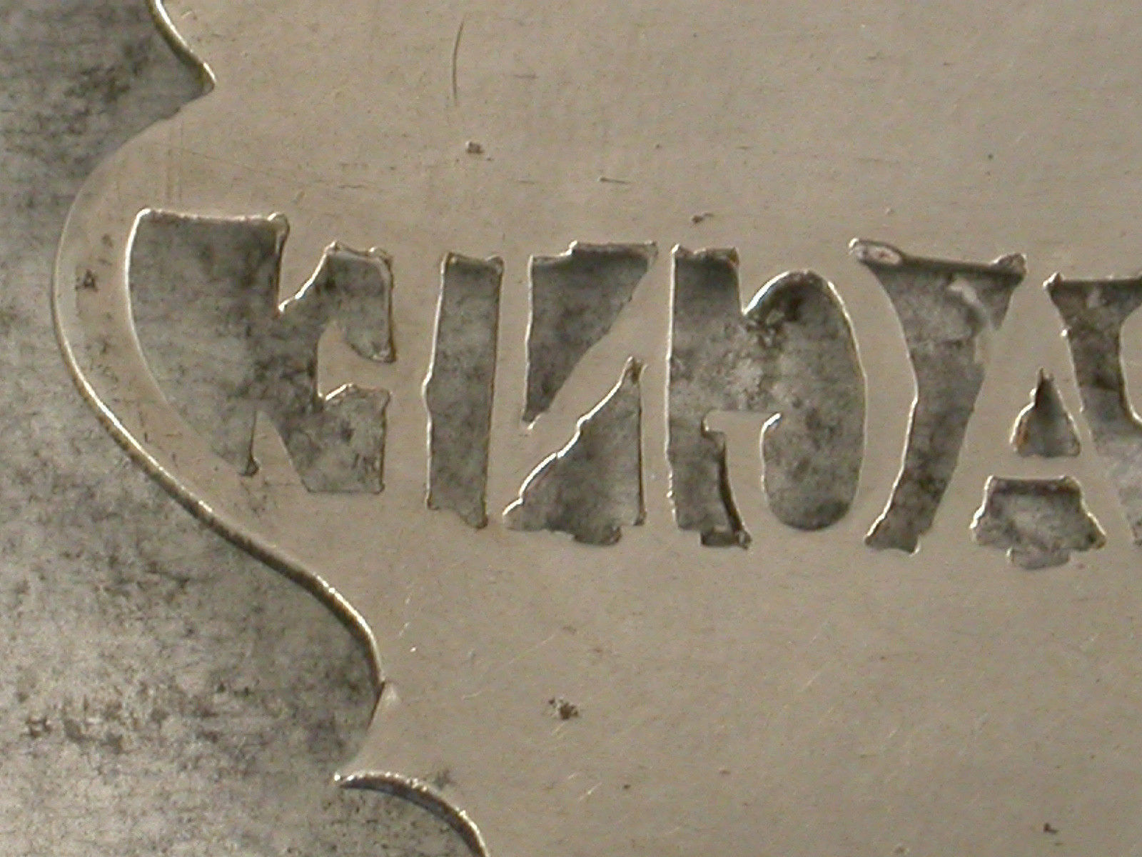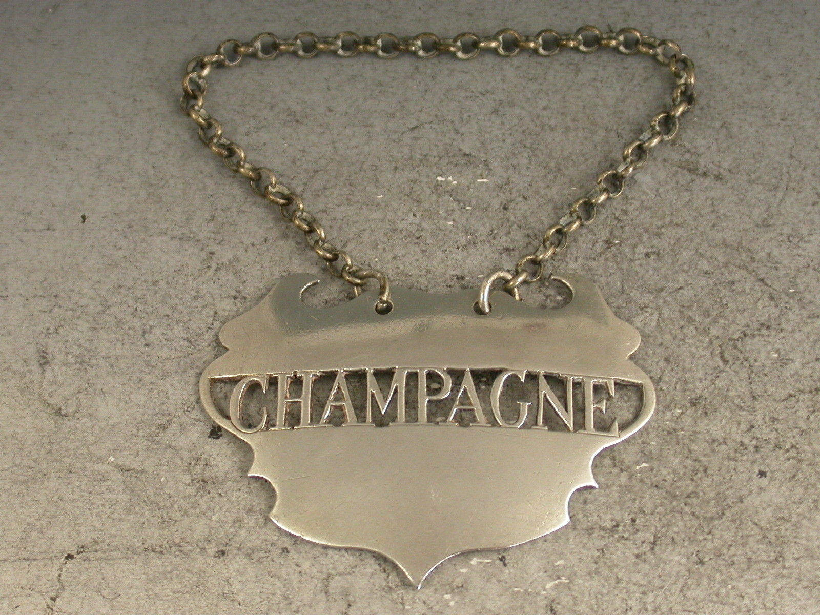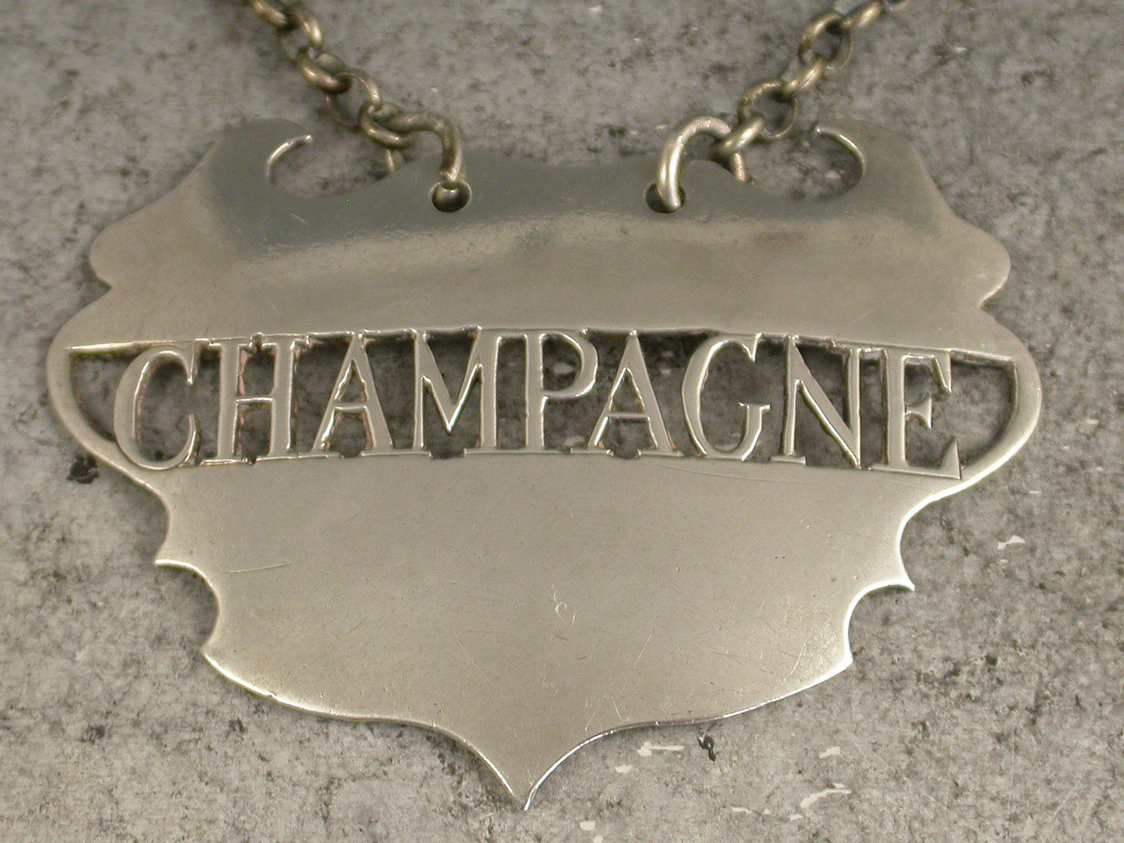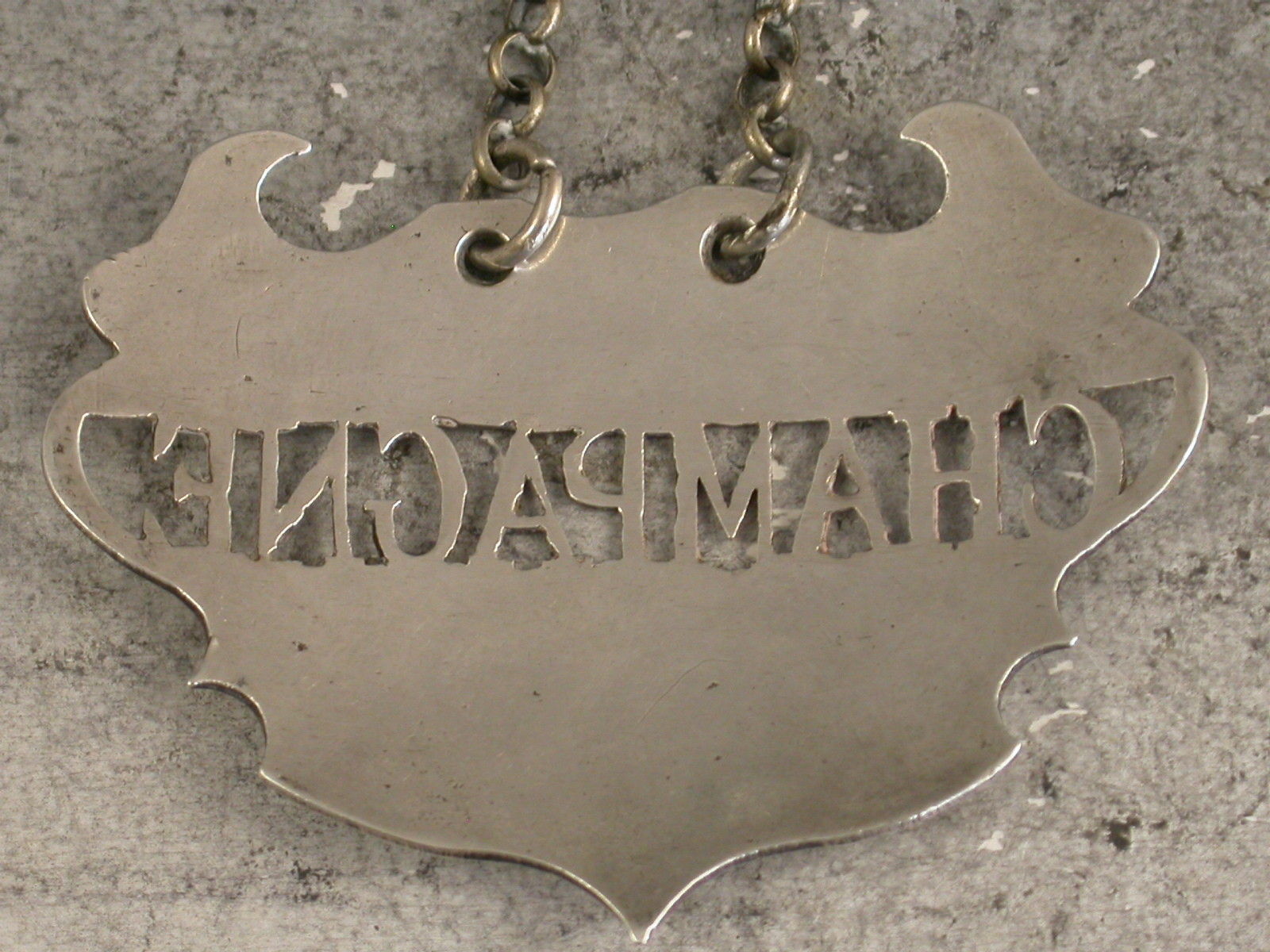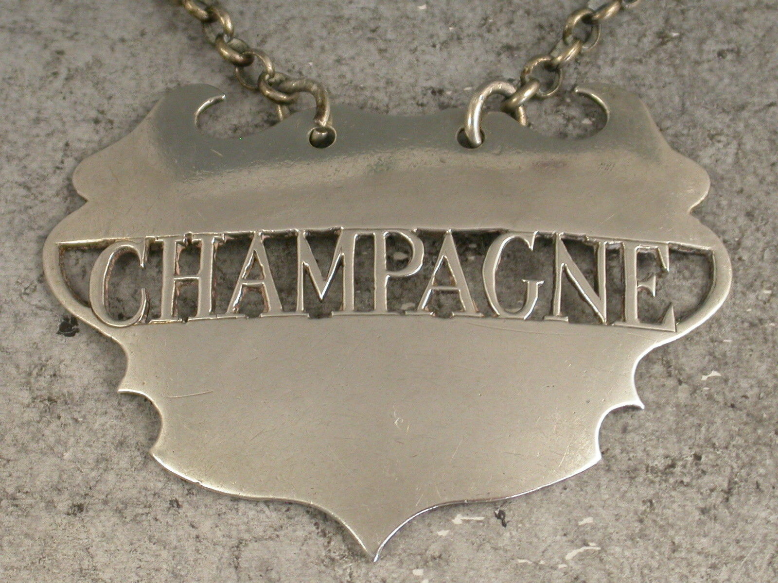 A fine and rare 18th century silver Wine Label of a distinctive and rare design, the plain escutcheon and pierced out name panel for Champagne, the background to the name having been removed rather than the lettering. This design has only been recorded by Sandilands Drinkwater.