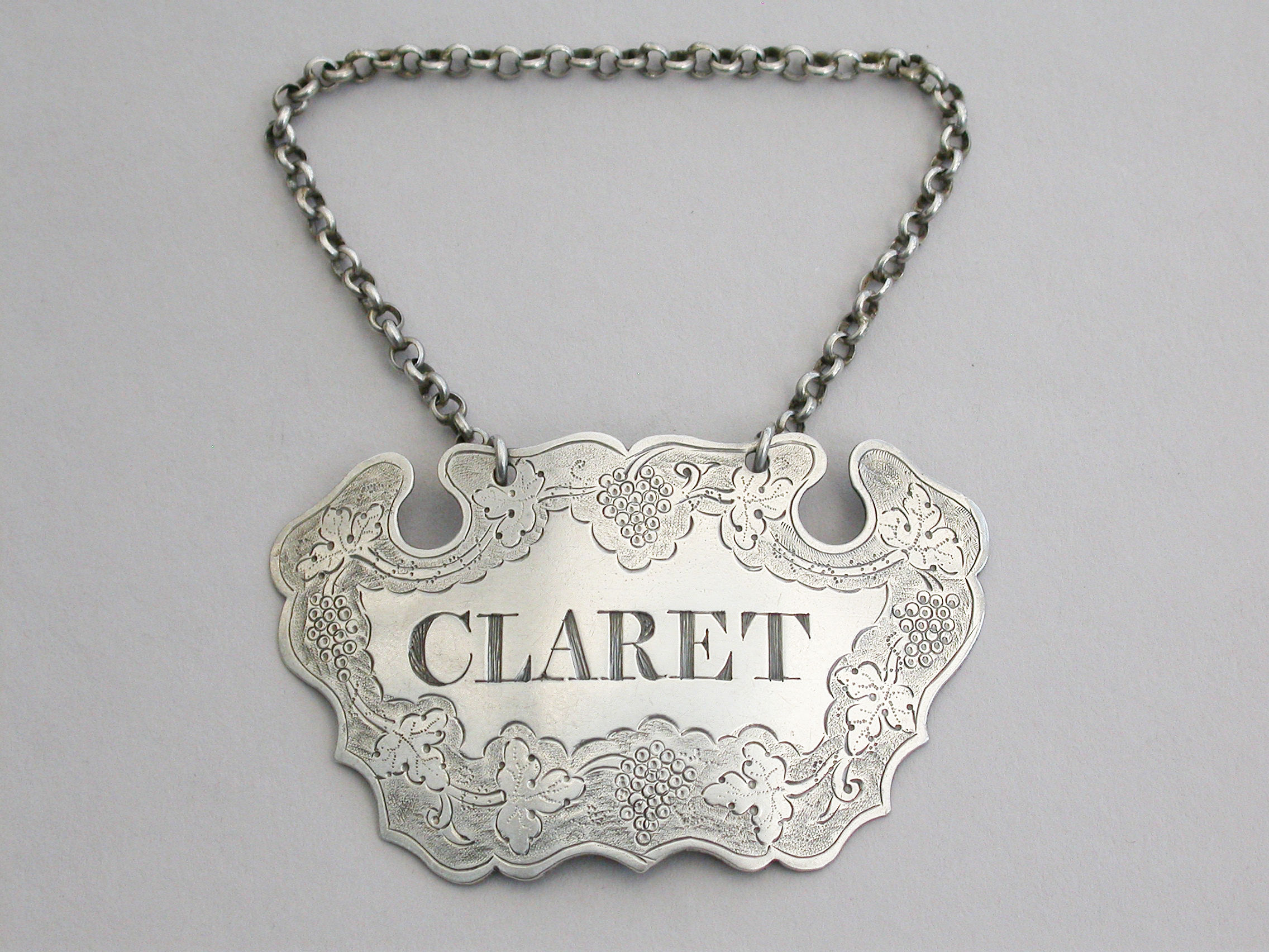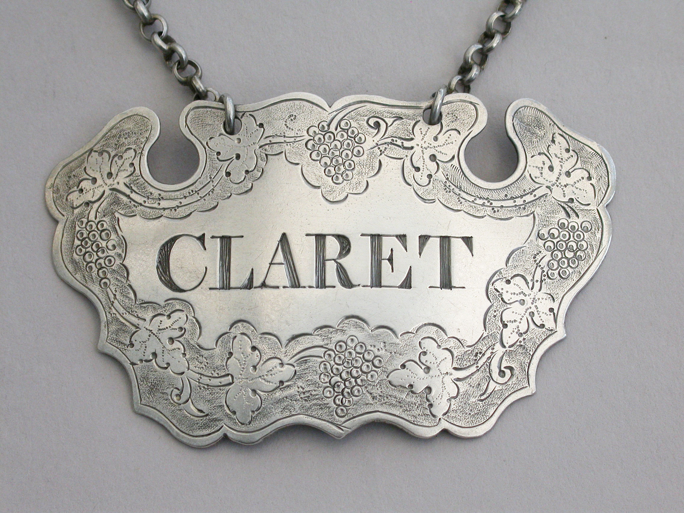 An unusual mid 18th century silver chased escutcheon Wine Label of large size and unusual conformation, incised for Claret within a border chased with vine leaves and grapes.
