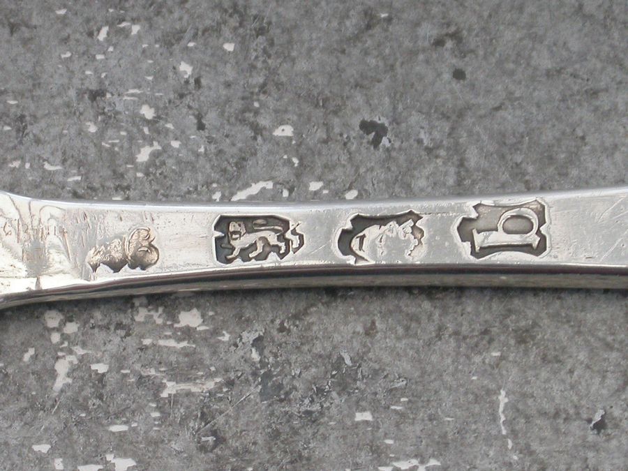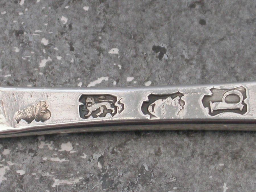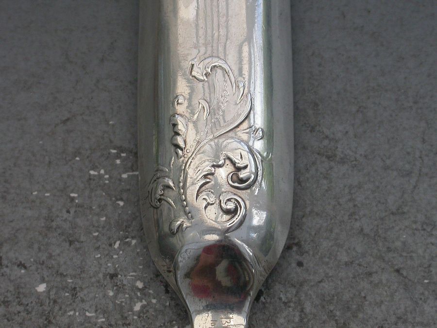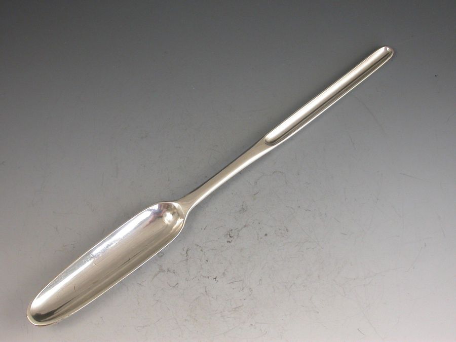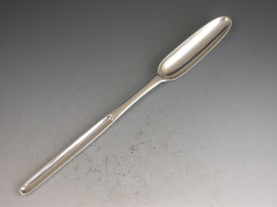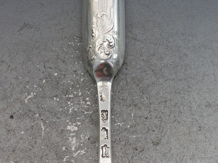 A rare George II silver 'fancy back' Marrow Scoop of standard form with two bowls, the larger bowl chased with a foliate scroll to the reverse.