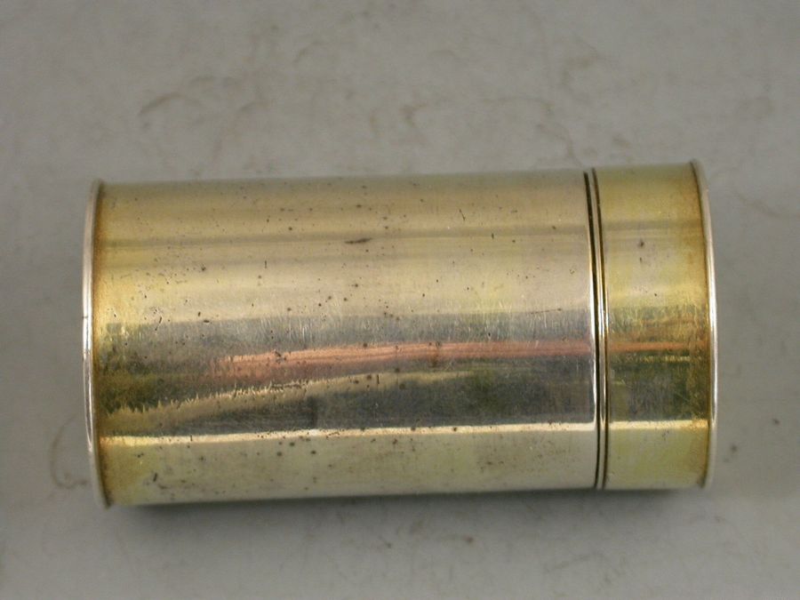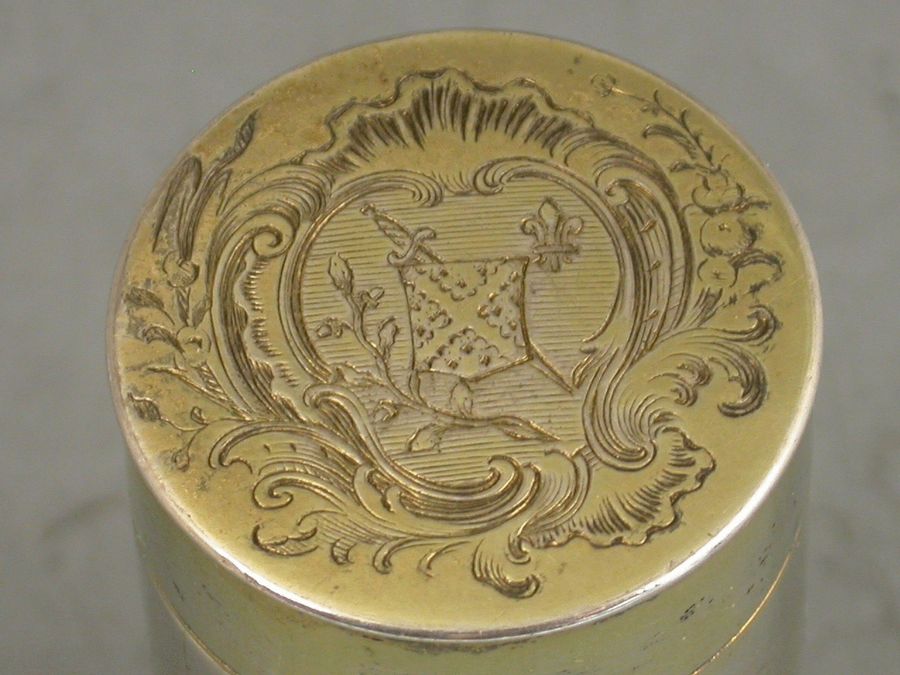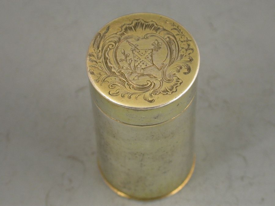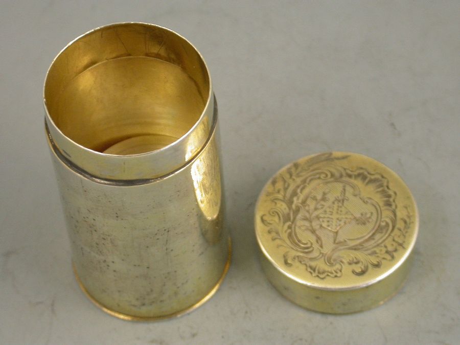 A fine George II silver gilt Counter Box of plain cylindrical form with pull off cover, engraved with the Arms of Garnier. Complete with thirteen Mother of Pearl counters.