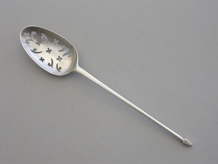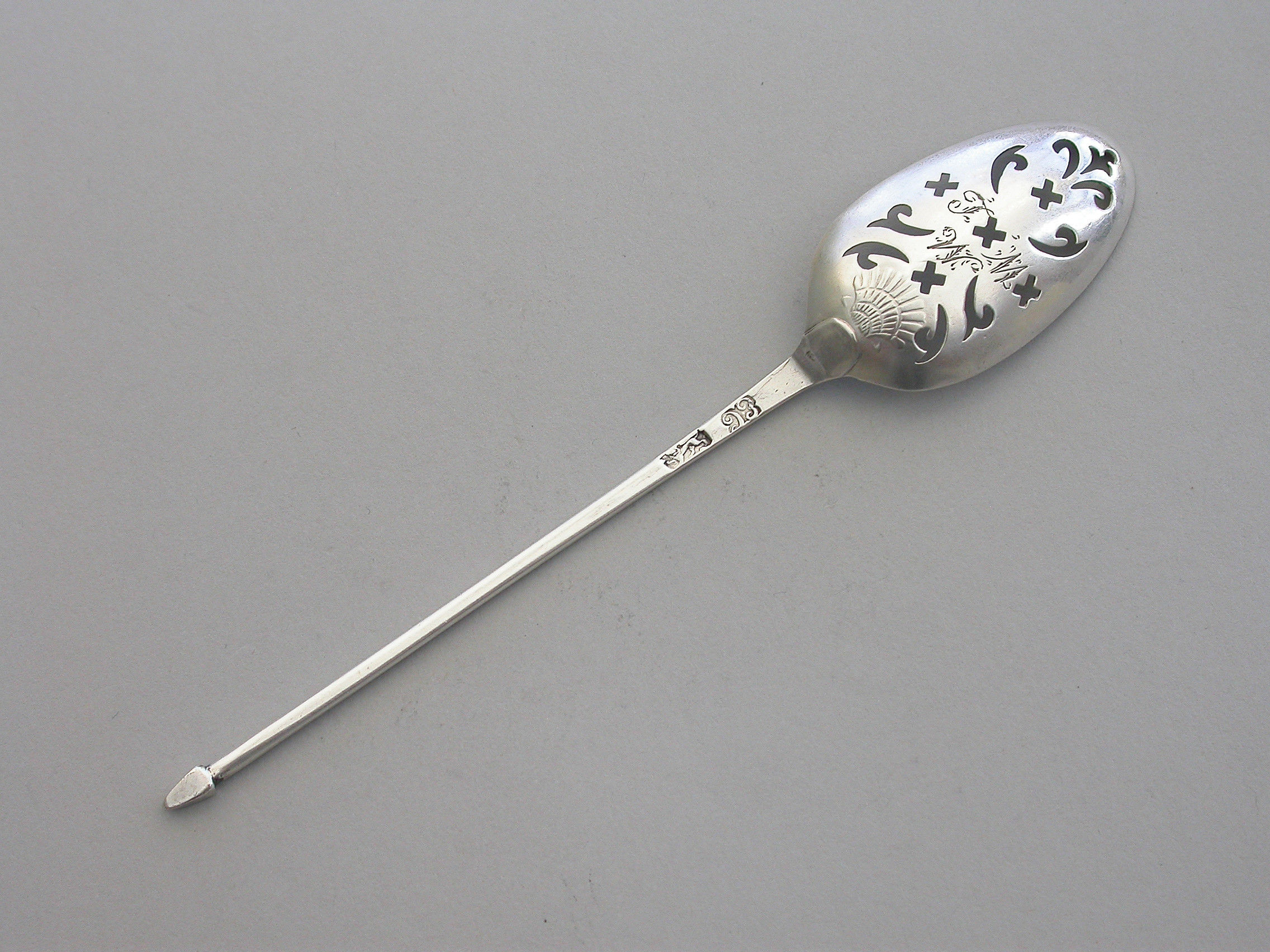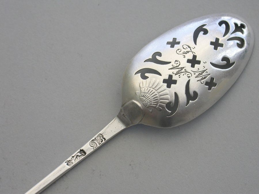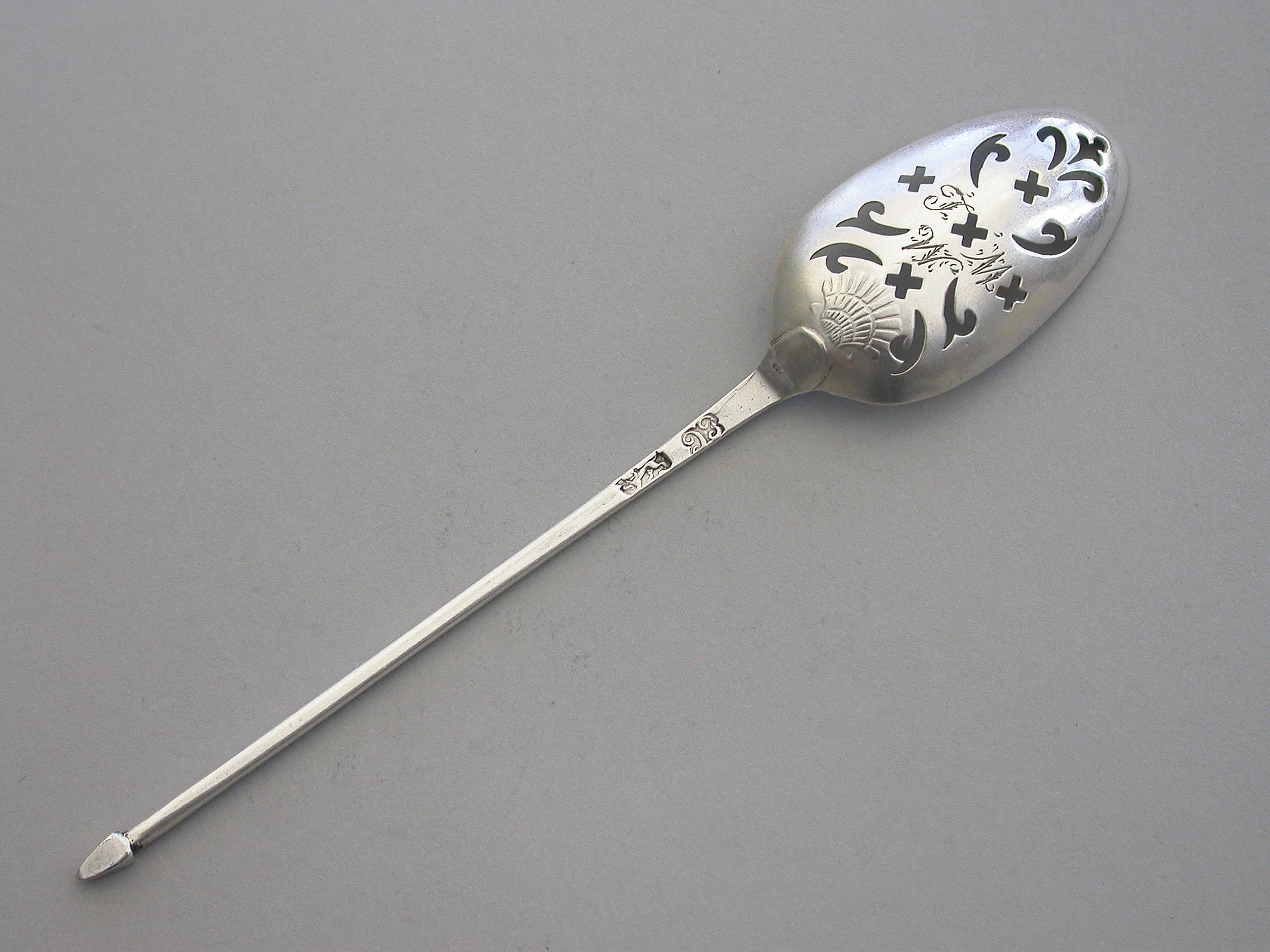 A good George II silver shell back Mote Spoon, the plain tapering handle terminating in a diamond point finial, the oval bowl pierced with scrolls and crosslets and with a raised shell heel. Engraved with contemporary initials 'JMW'.