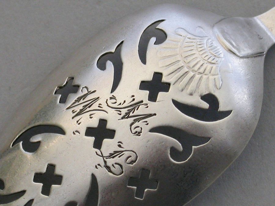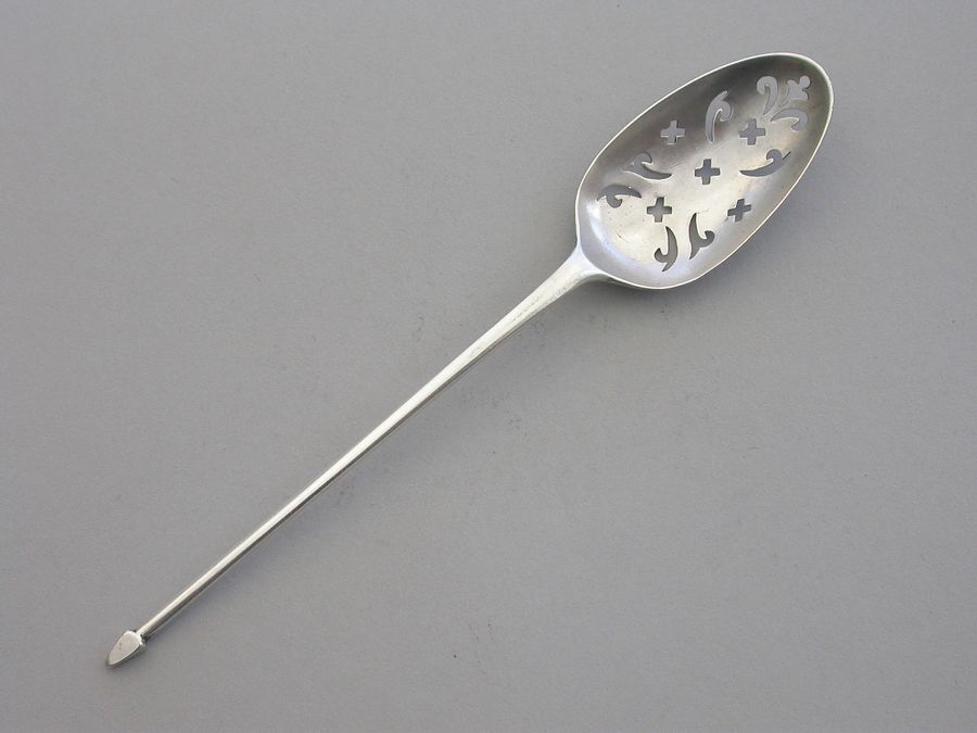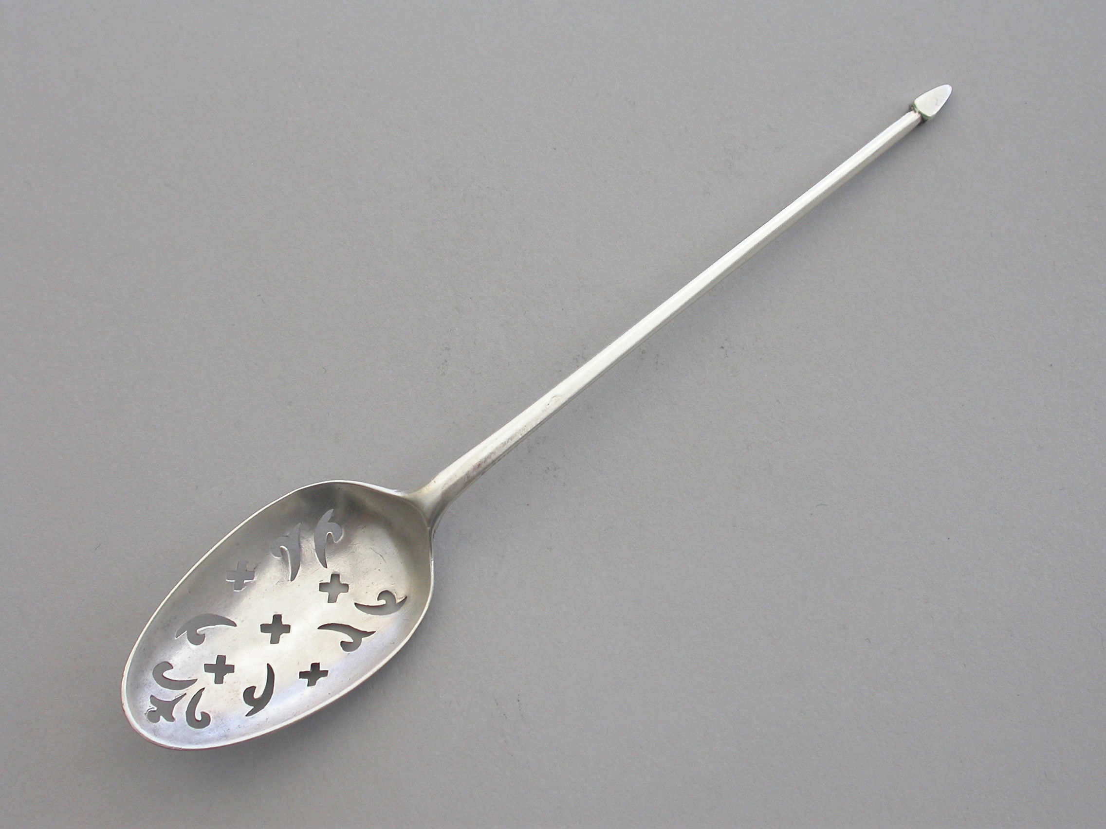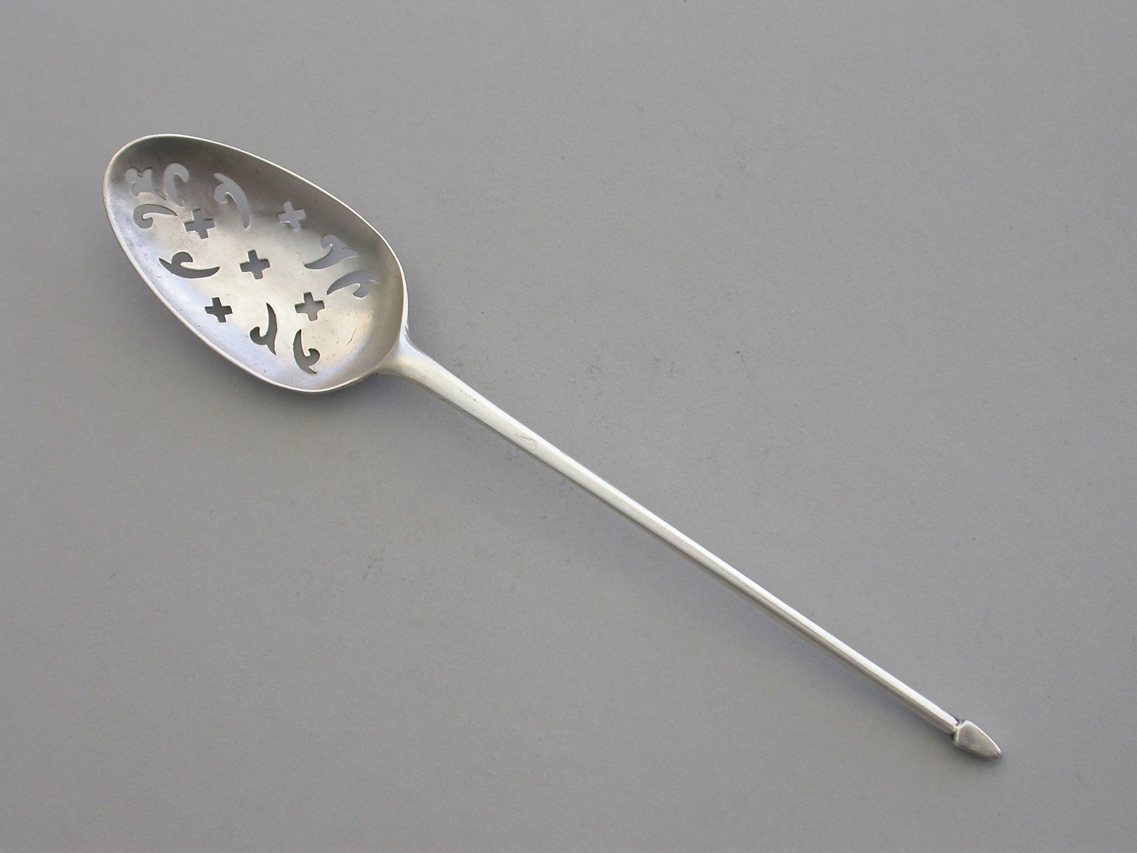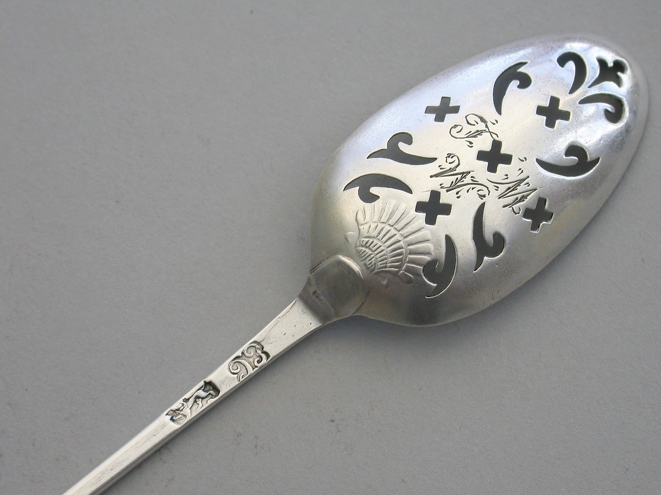 A good George II silver shell back Mote Spoon, the plain tapering handle terminating in a diamond point finial, the oval bowl pierced with scrolls and crosslets and with a raised shell heel. Engraved with contemporary initials 'JMW'.