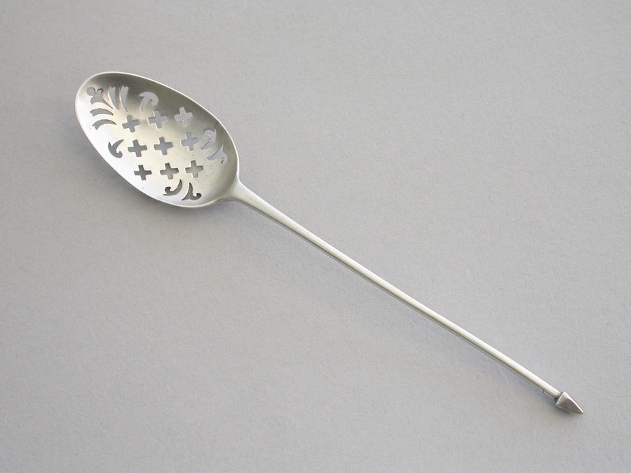 A mid 18th century silver Mote Spoon, the plain tapering handle with diamond point finial, the bowl pierced with crosslets and scrolls and chased with a shell at the base. Engraved with a contemporary initial 'S'.