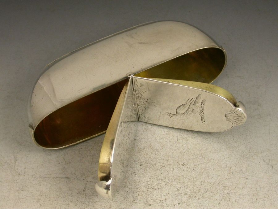A fine quality George II silver twin compartment Snuff Box, of elongated oval form with central concealed hinge, one cover engraved with a crest the other with initials, an engraved thumb-piece to either end, the silver gilt interiors struck with two makers marks only - ""I.W"" (in Roman Capitals) and ""I.W"" (in script).