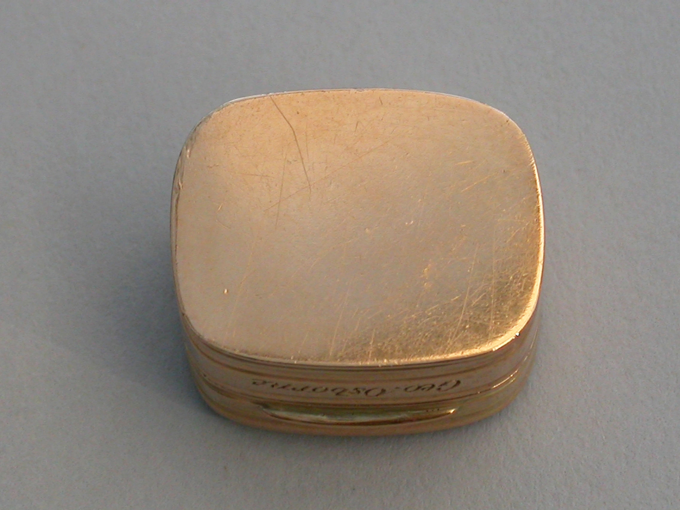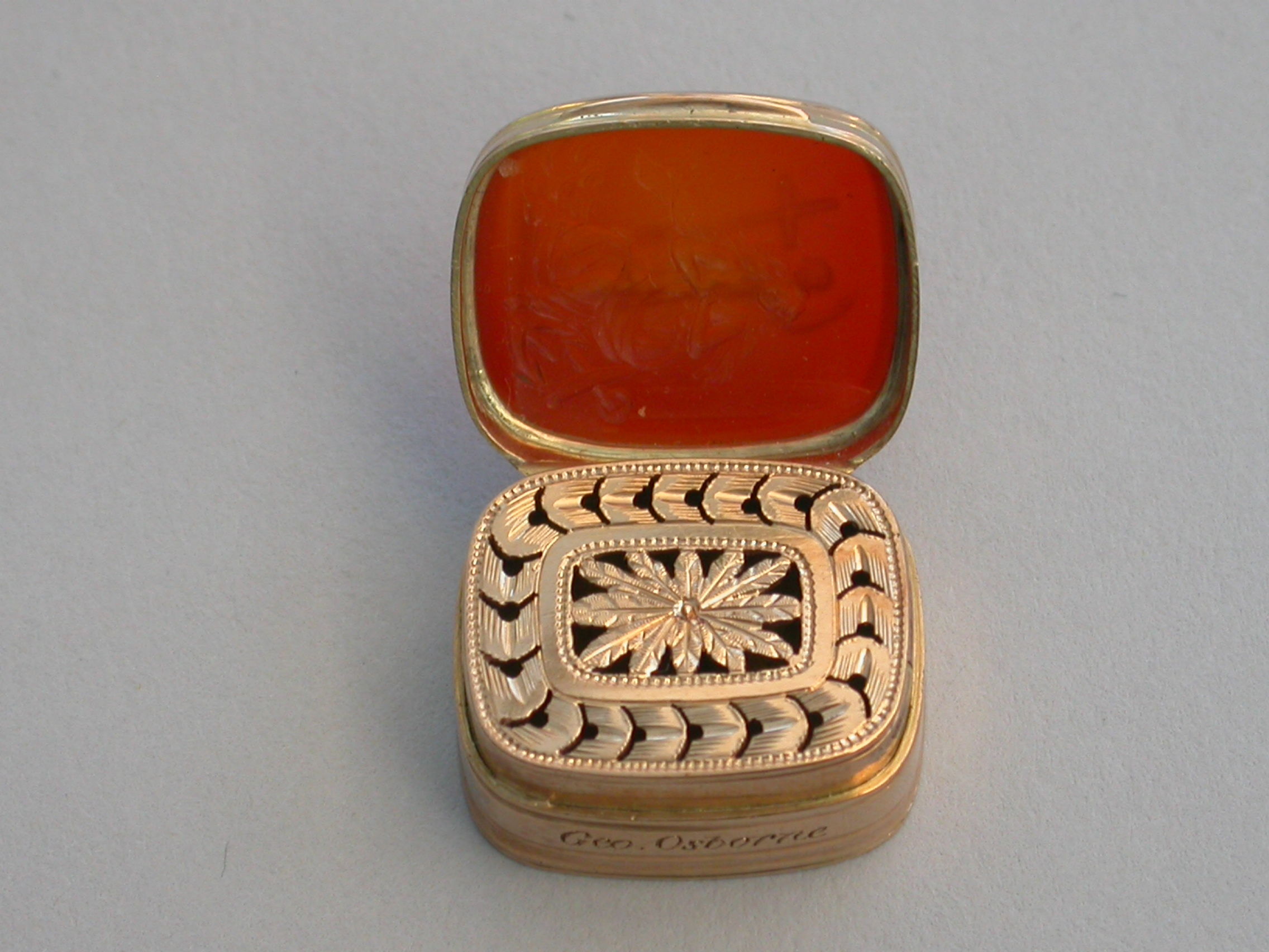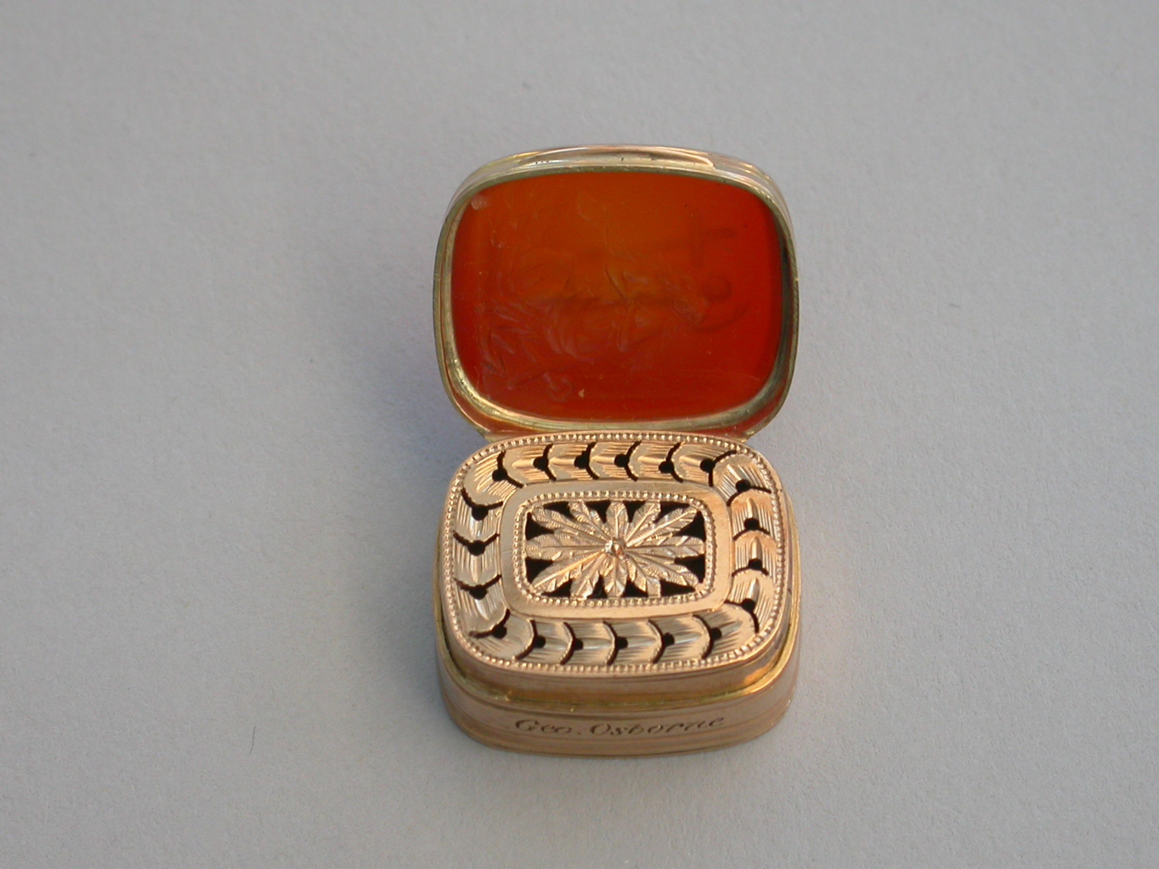 A very fine small George III 18 carat gold (tested) Vinaigrette of shaped rectangular form with reeded sides, the lid inset with a Carnelian carved with FAITH on the outside and HOPE on the inside. The finely pierced and engraved grille with central framed flower head. ""Geo. Osborne"" engraved to the front.