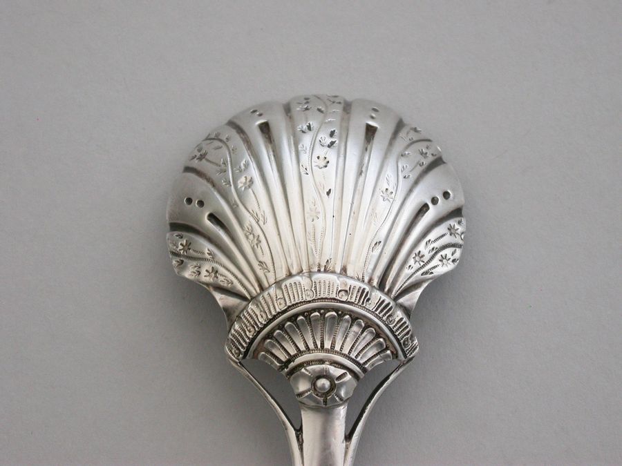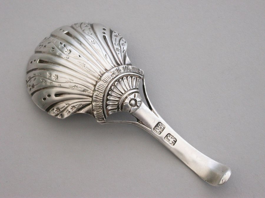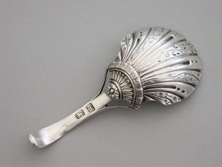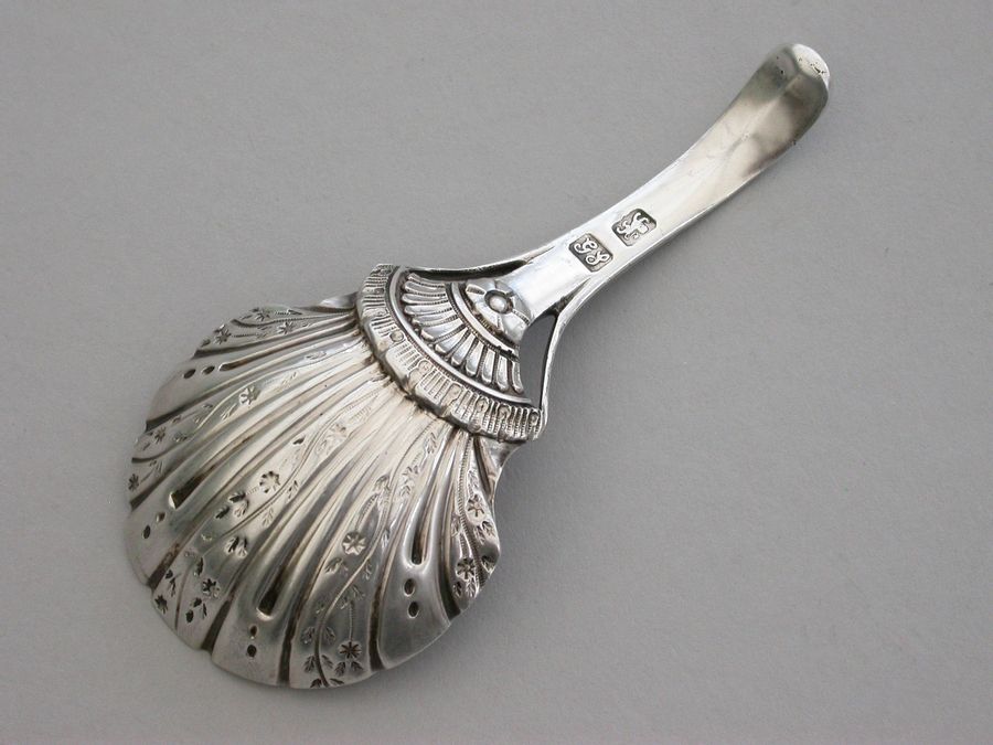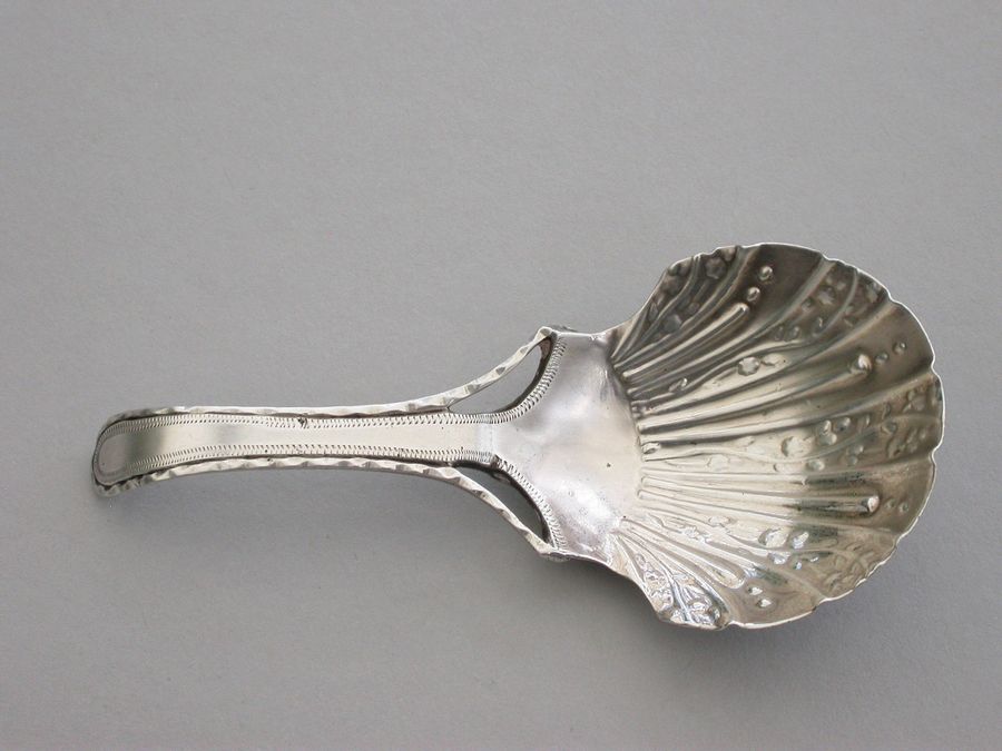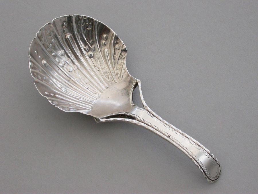 A fine and unusual George III 18th century silver Caddy Spoon, the trisected Old English pattern handle with feather edge border. The fluted bowl with unusual chased and engraved decoration to the reverse.