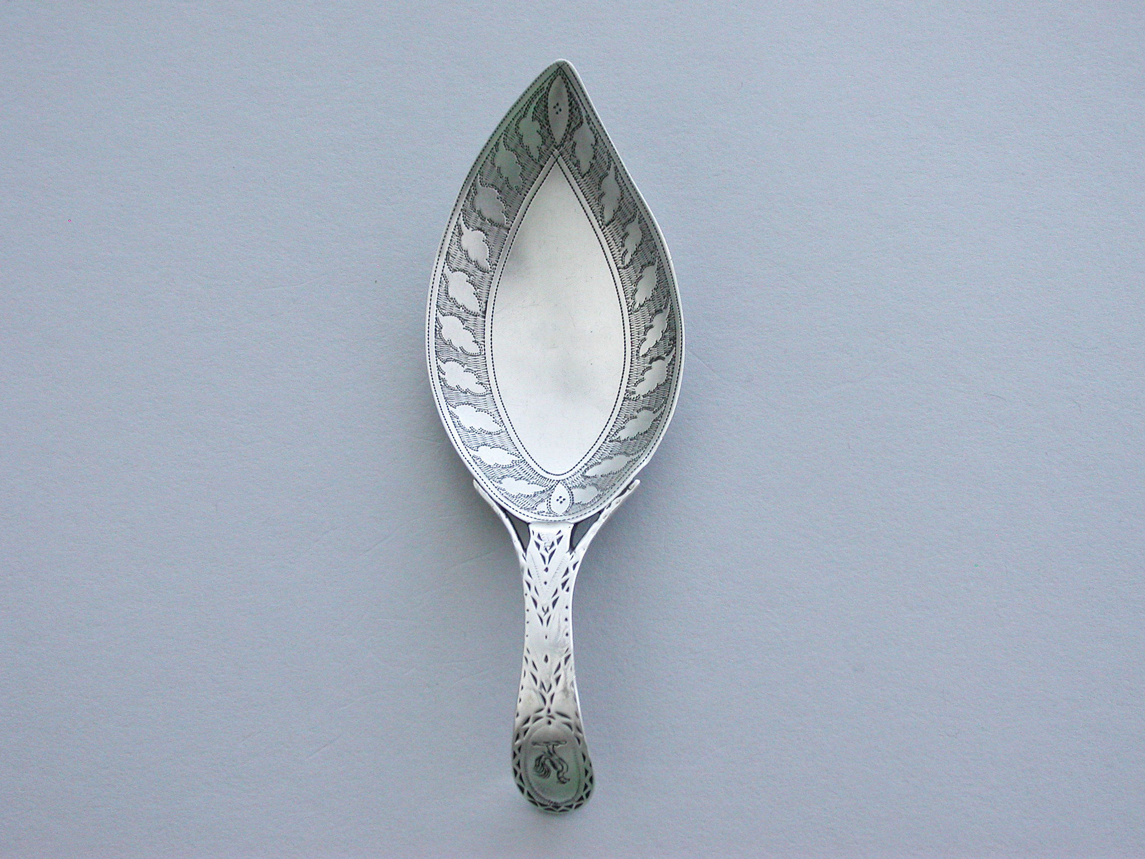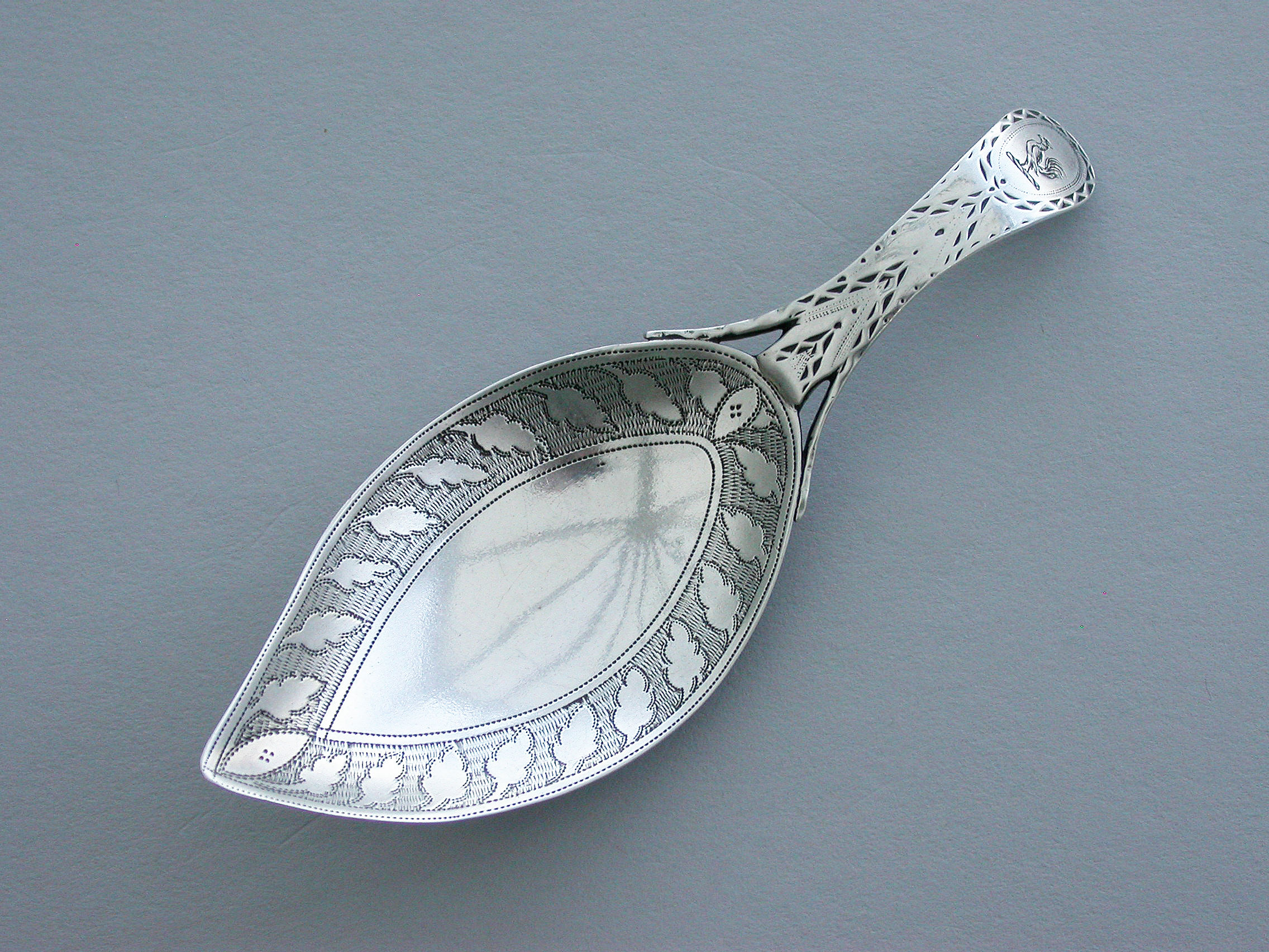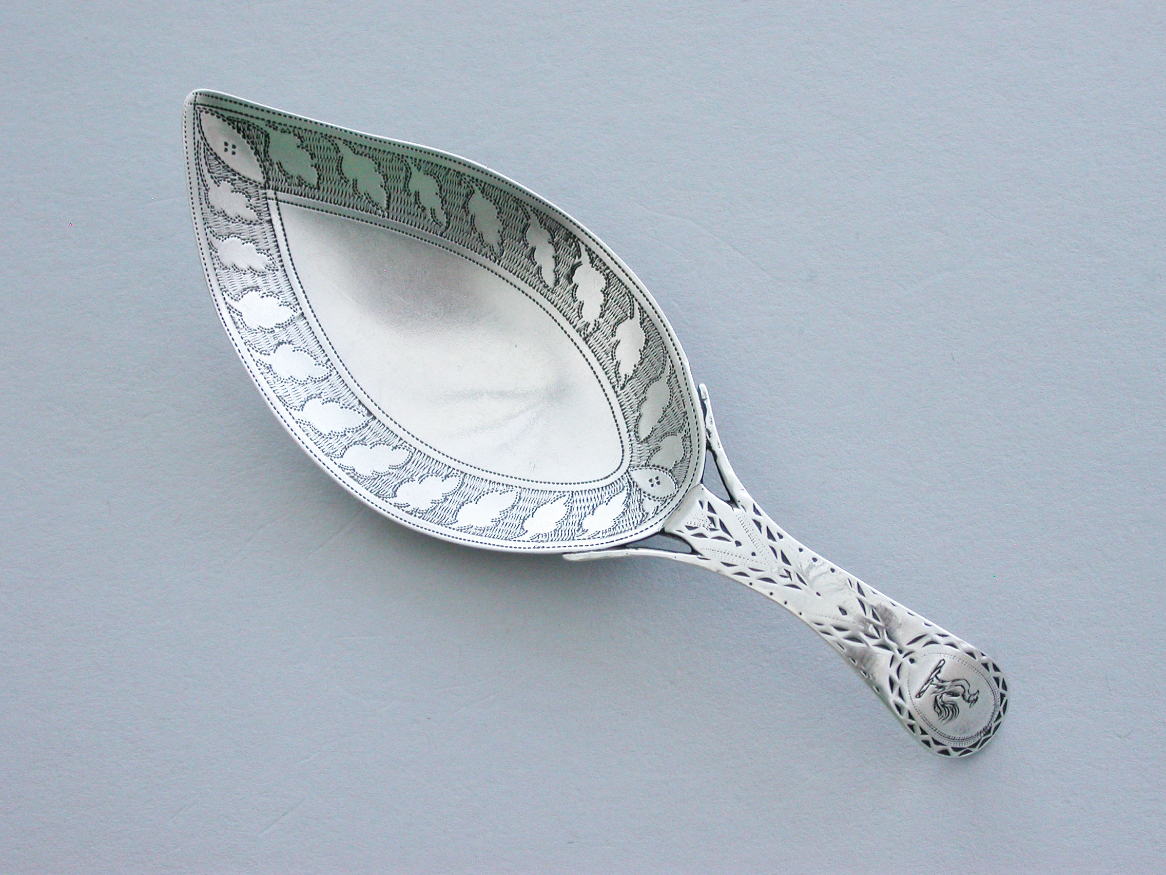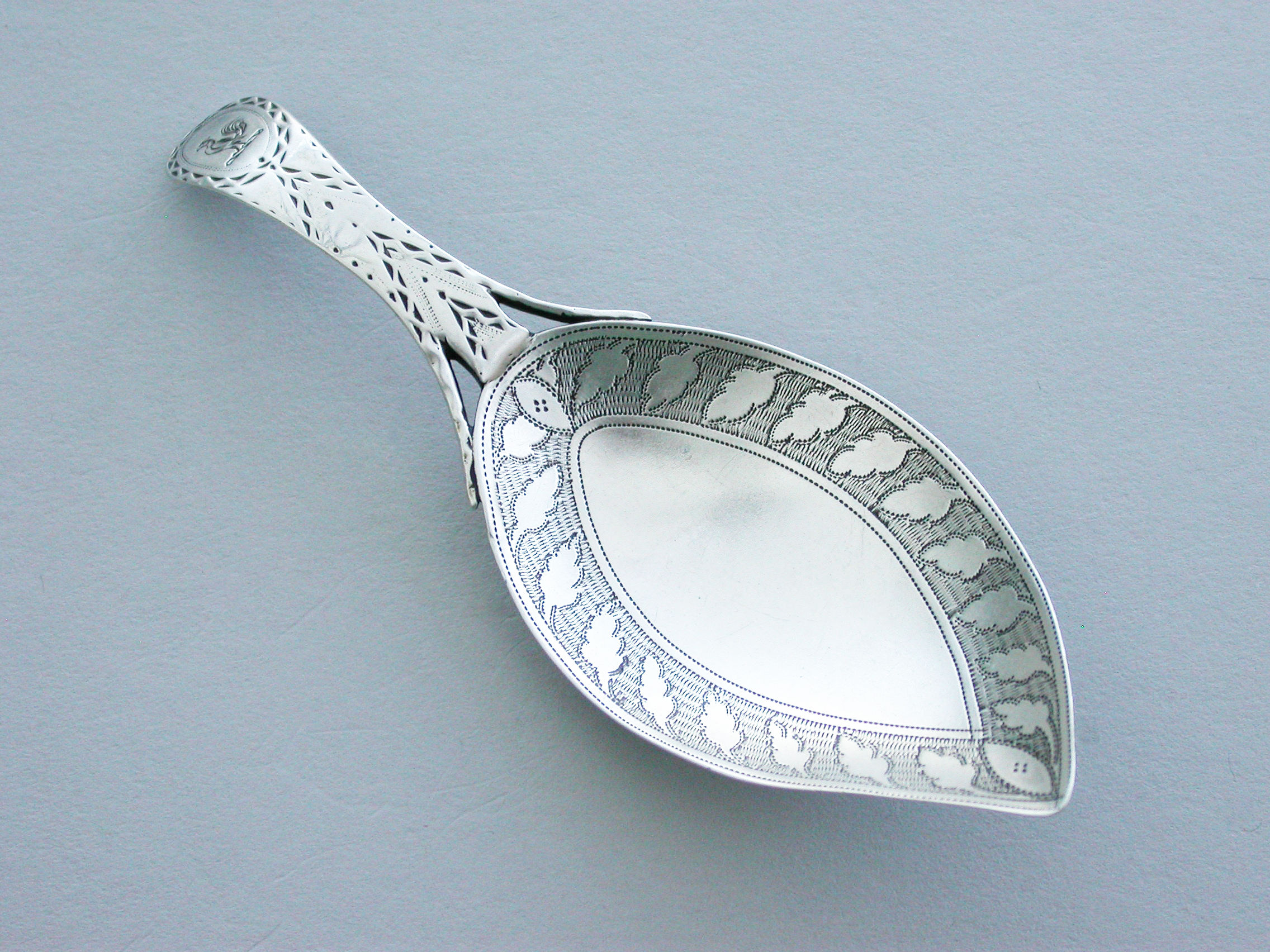 A very fine and rare 18th century London made silver Caddy Spoon with curved bifurcated Old English pattern handle with bright-cut engraved decoration and a crest of a cockerel to an oval cartouche. The leaf shaped bowl with border of engraved leaves on a stippled background.
