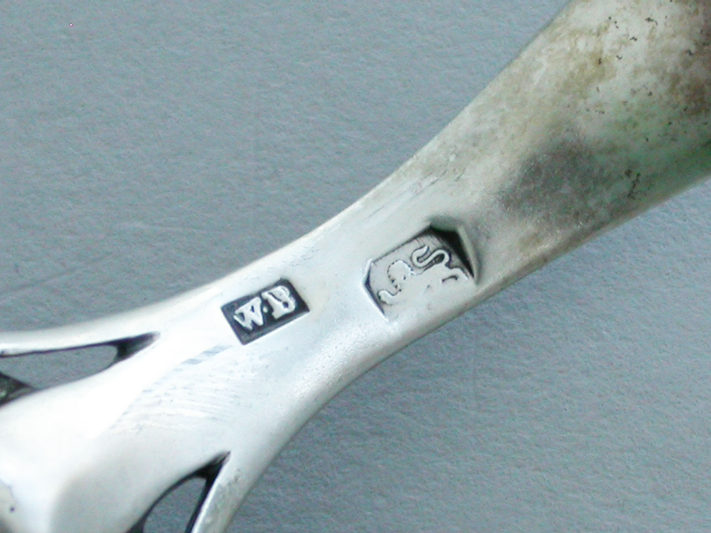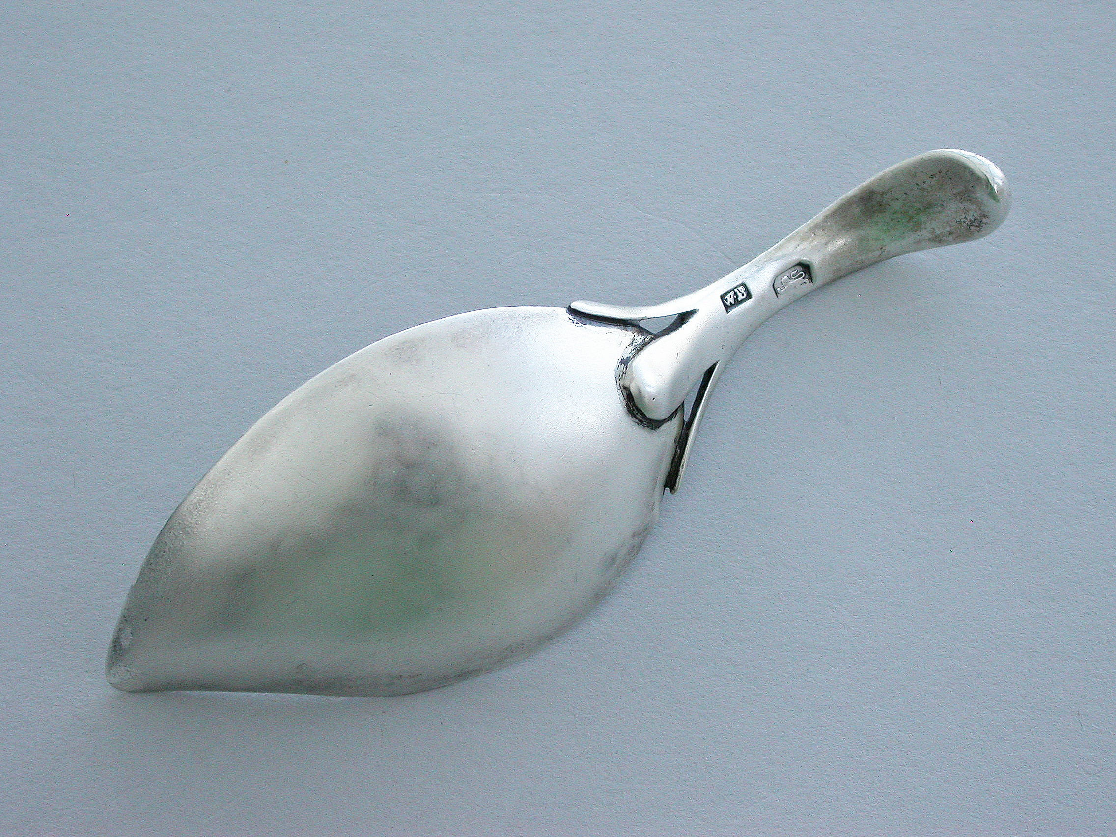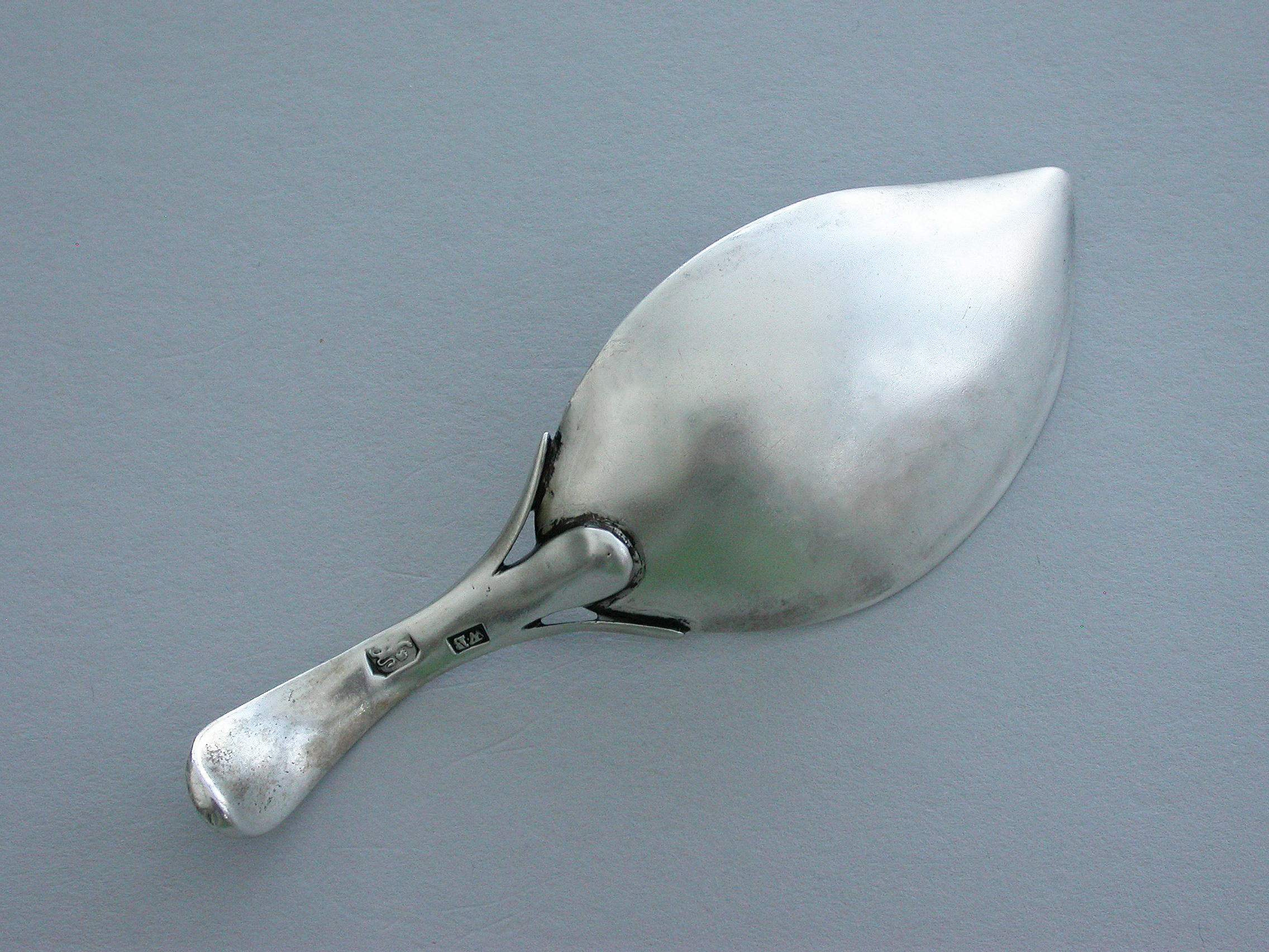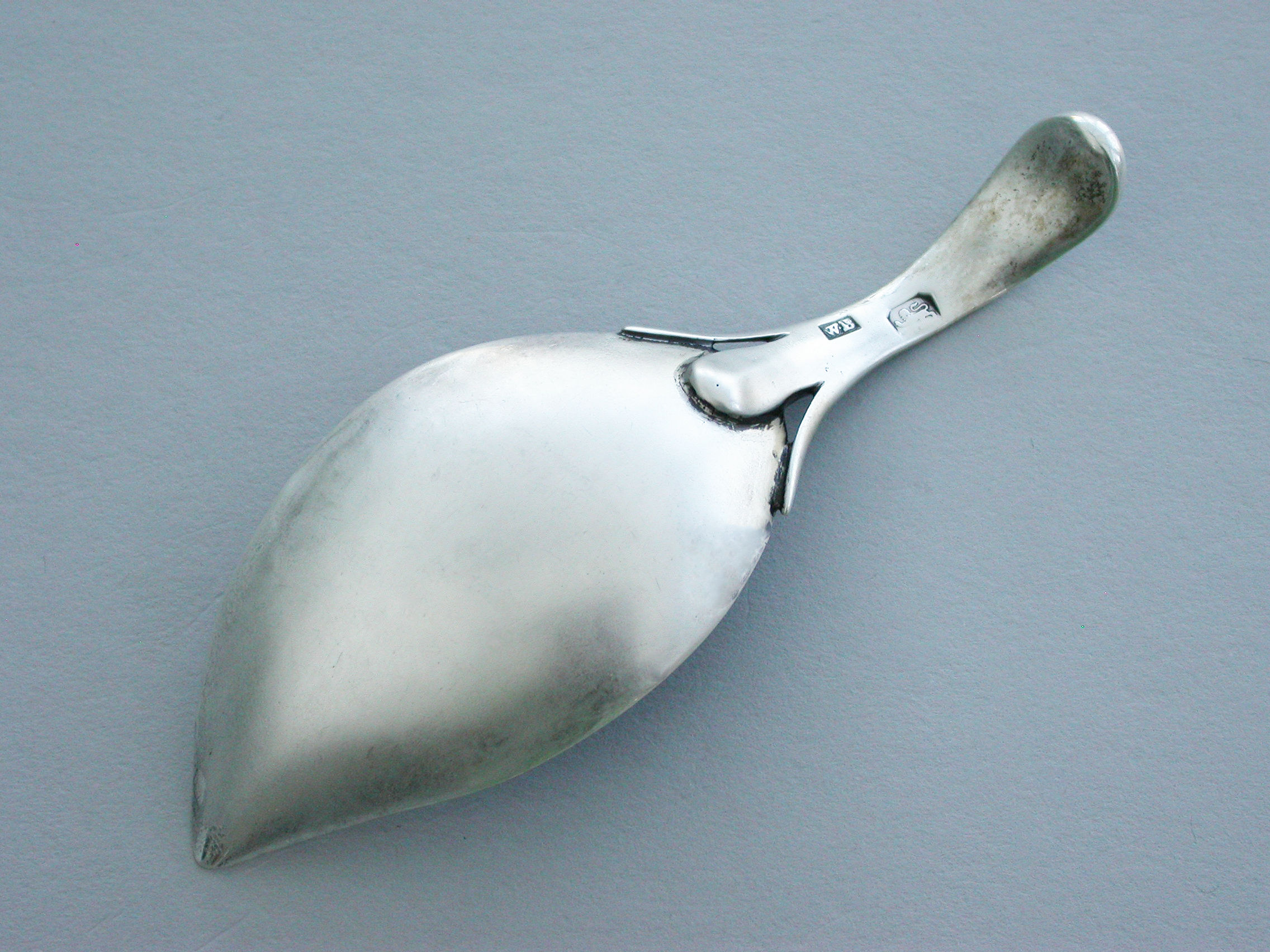 A very fine and rare 18th century London made silver Caddy Spoon with curved bifurcated Old English pattern handle with bright-cut engraved decoration and a crest of a cockerel to an oval cartouche. The leaf shaped bowl with border of engraved leaves on a stippled background.