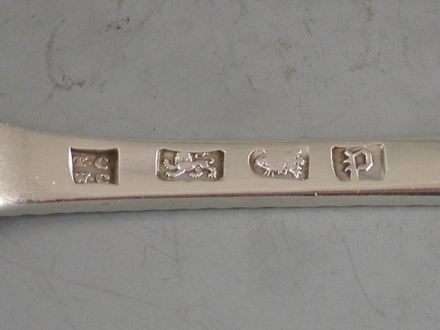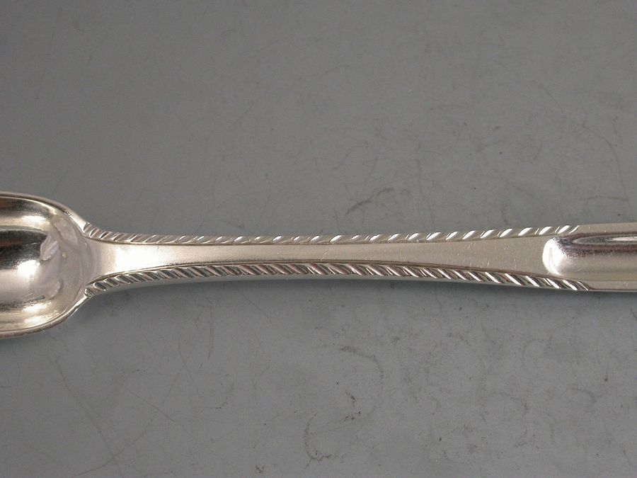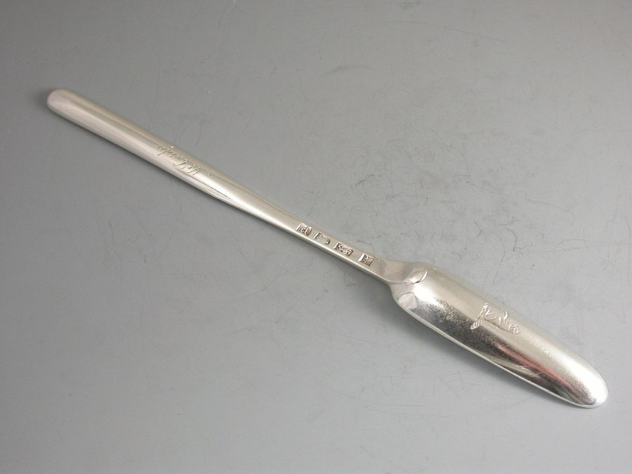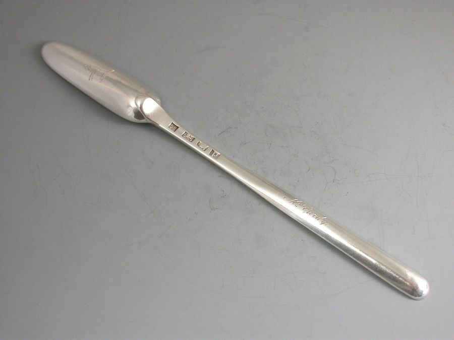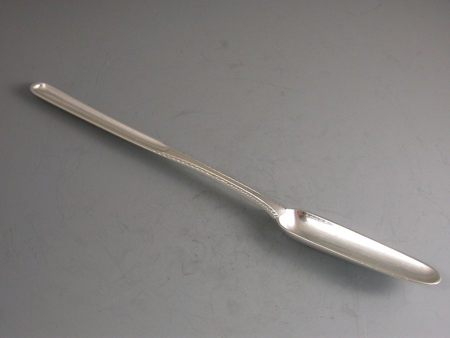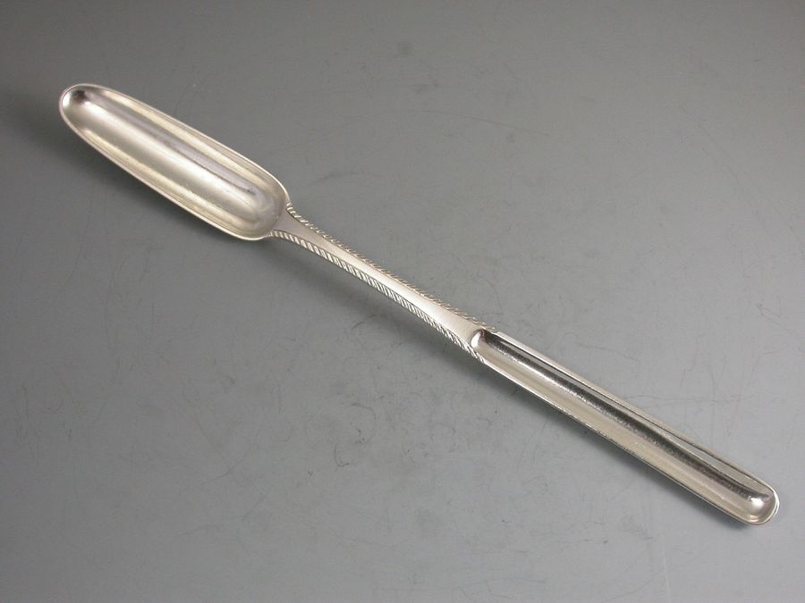 A fine George III 18th century silver Marrow Scoop of standard form, the stem with bright cut engraved feather edged border, the smaller bowl engraved with the name ""McCurdy"". The large bowl engraved with a crest of a Beaver, sejant.