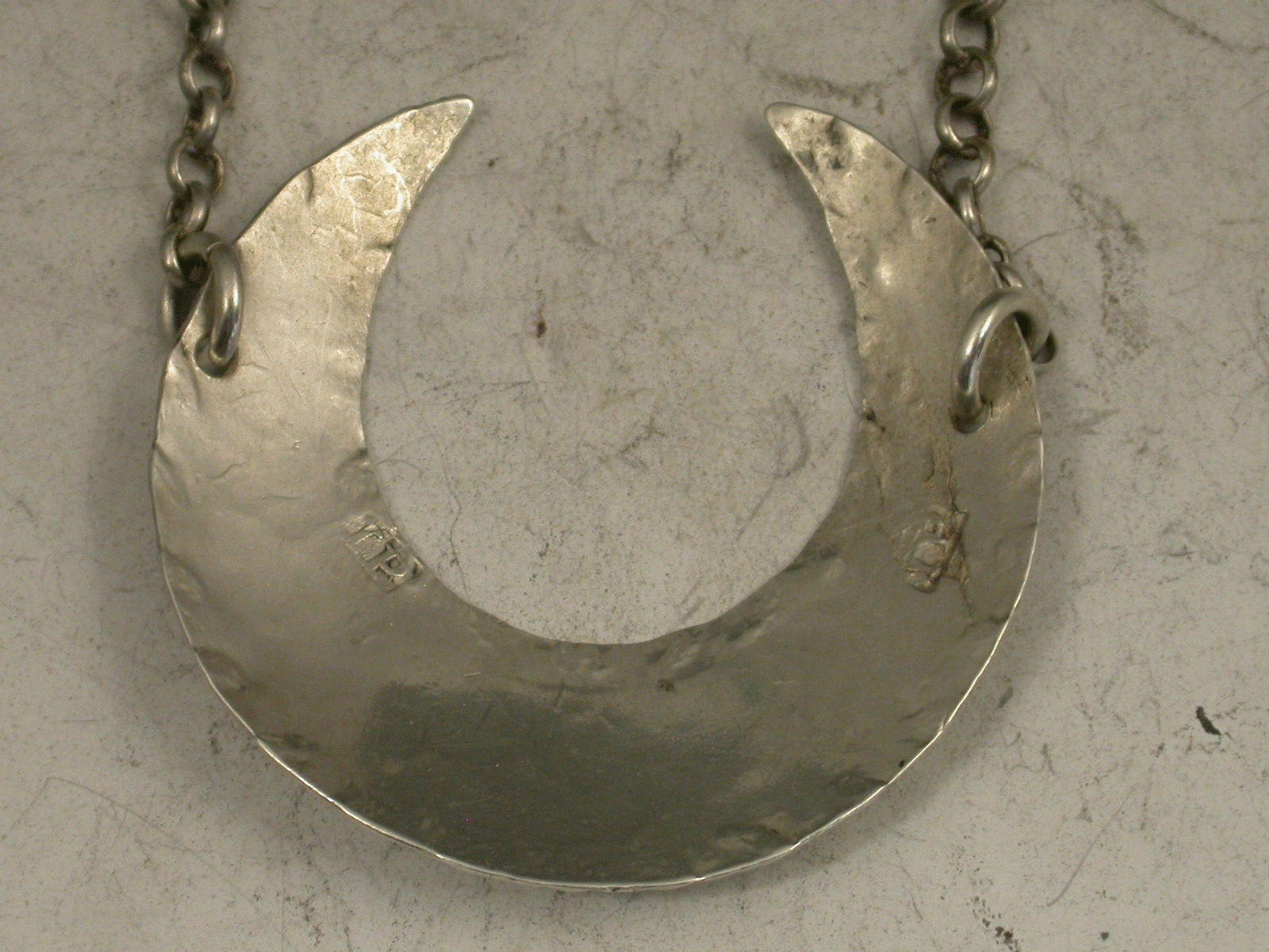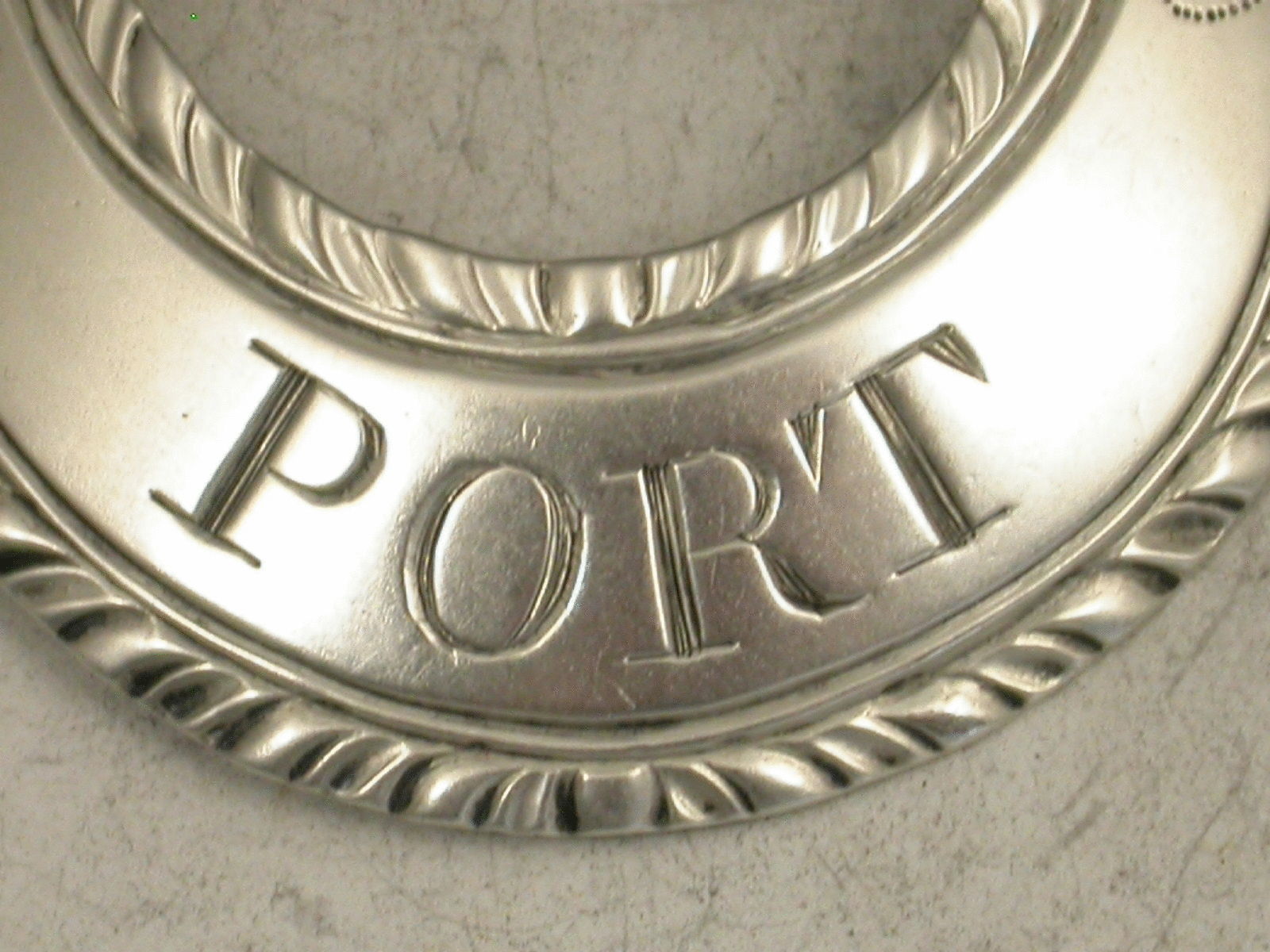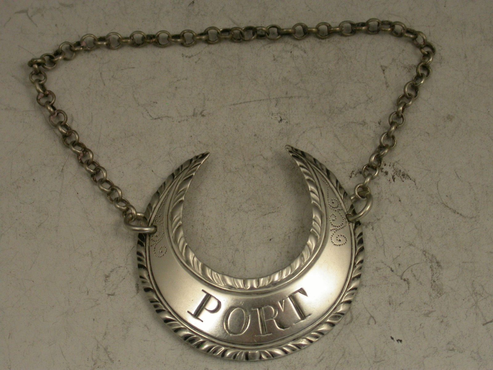 A good George III silver Wine Label of crescent form with feather edged border, incised for Port, prick dot engraved highlights around the suspension chain holes.