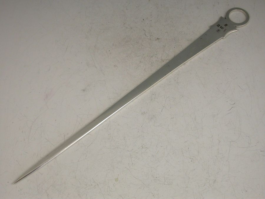 A nice quality George III Irish silver Meat Skewer with shield shaped terminal and plain ring handle, engraved with a crest depicting an arm holding a lizard or salamander, possibly for the Owen family of Ireland.