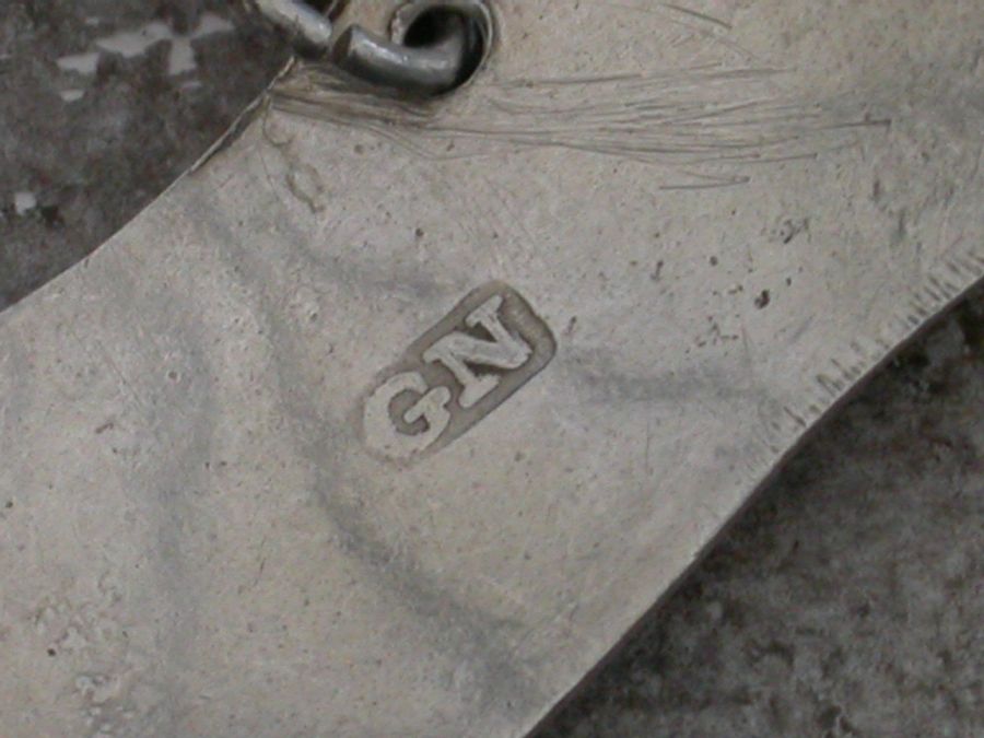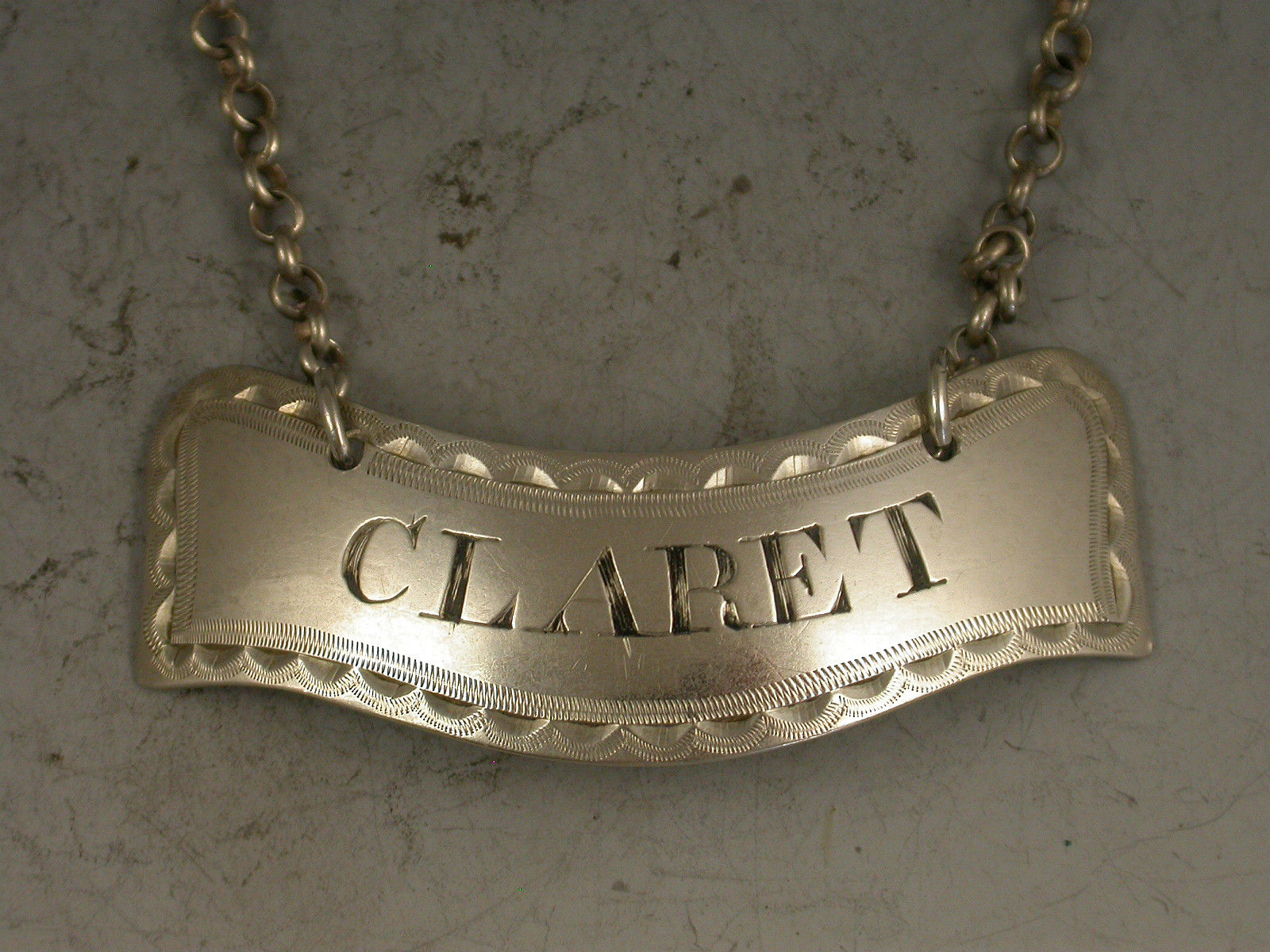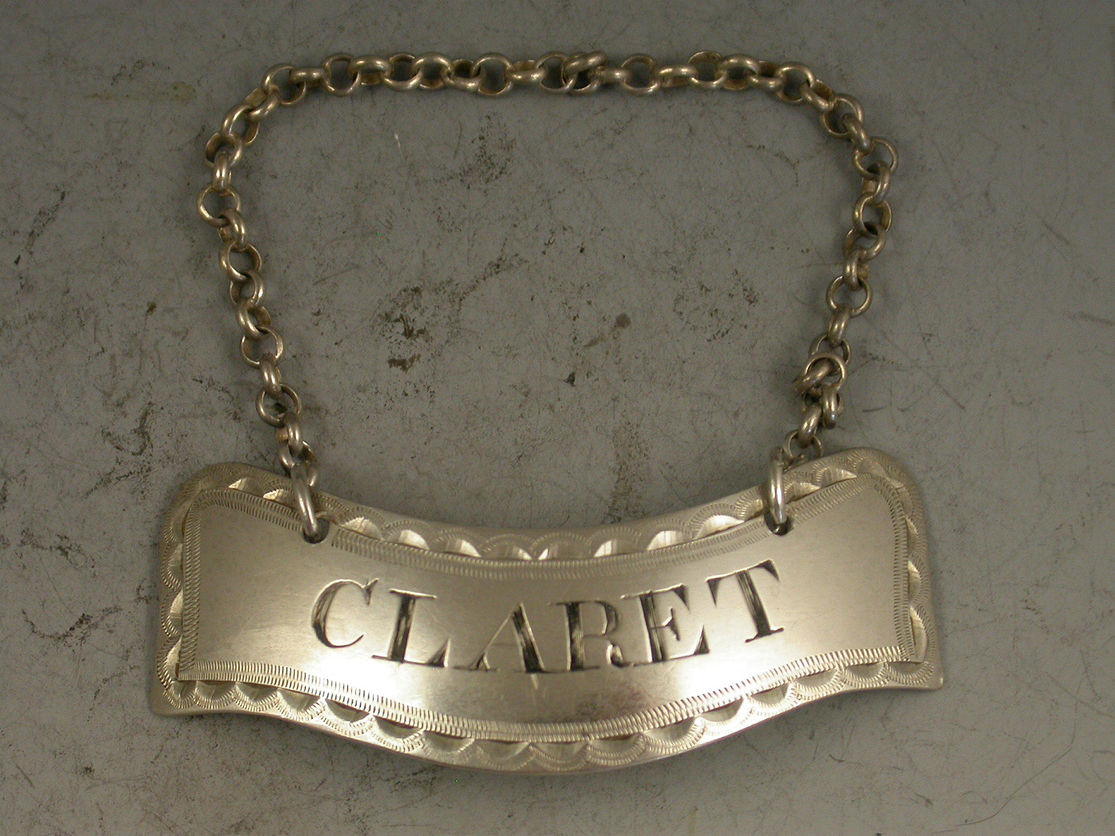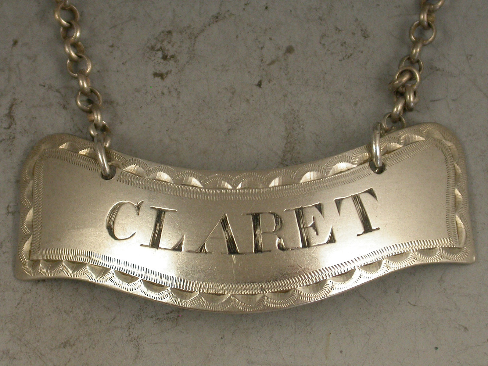 A fine George III Irish silver Wine Label of distinctive banner shape with bright-cut and wriggle-work engraved border, incised for Claret.