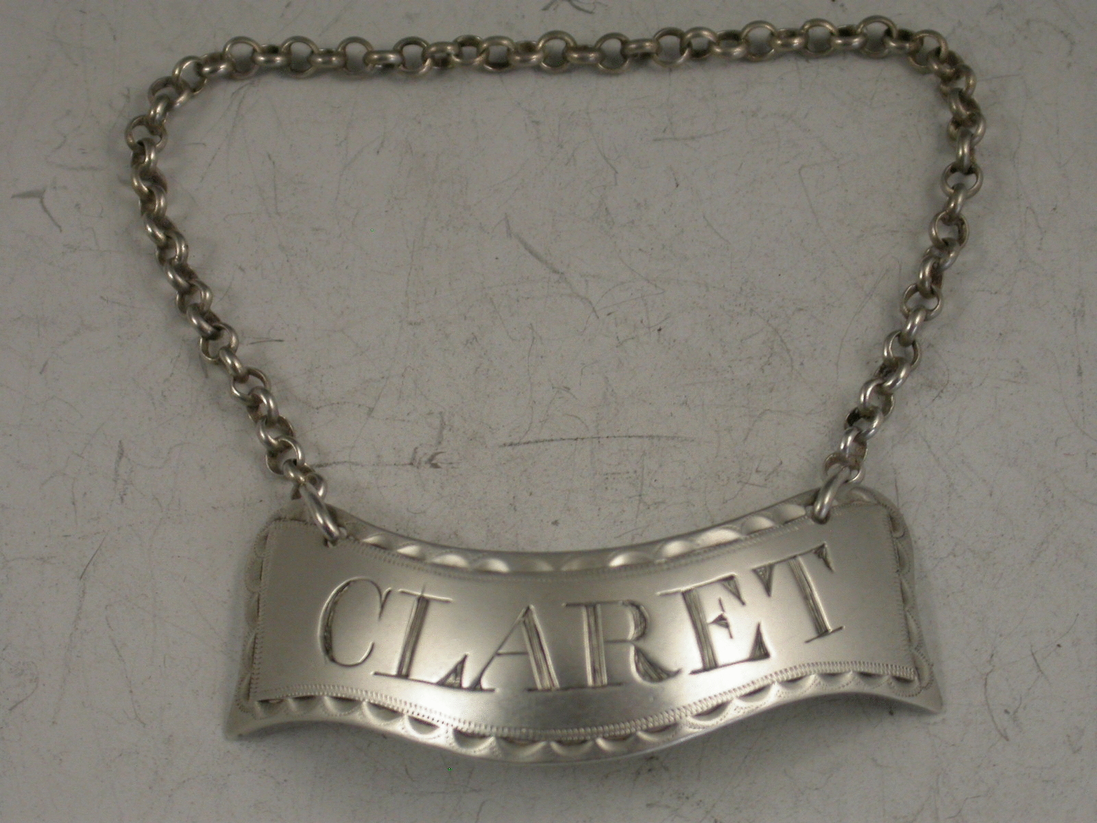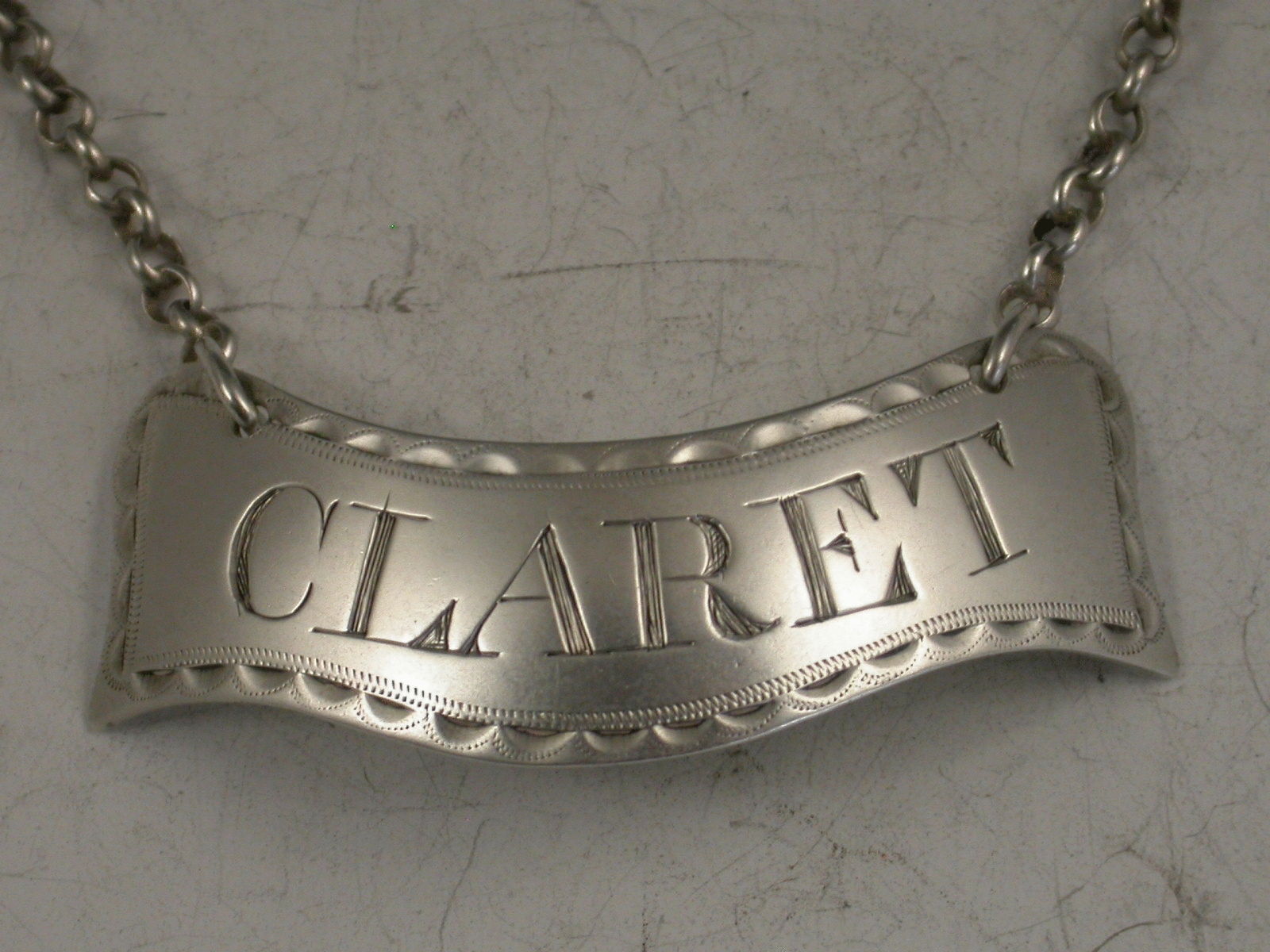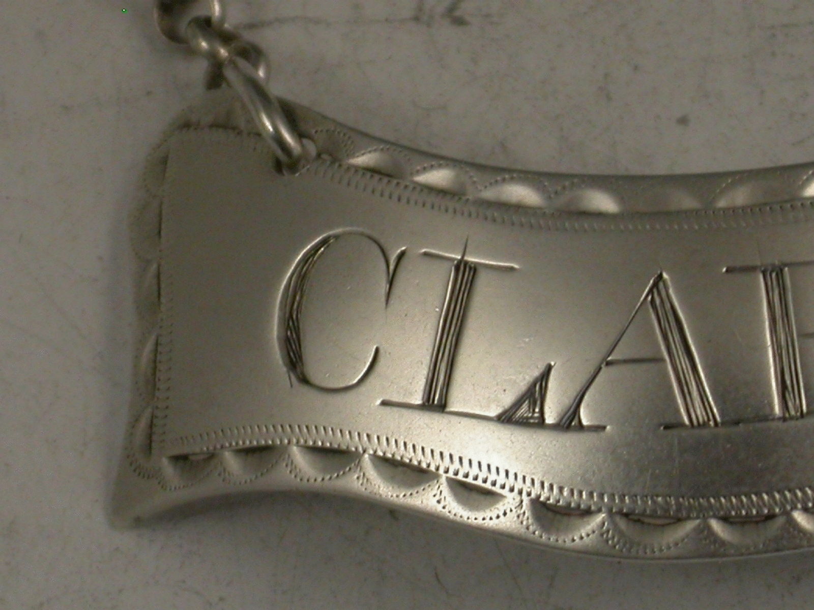 A fine George III Irish silver Wine Label of curved banner shape with bright cut engraved feather edged border, incised for Claret.