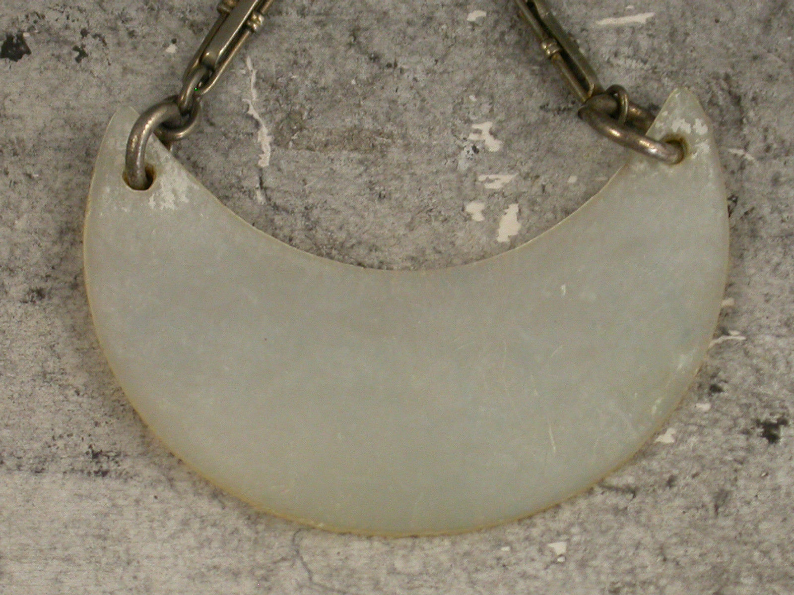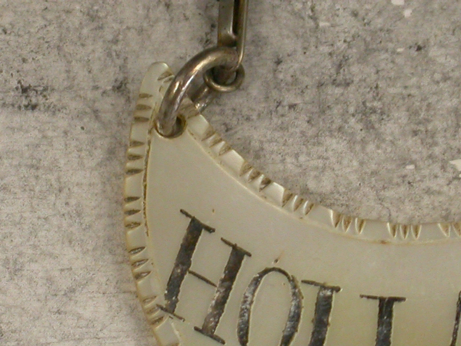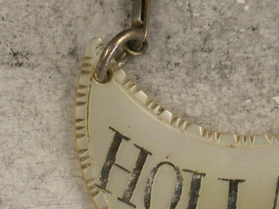 A George III Mother of Pearl Wine Label of crescent form, carved to simulate a silver example with feather edge border, incised and niello filled for Hollands.