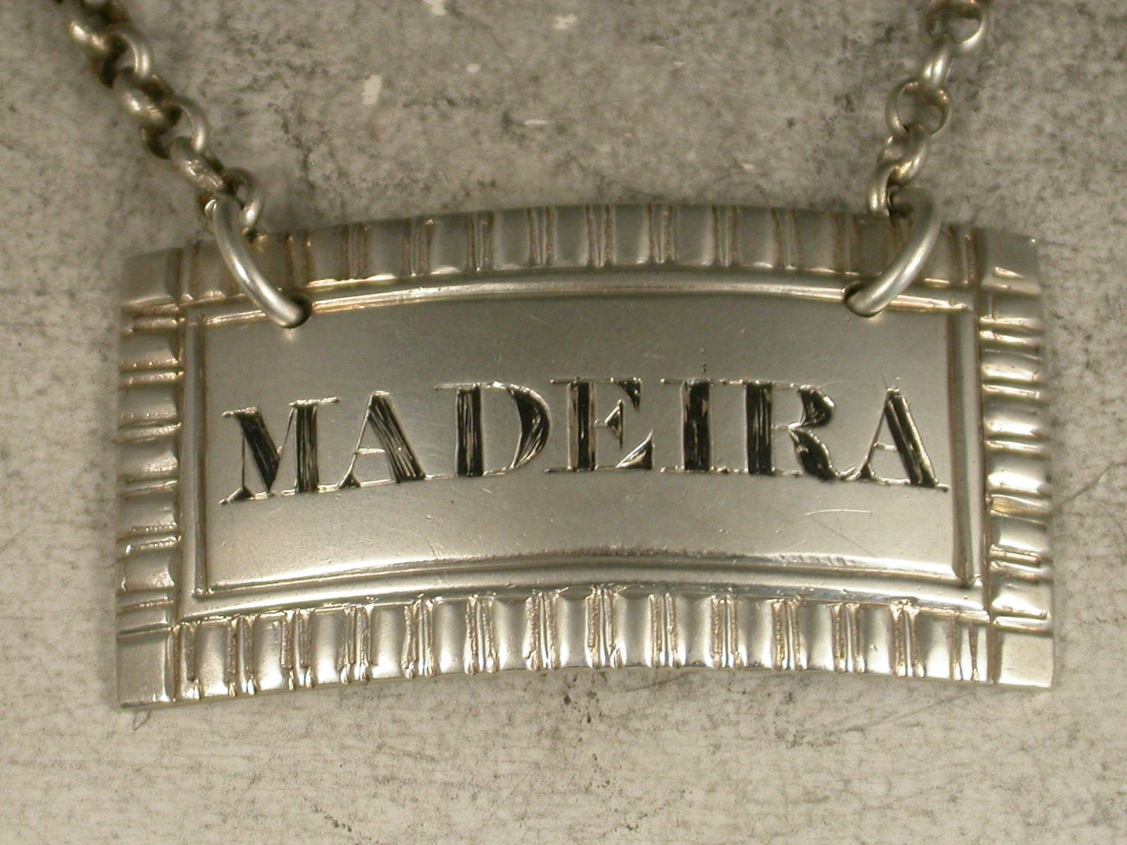 A rare George III Provincial silver Wine Label of rectangular form with gadrooned border, incised and niello filled for Madeira.