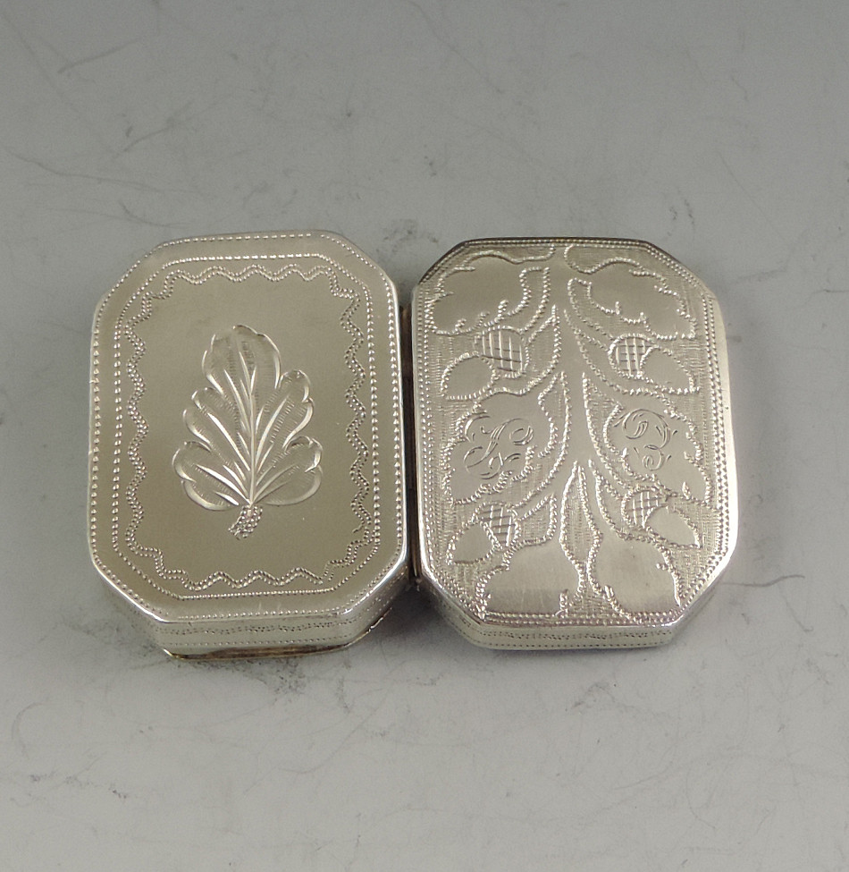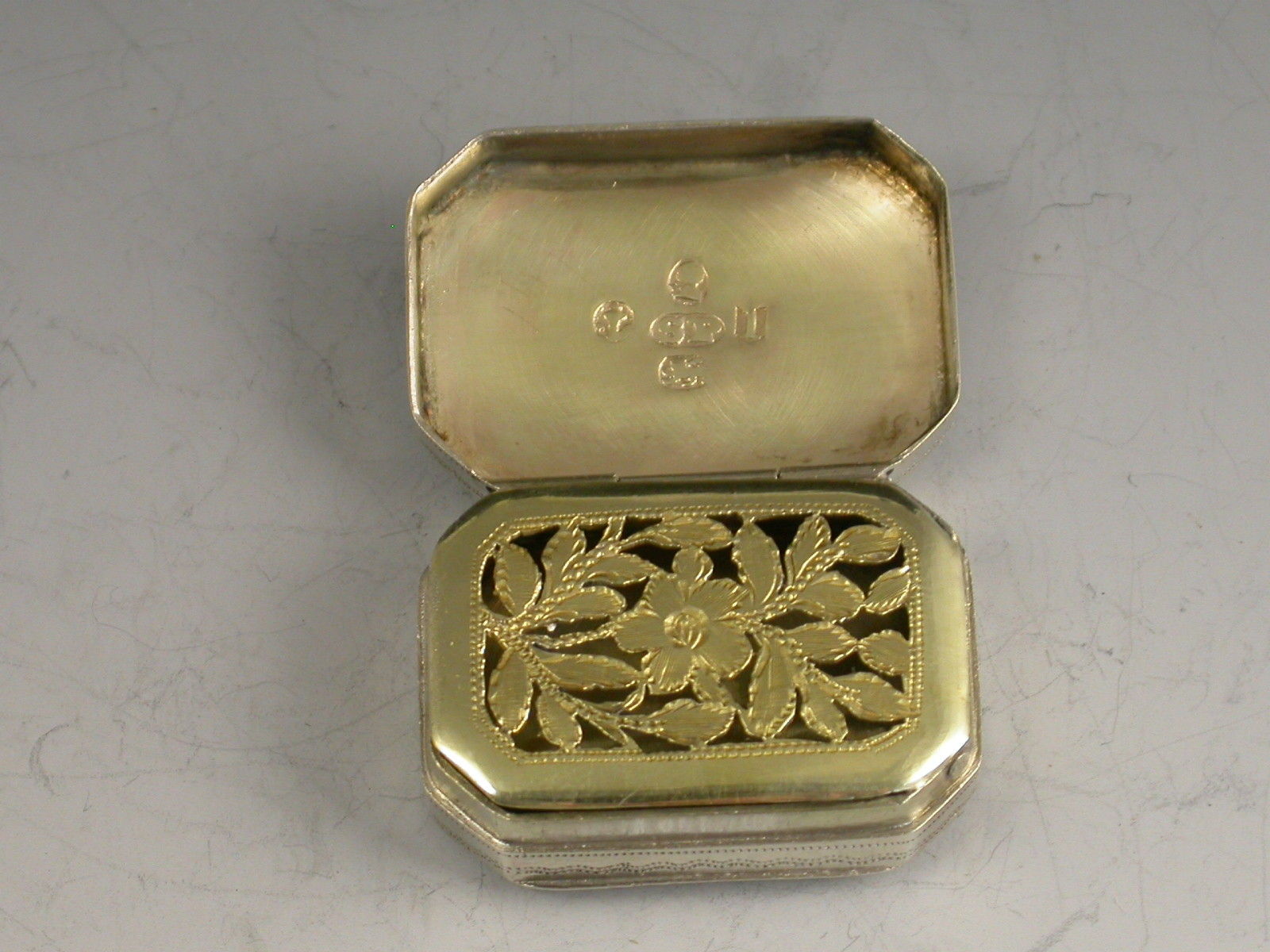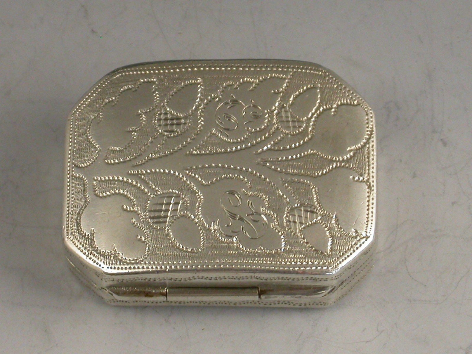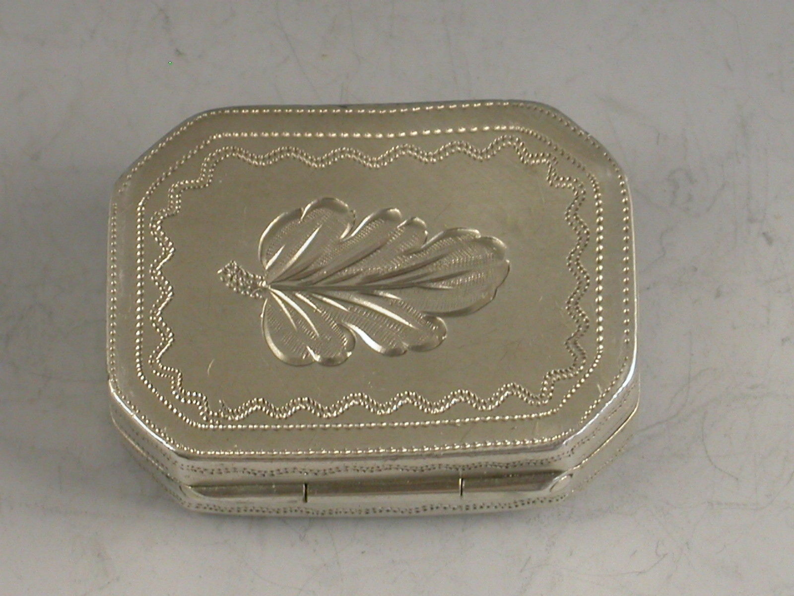 A good George III silver Vinaigrette of curved rectangular form with cut corners, the base engraved with an oak leaf and prick-dot engraved borders, the lid engraved with an oak branch and acorns and the initials 'EB' on two of the leaves. Silver gilt interior with foliate pierced grille.