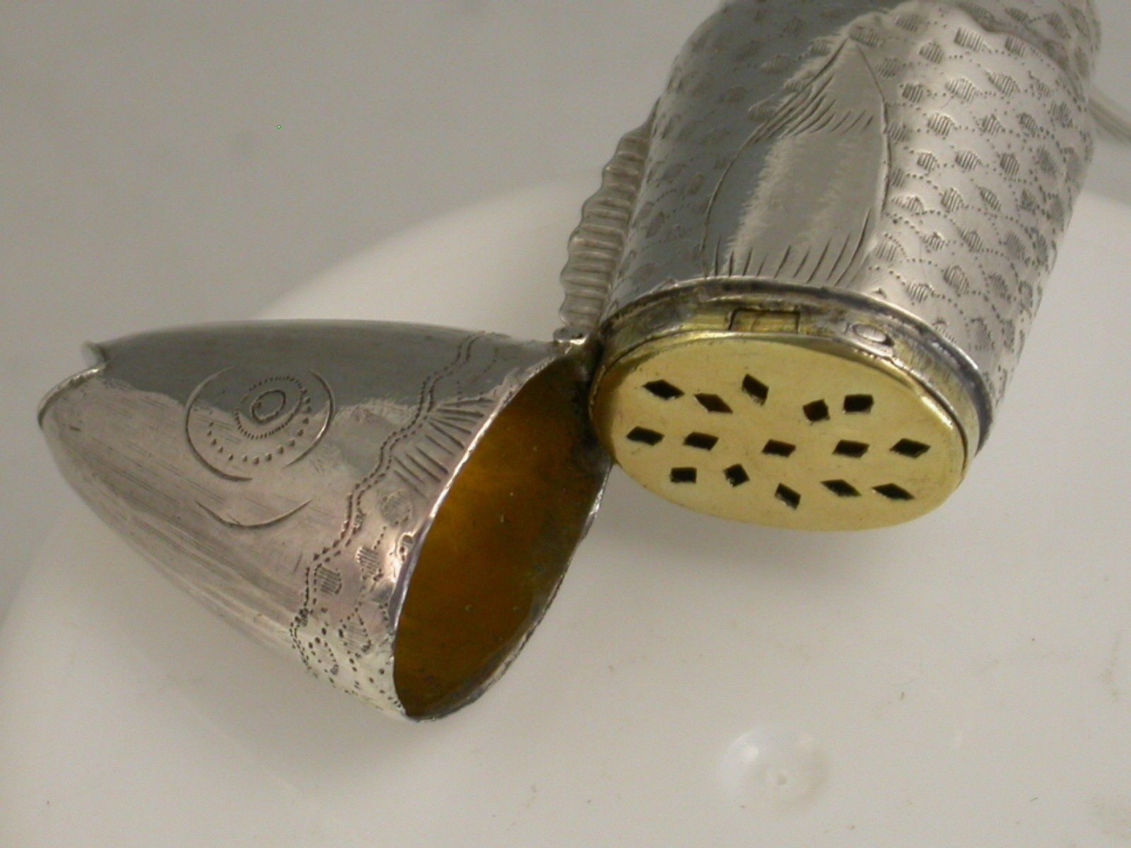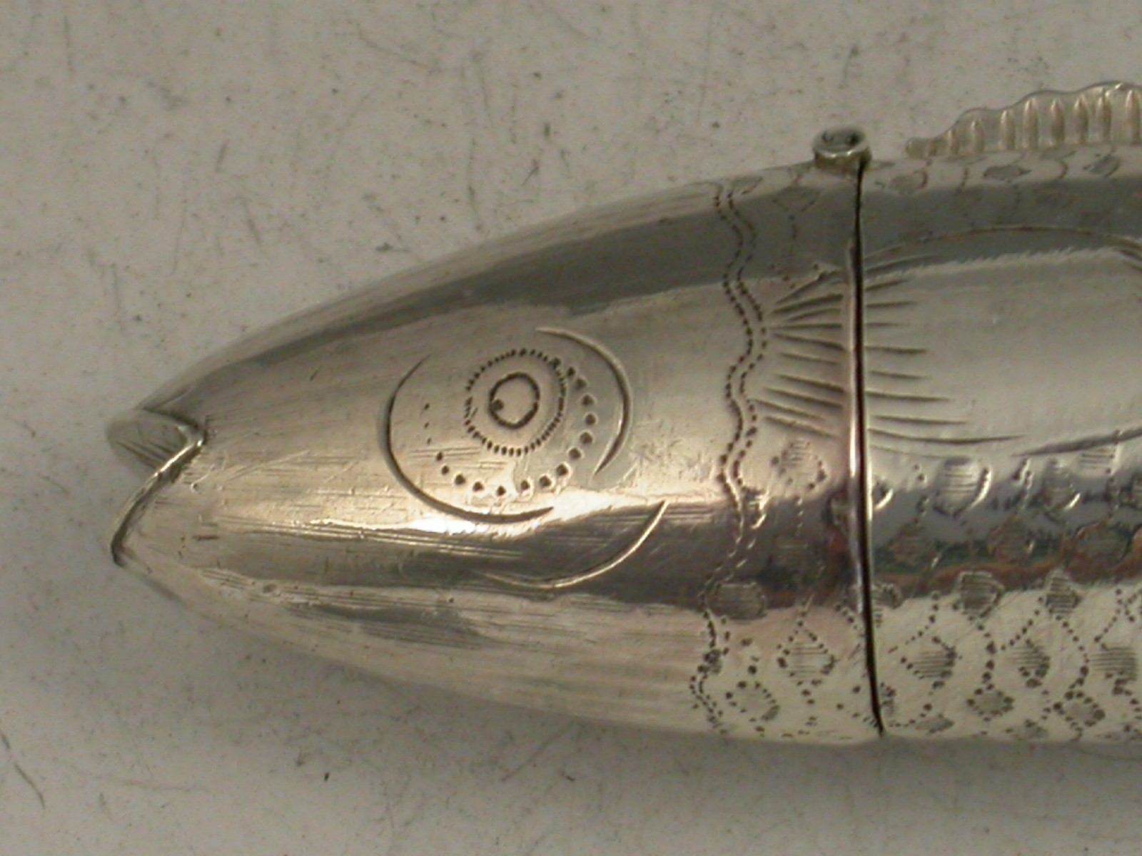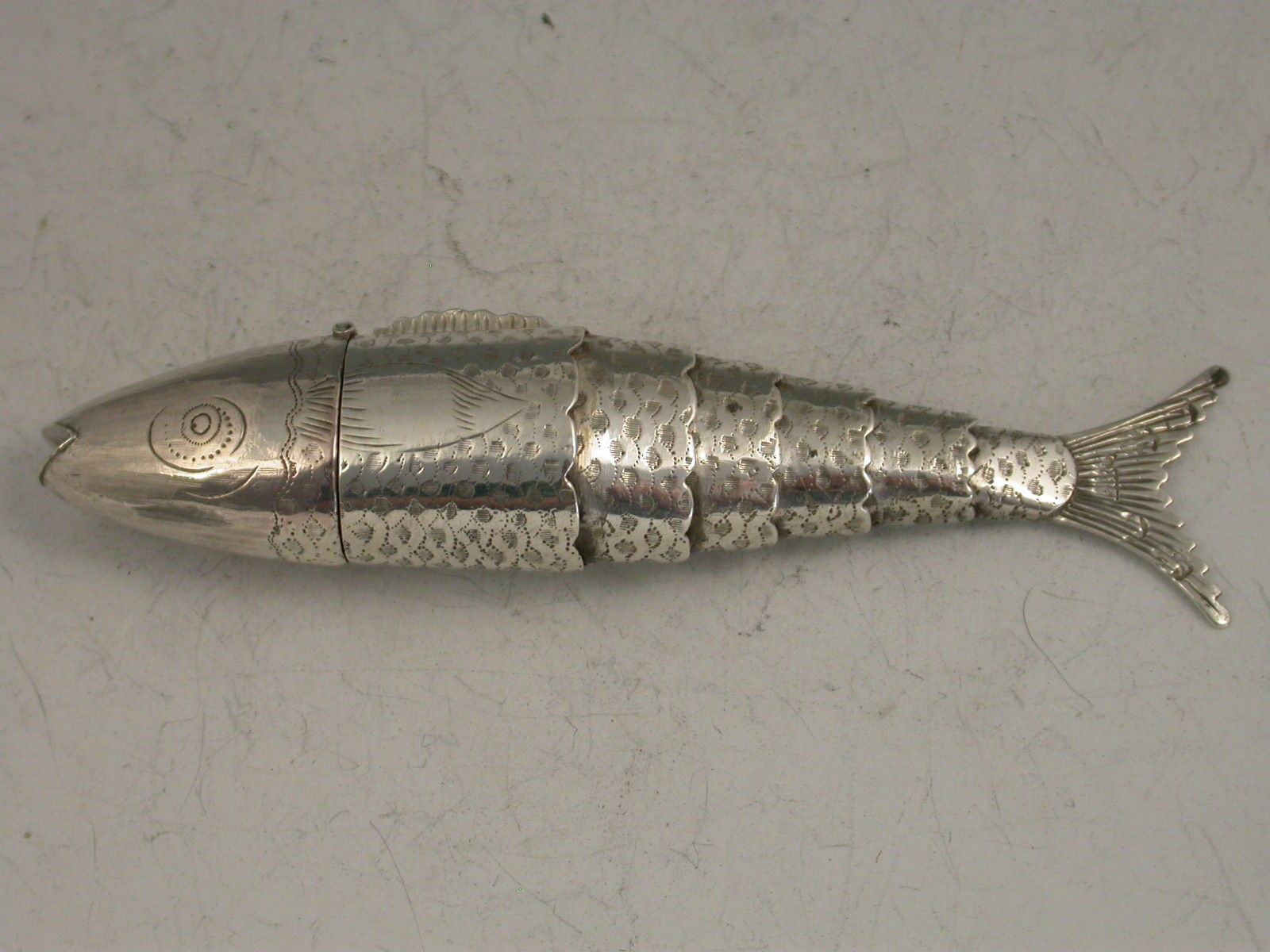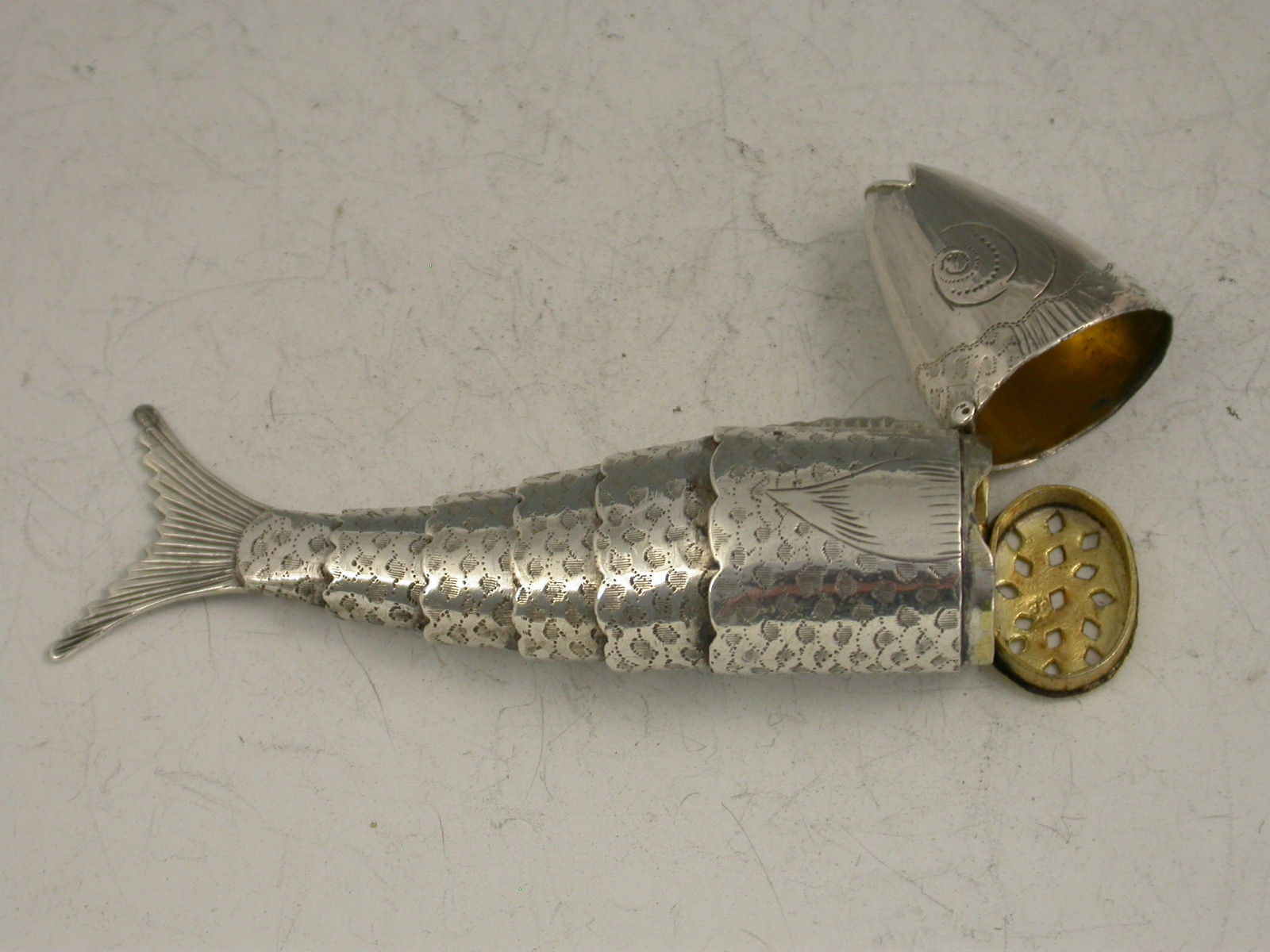 A rare George III novelty silver Vinaigrette made in the form of a fish, with five separate articulated pieces forming the tail, the head hinging open to reveal the silver gilt interior and pierced grill, the body engraved to simulate scales.