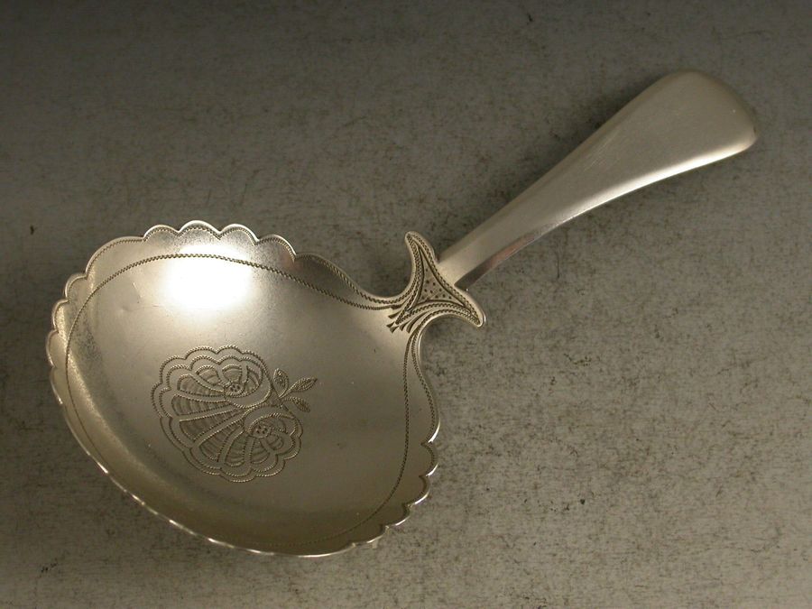 A fine George III silver Caddy Spoon, the plain bevelled Old English pattern handle with shoulders, the large shaped circular bowl bright-cut and prick dot engraved with an anthemion shell to the centre.