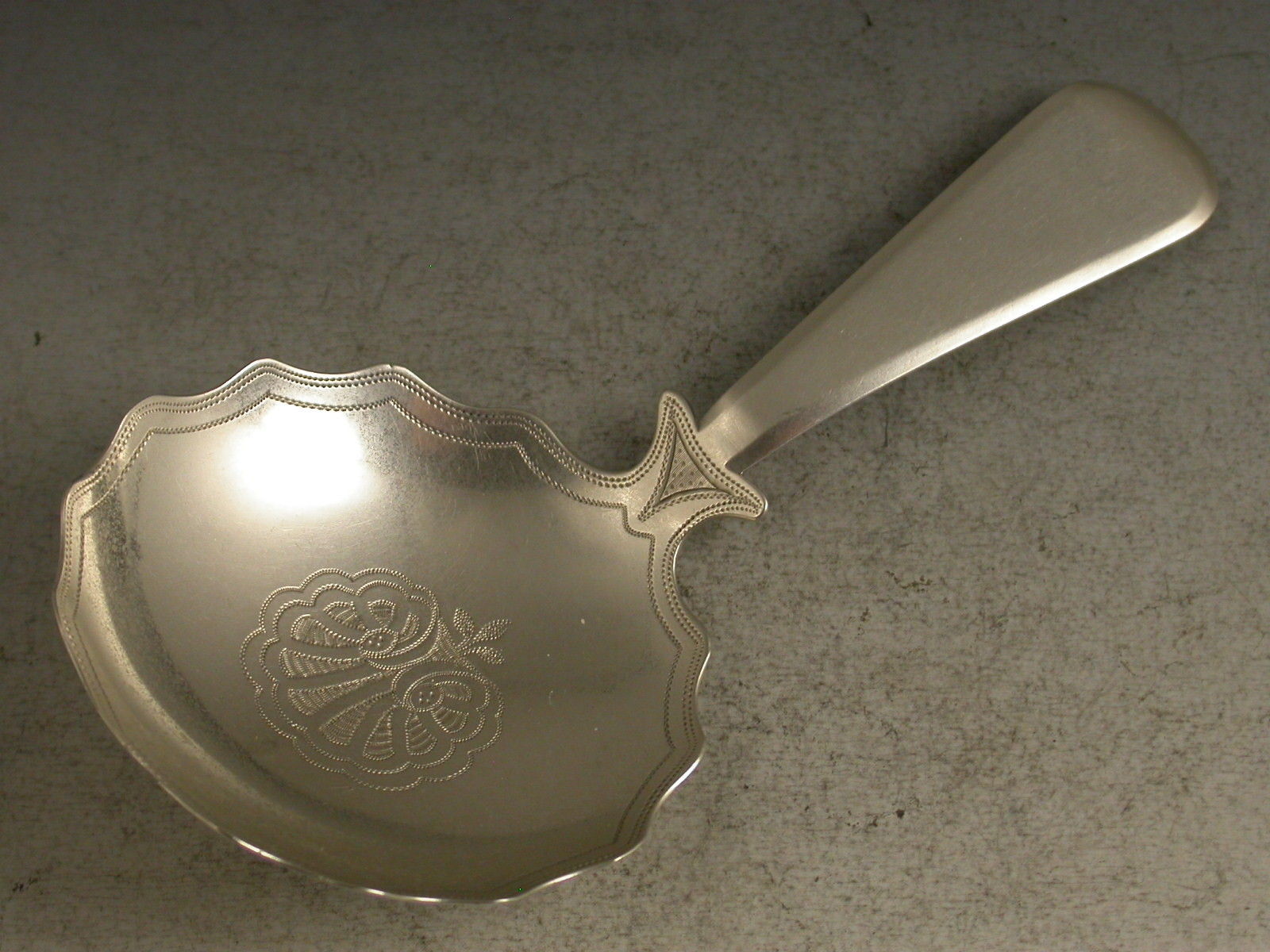 A fine George III silver Caddy Spoon, the plain bevelled Old English pattern handle with shoulders, the large shaped circular bowl bright-cut and prick dot engraved with an anthemion shell to the centre.