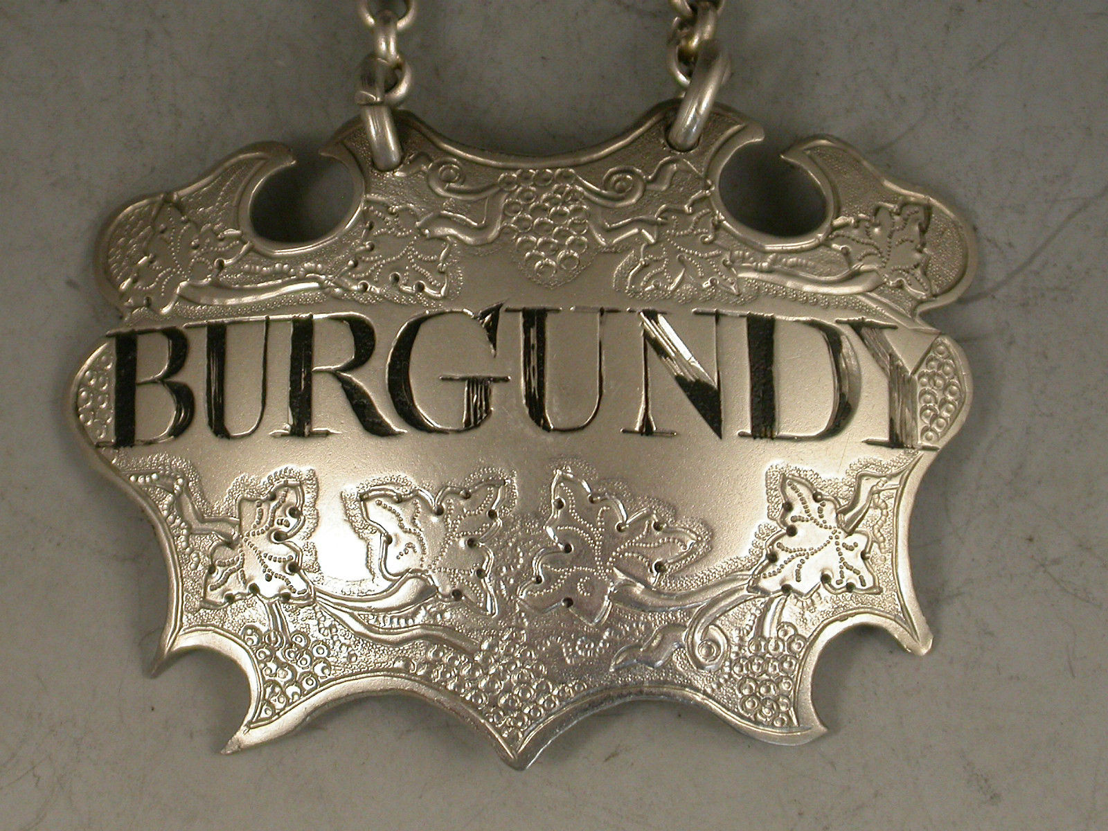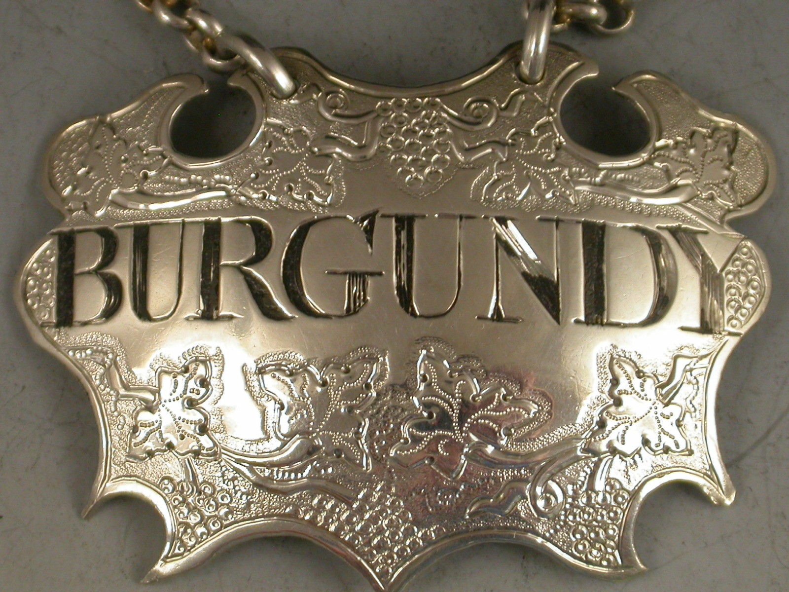 A fine and rare George II / early George III silver Wine Label of chased escutcheon form, incised and niello filled for Burgundy between vine leaves and grapes.
