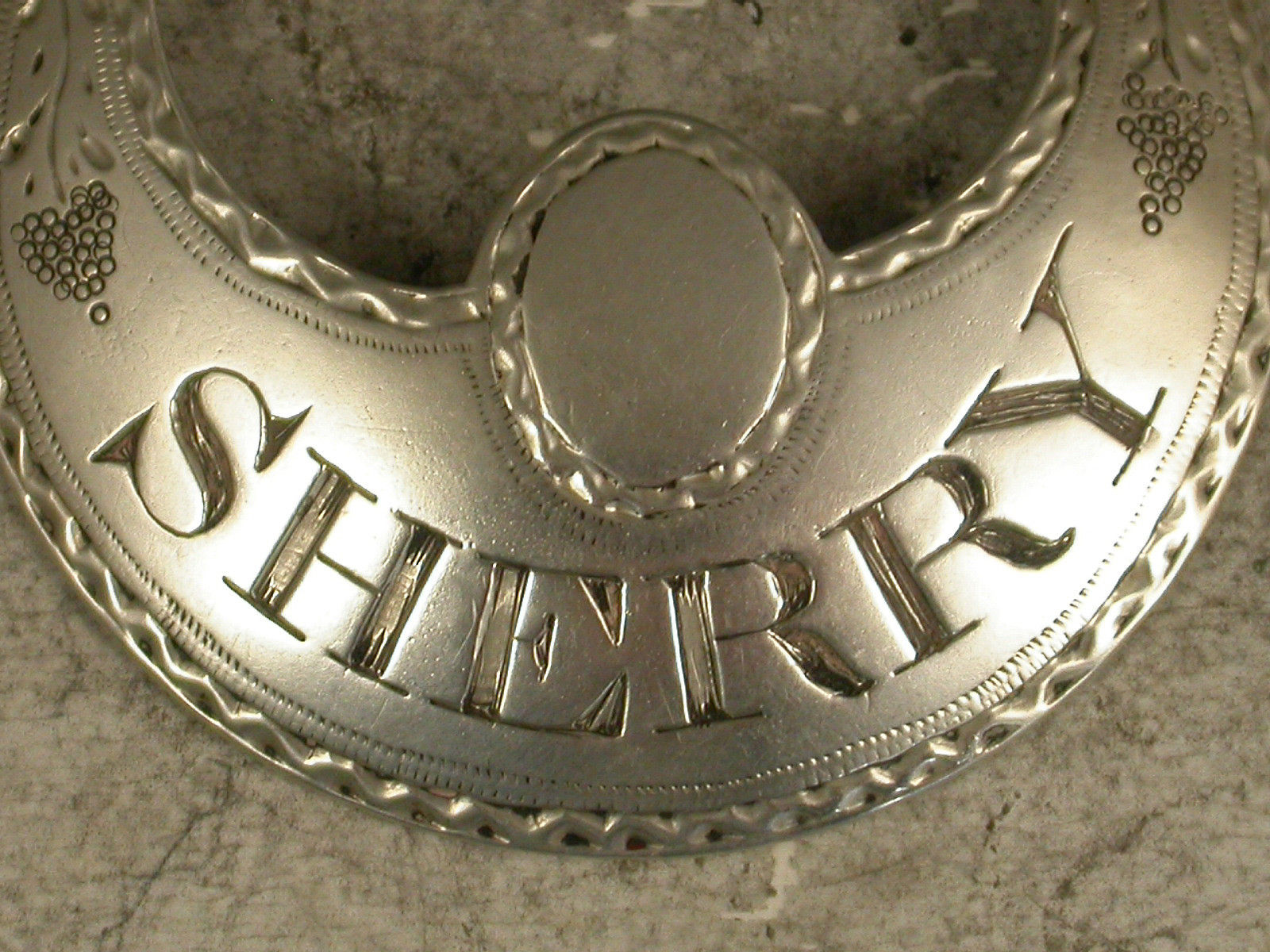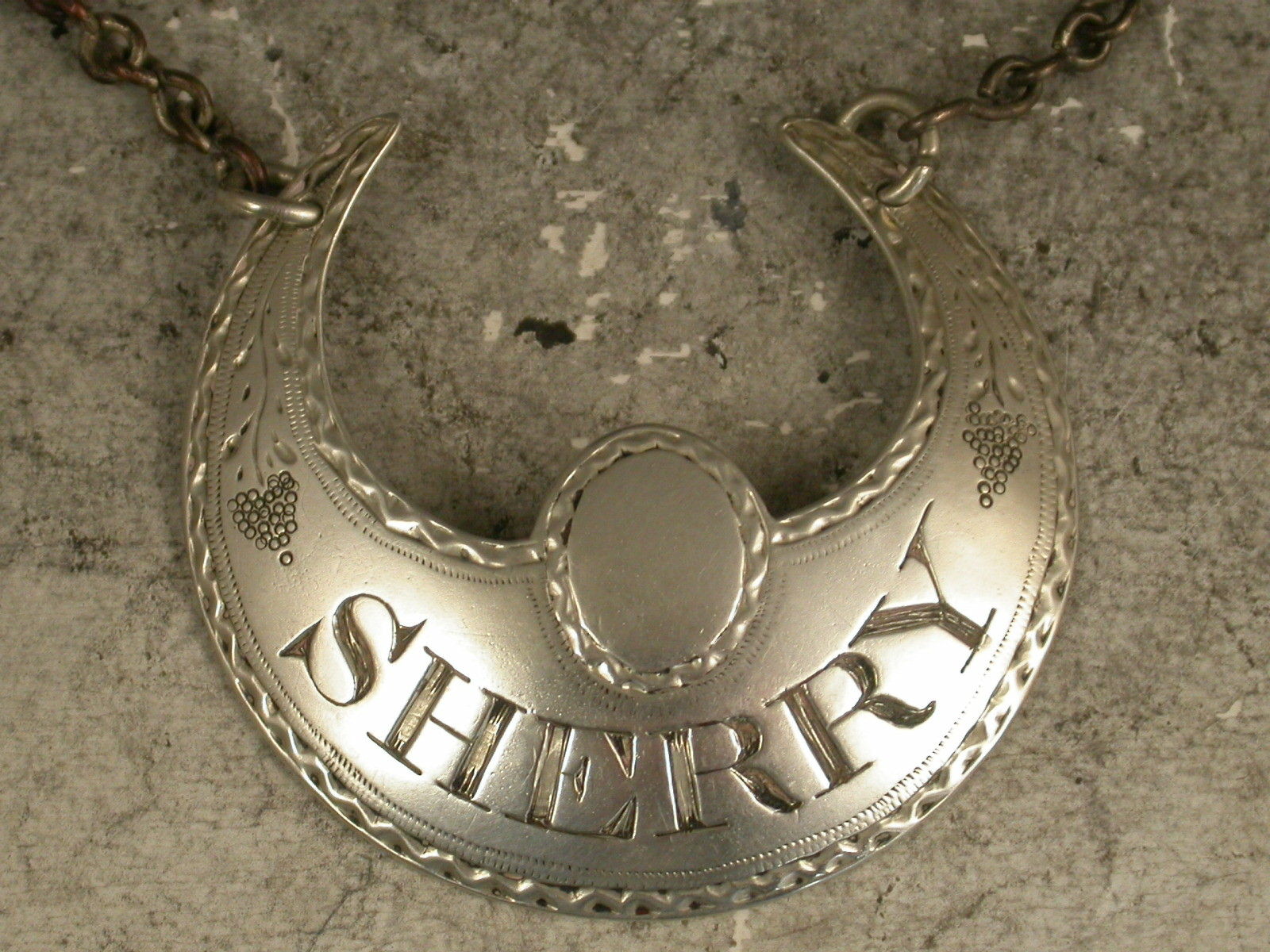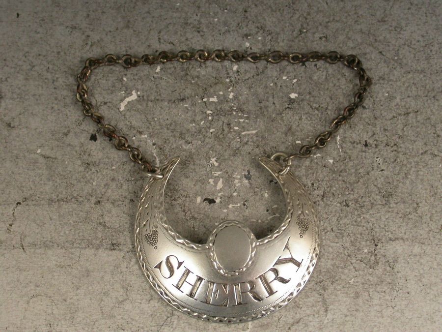 George III Antique Silver Crescent with Cartouche Wine Label 'Sherry'
