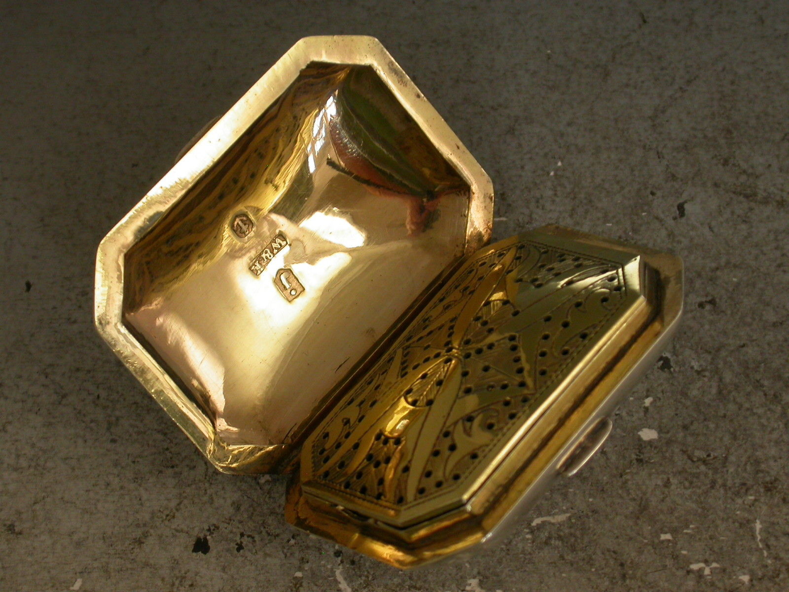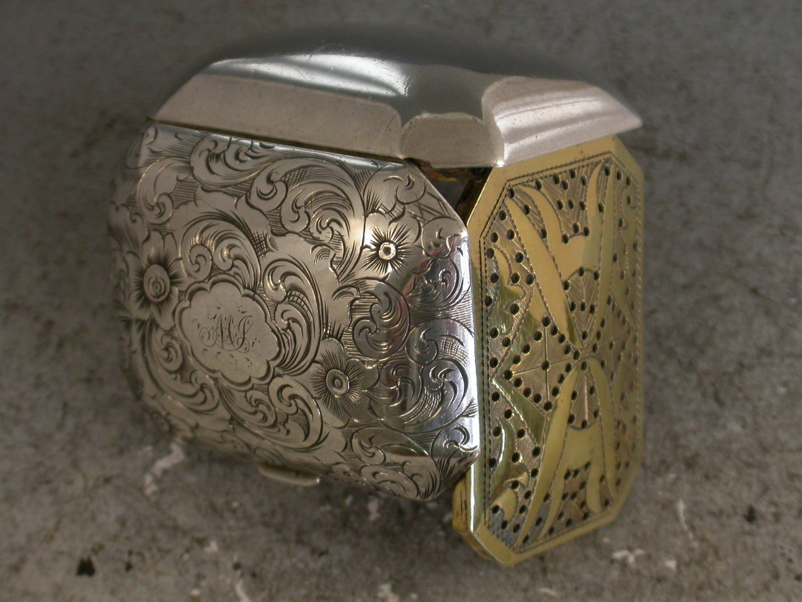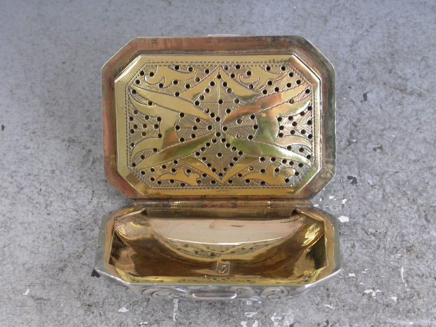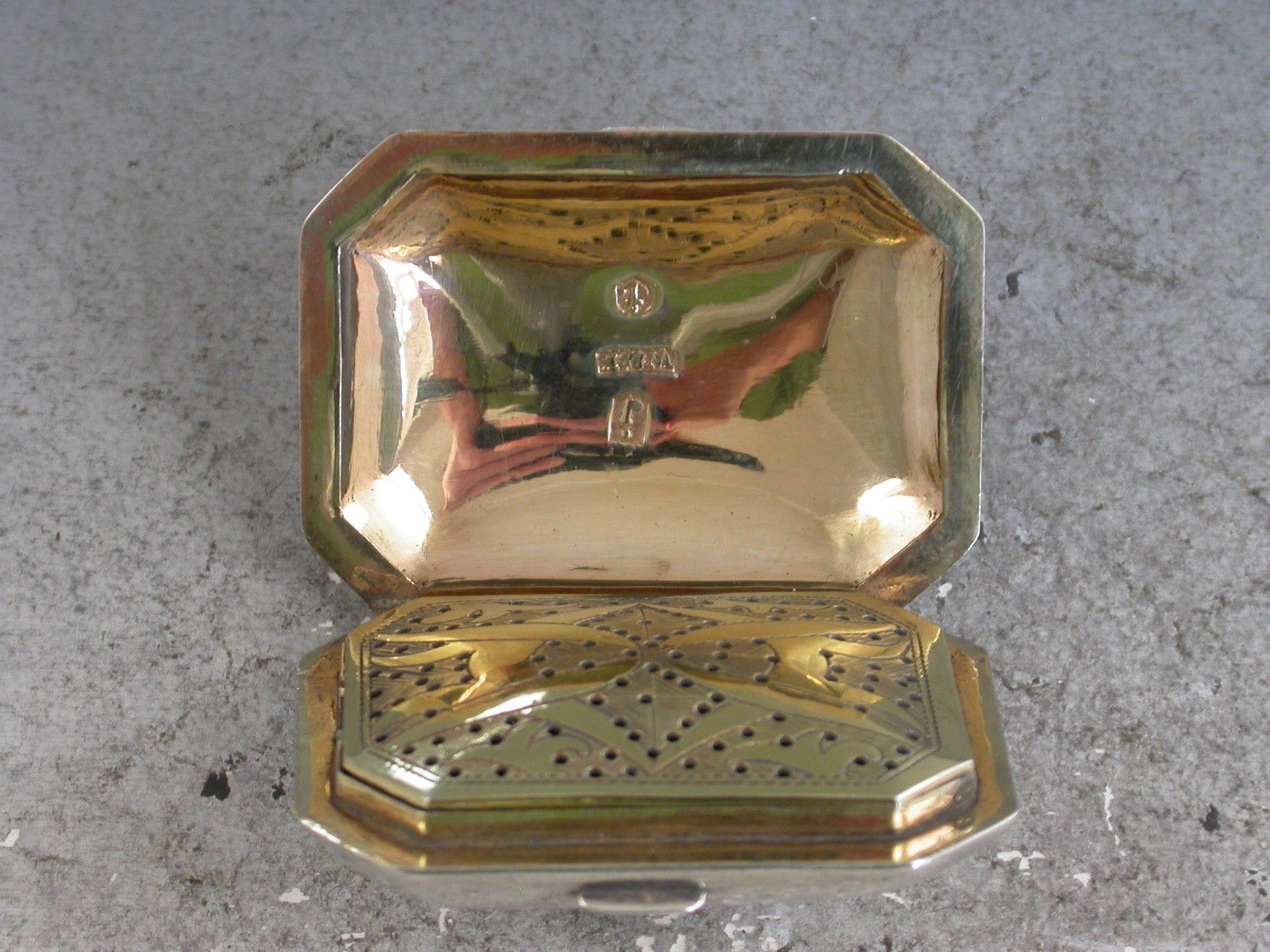 A fine and unusual George III silver Vinaigrette of oblong cushion shape with canted corners, the base perfectly plain, the lid engraved with foliate scroll decoration and a shaped cartouche engraved with contemporary initials, the silver gilt interior with unusual pierced grille with the geometric pattern.
