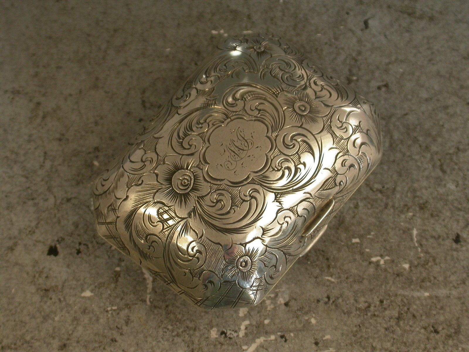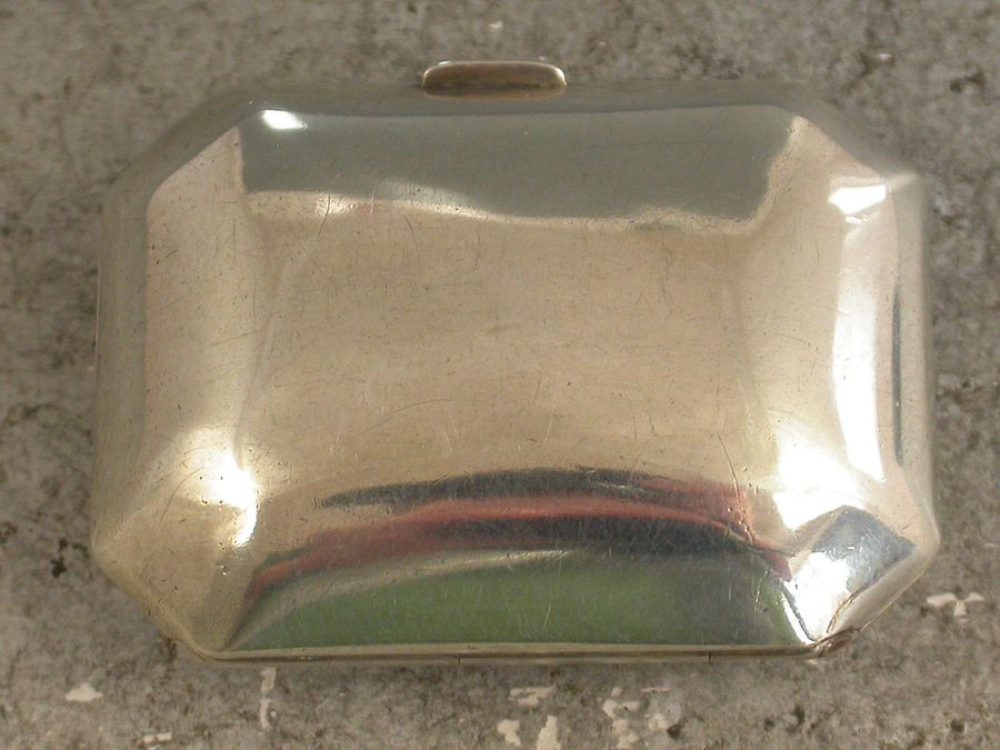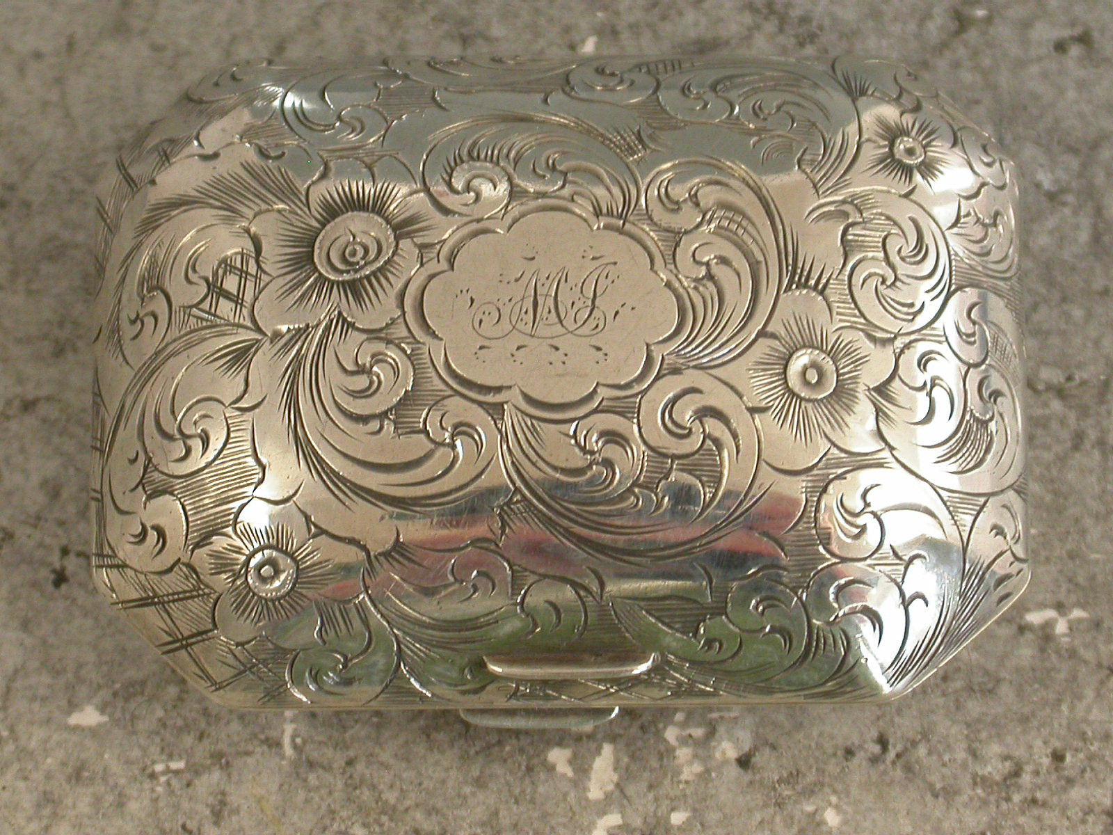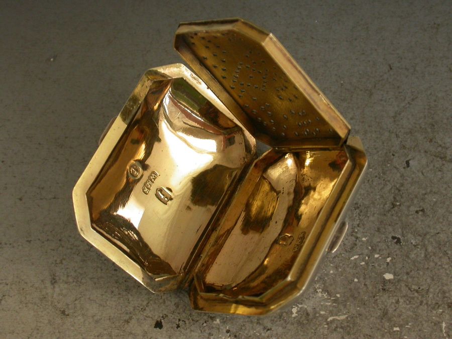 A fine and unusual George III silver Vinaigrette of oblong cushion shape with canted corners, the base perfectly plain, the lid engraved with foliate scroll decoration and a shaped cartouche engraved with contemporary initials, the silver gilt interior with unusual pierced grille with the geometric pattern.