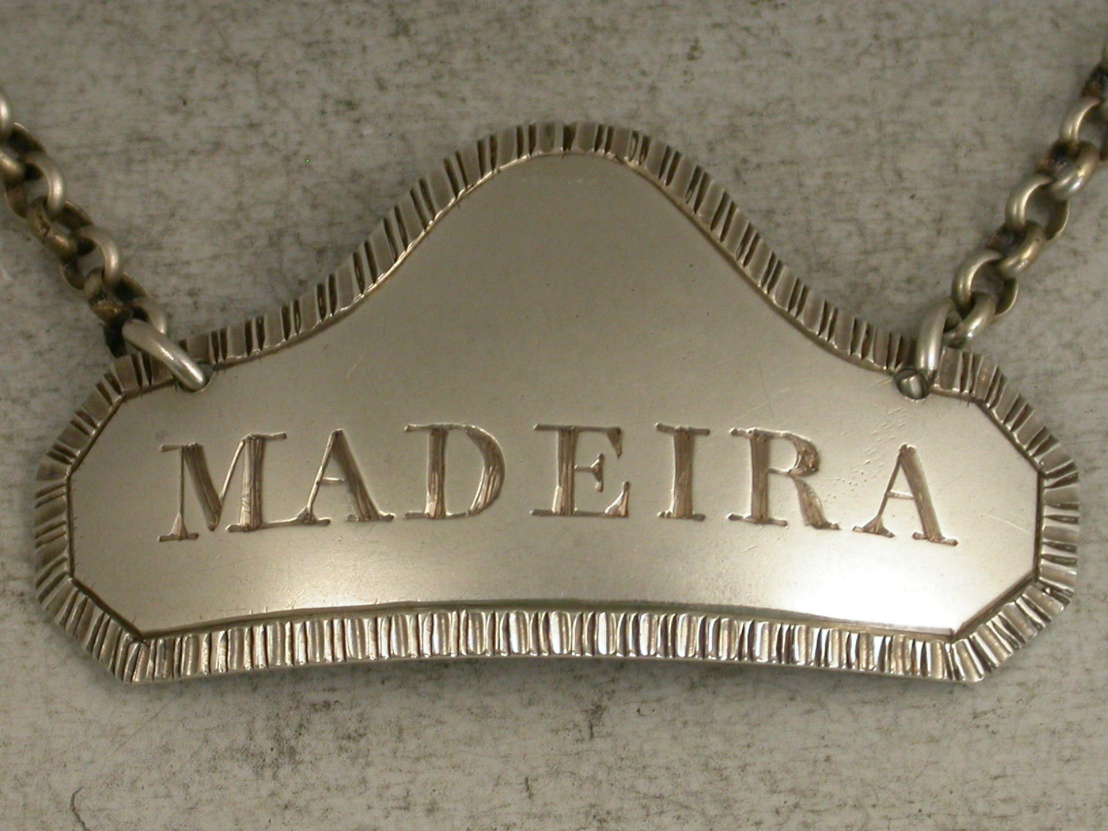 A good George III silver Wine Label of cut-cornered rectangular form with large domed top to facilitate the engraving of a crest or initials above the incised name for Madeira, with crisply cut gadrooned border.