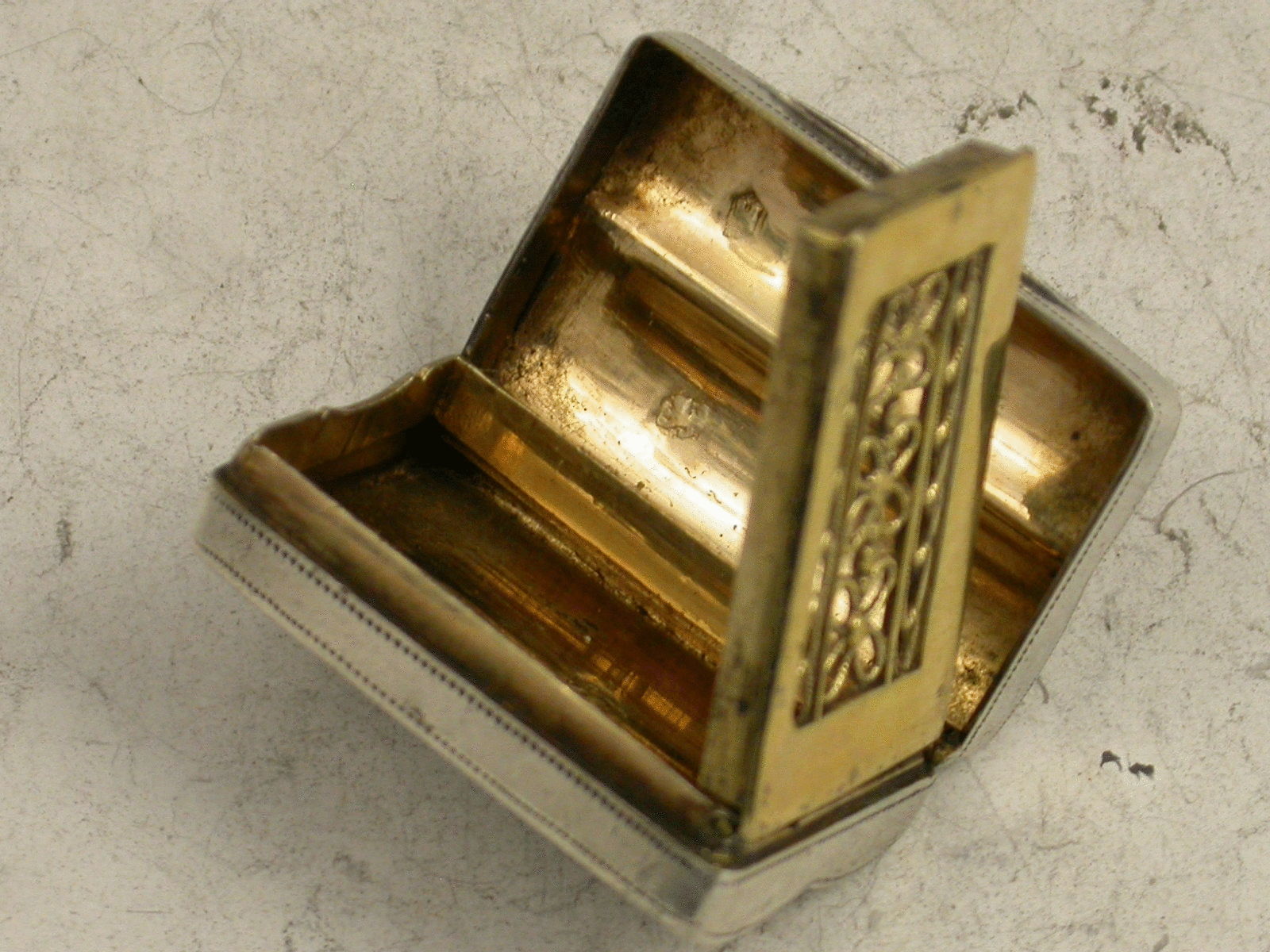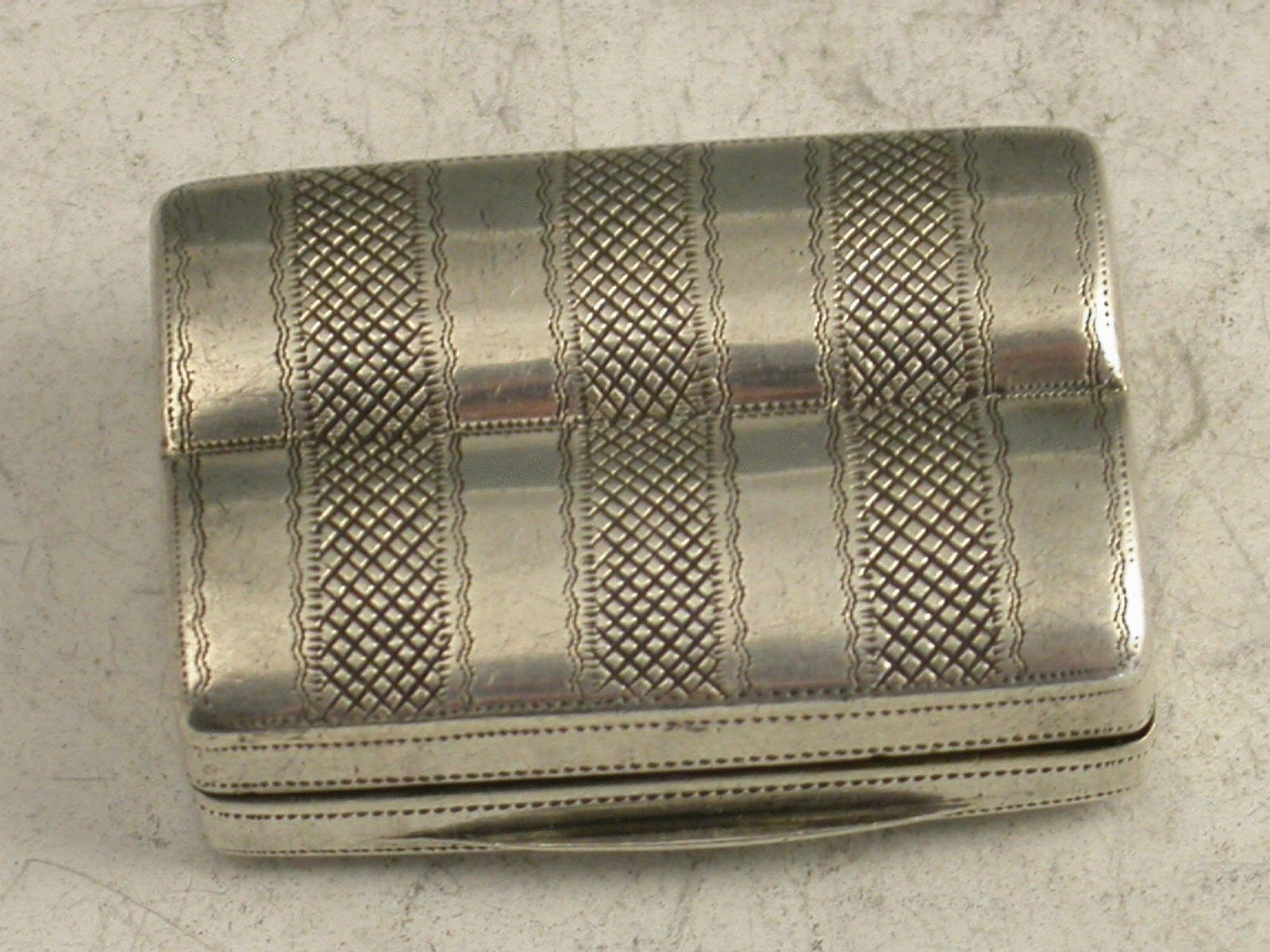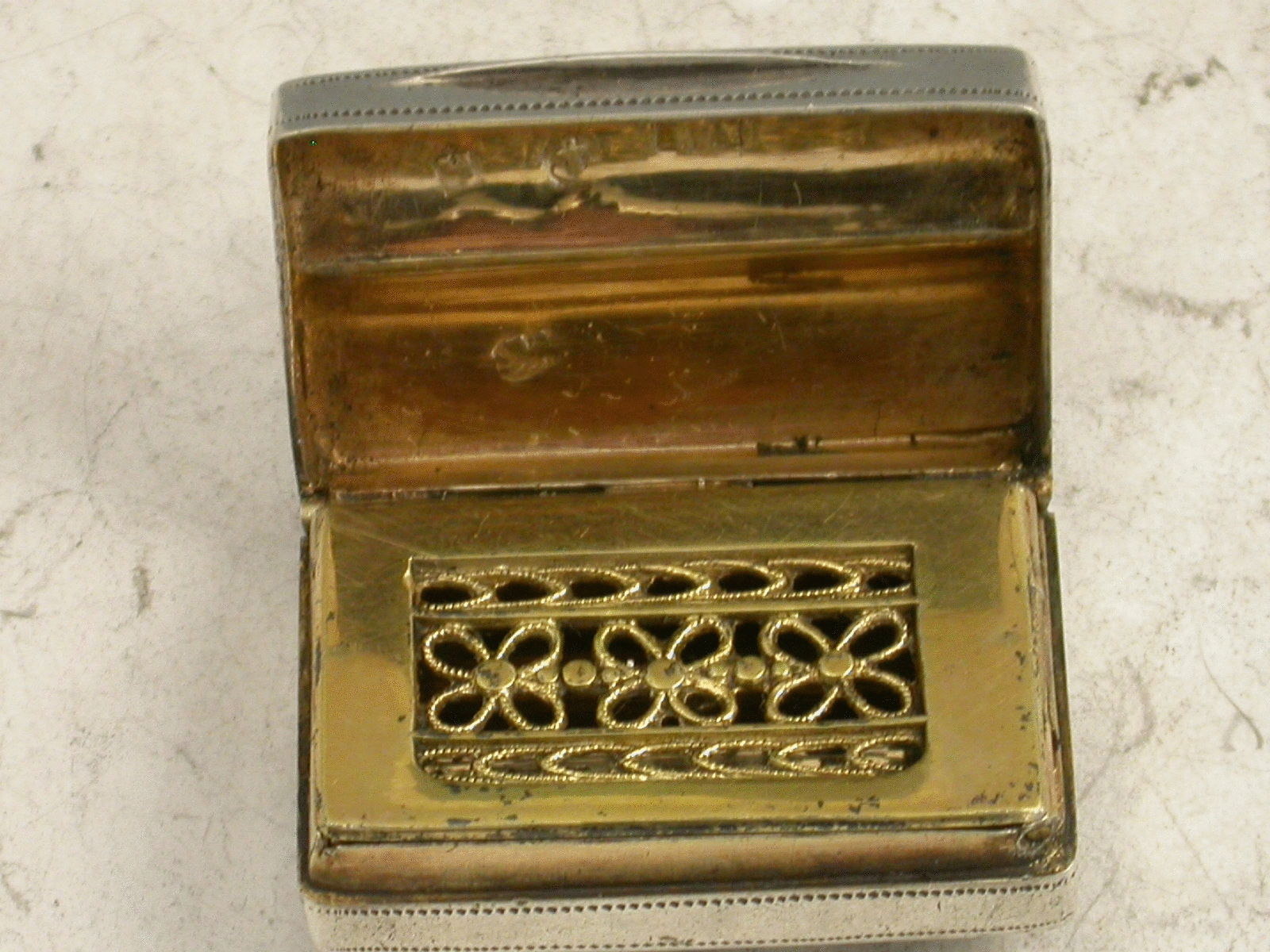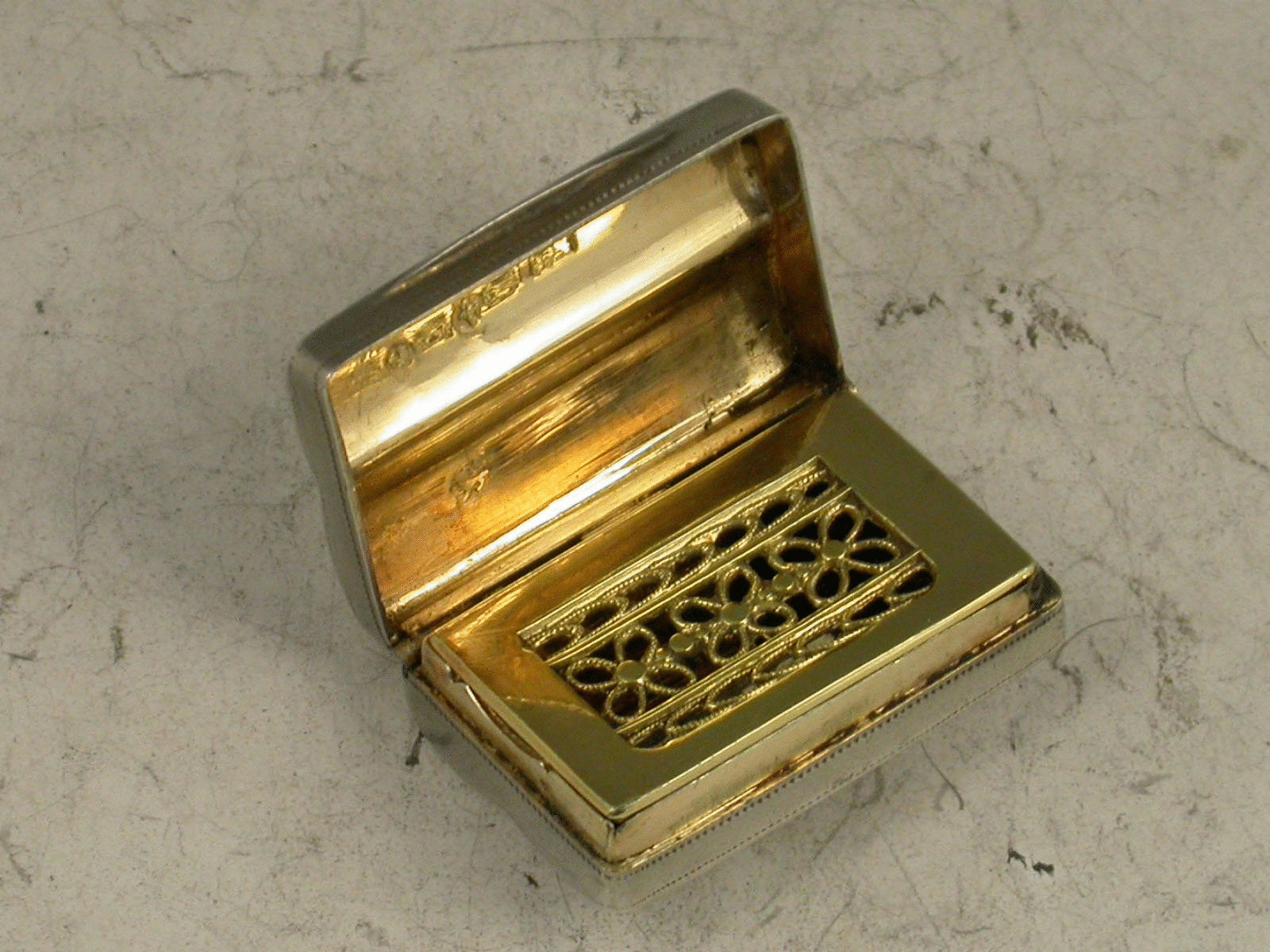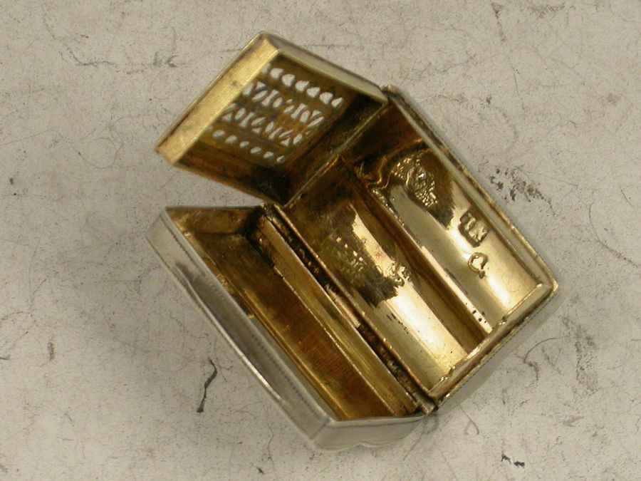 Rare George III silver Vinaigrette of shaped oblong ""double scroll box"" form, with three bands of hob-nail type engraved decoration, silver gilt interior with filigree type flower head pierced grille.