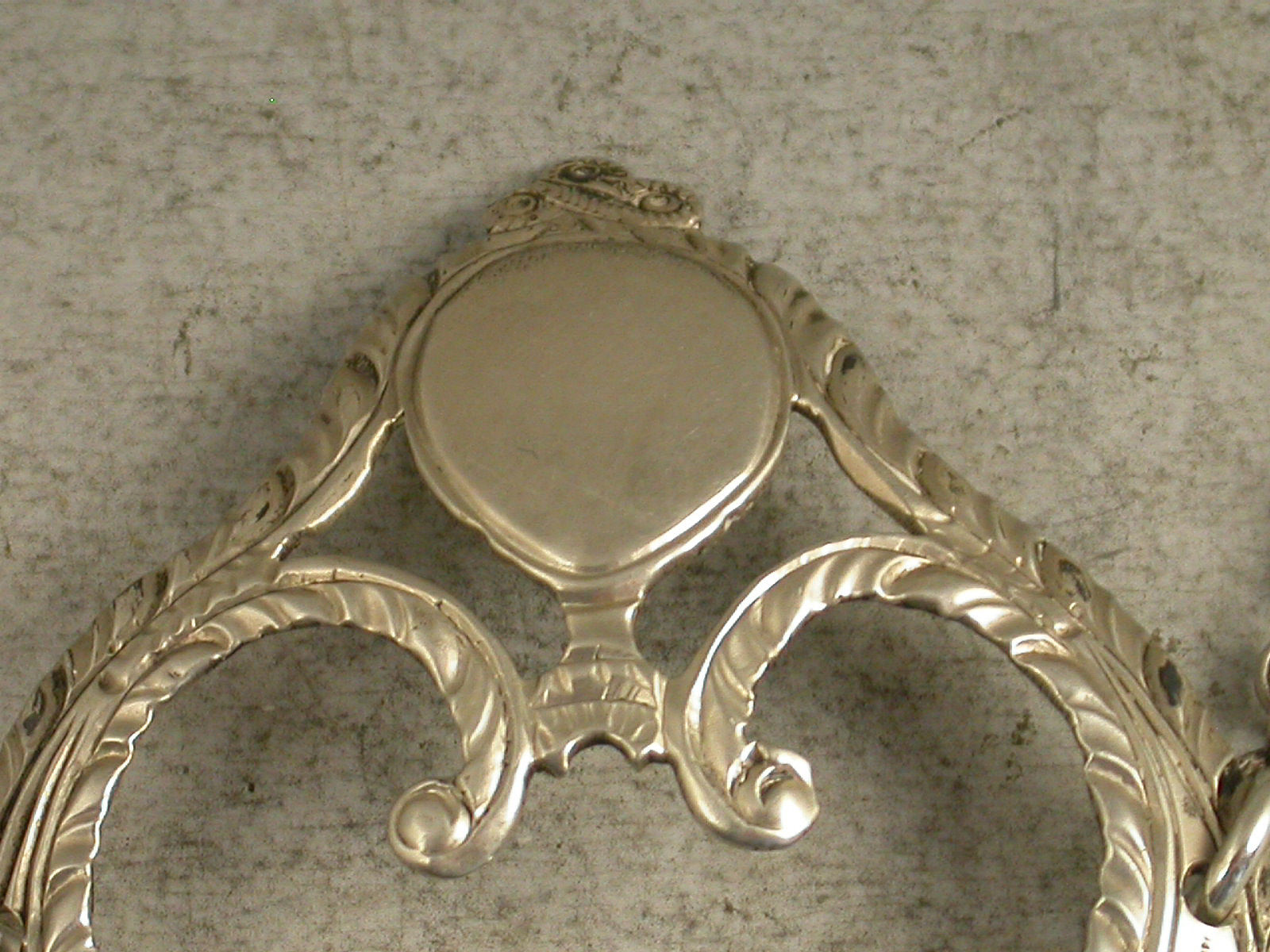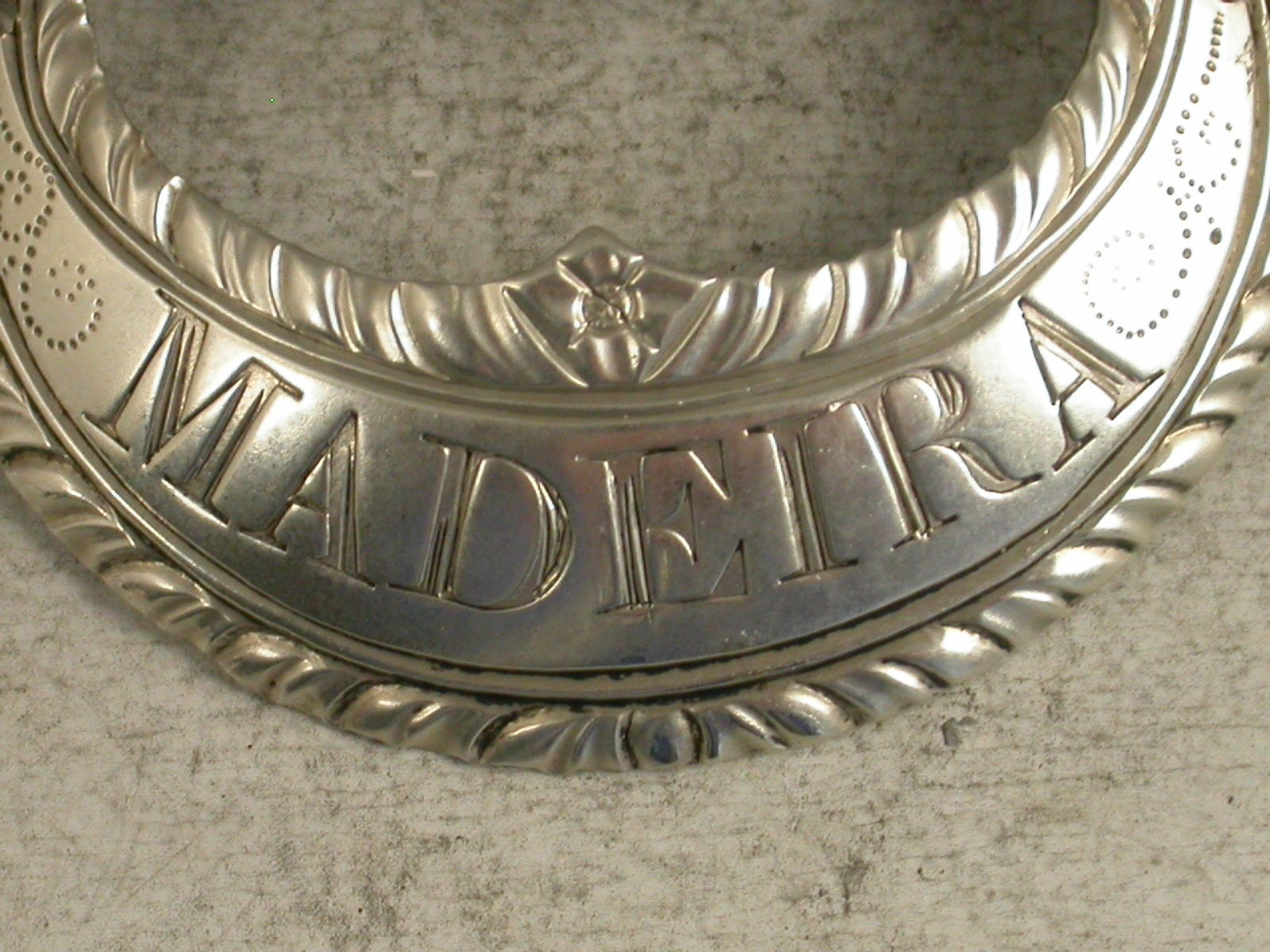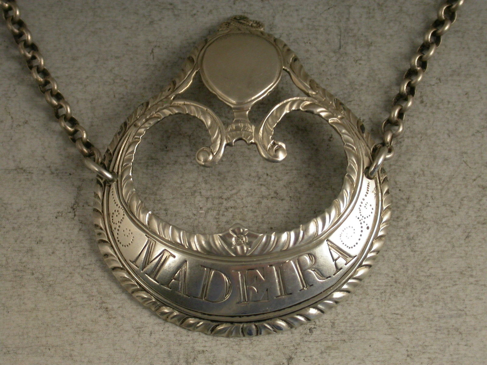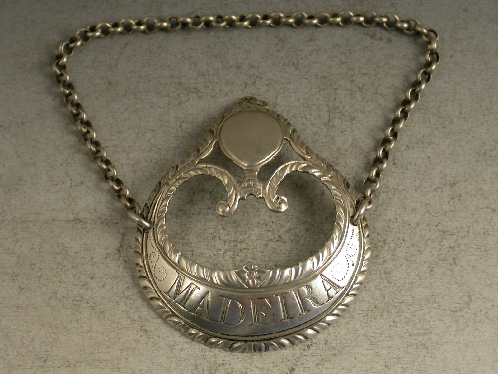 A fine George III silver Wine Label of enclosed crescent form with vacant oval cartouche above supported by swags with tied ribbon surmount, feather edge borders, incised for Madeira.