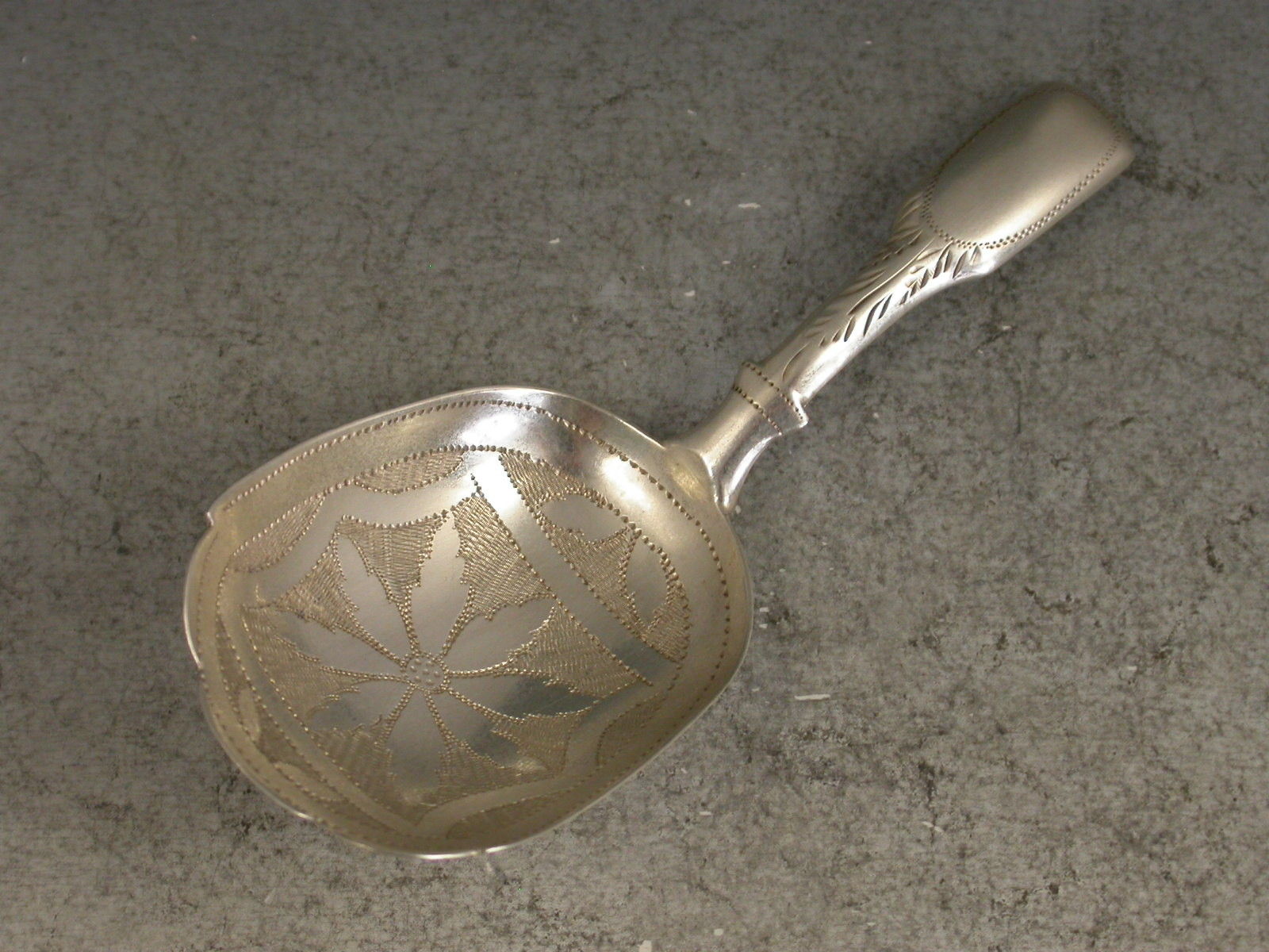 A good George III bright cut engraved silver Caddy Spoon with hollow fiddle pattern handle, the scoop shaped bowl with shaped front edge and stylized flower head decoration on a textured background.