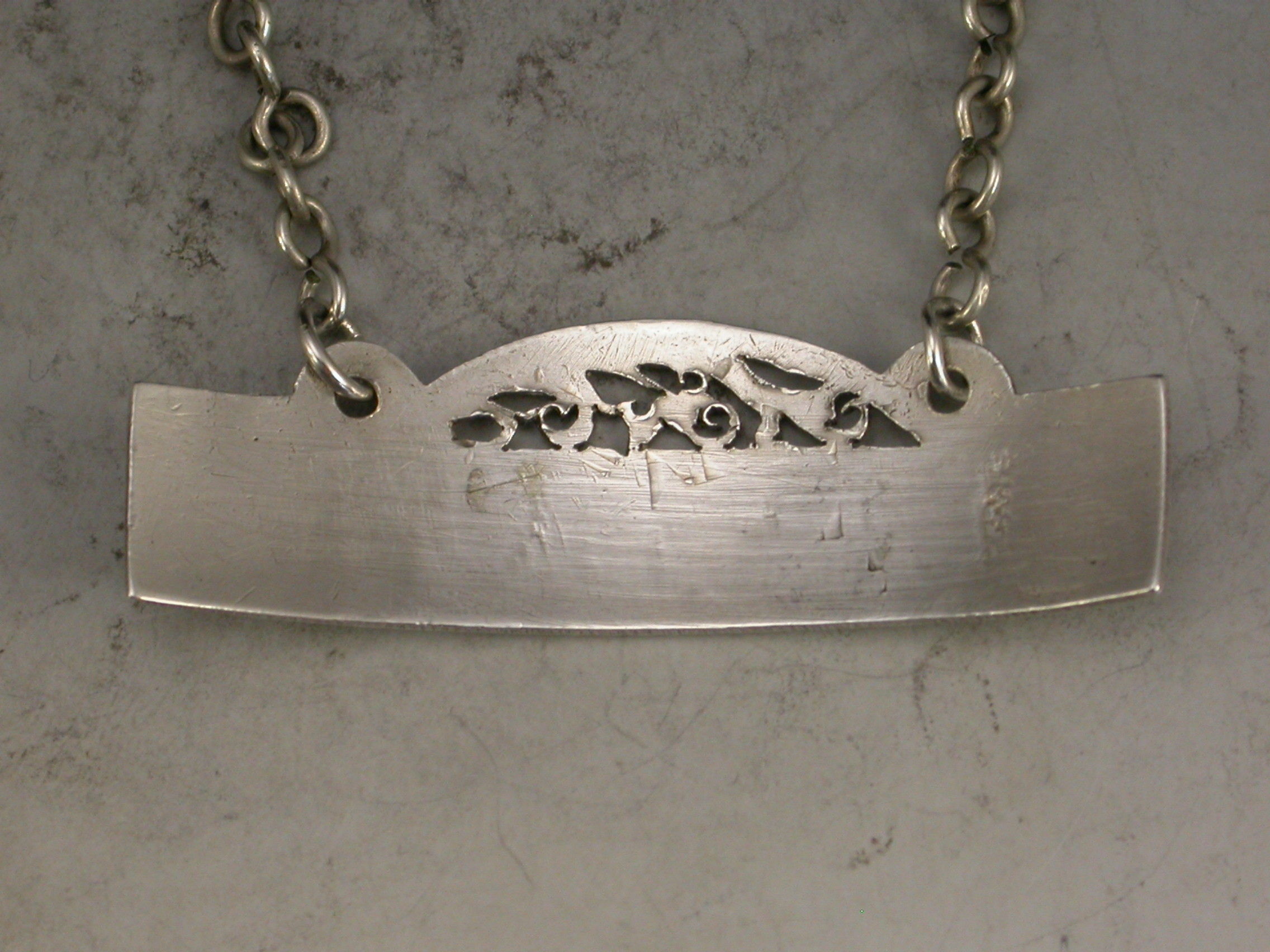 A fine quality George III silver Wine Label of fret domed rectangular form, with bright cut engraved border and raised eyelets, the domed surmount with scrolled piercing.