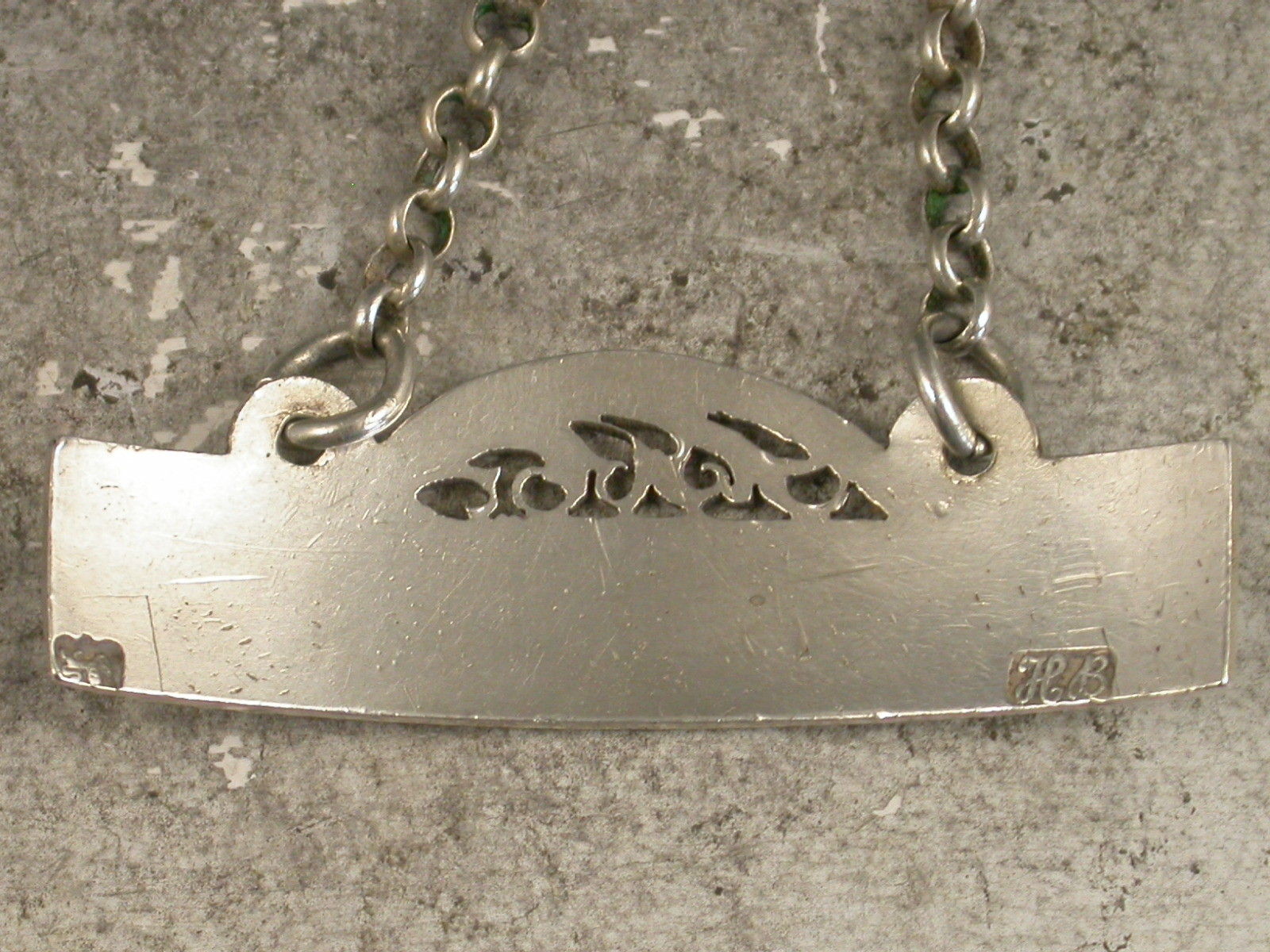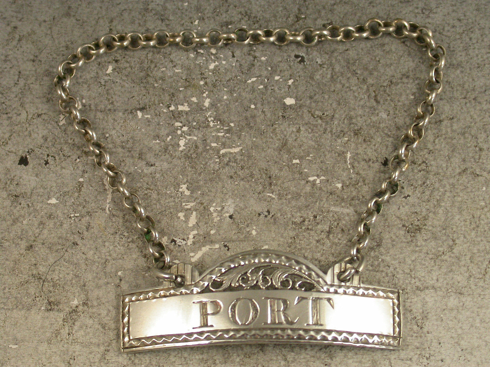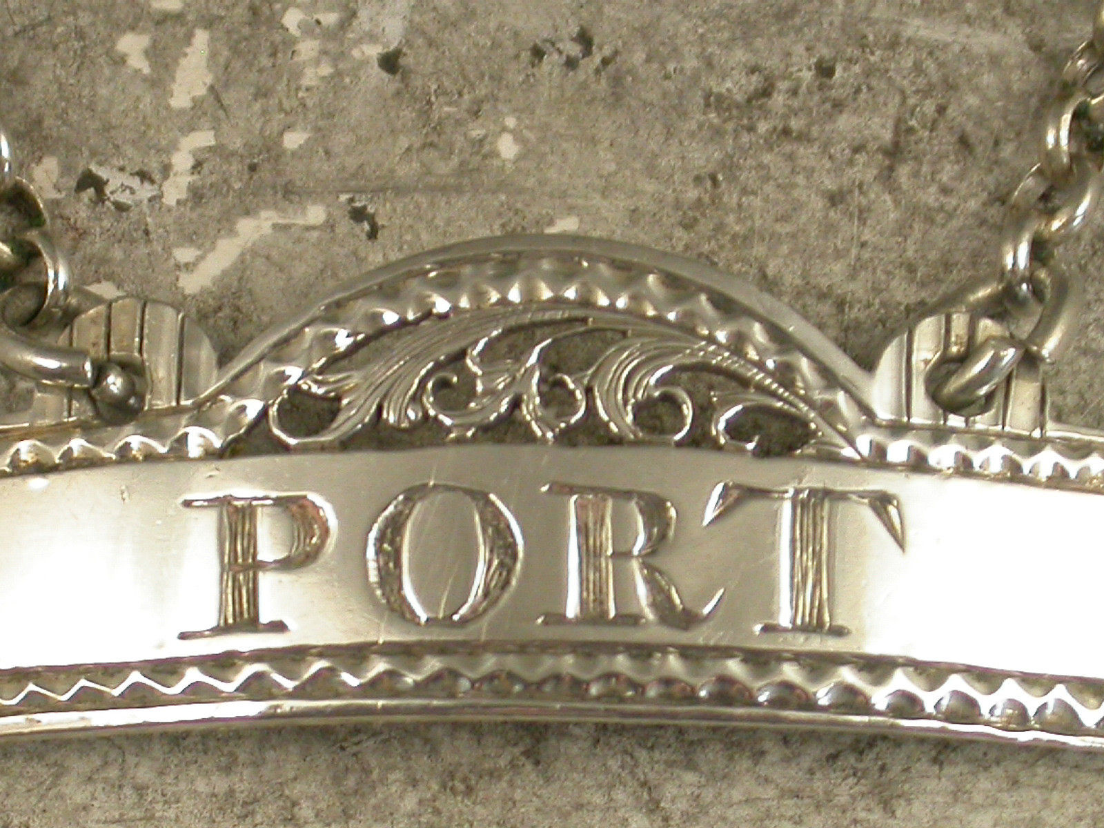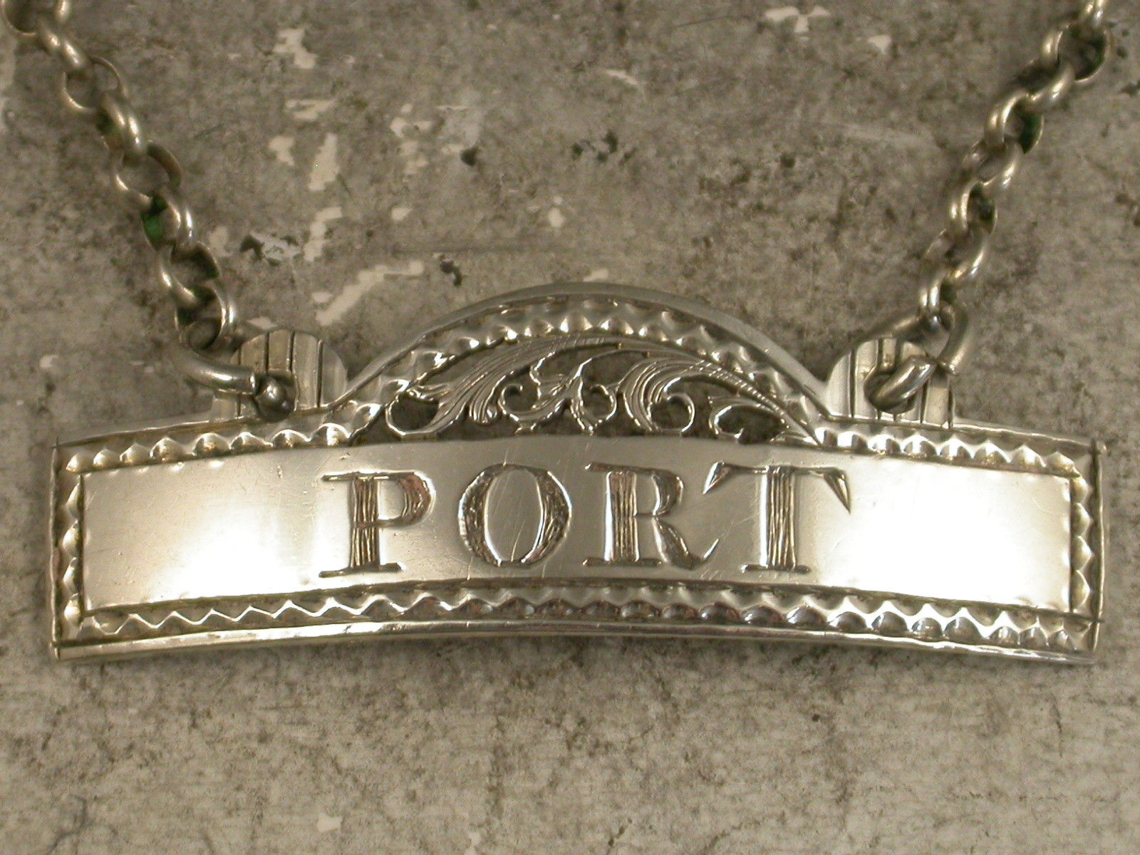 A fine George III 18th century silver Wine Label of fret domed rectangular form with bright-cut engraved border and raised eyelets, the domed surmount with scroll piercing. Incised for Port.