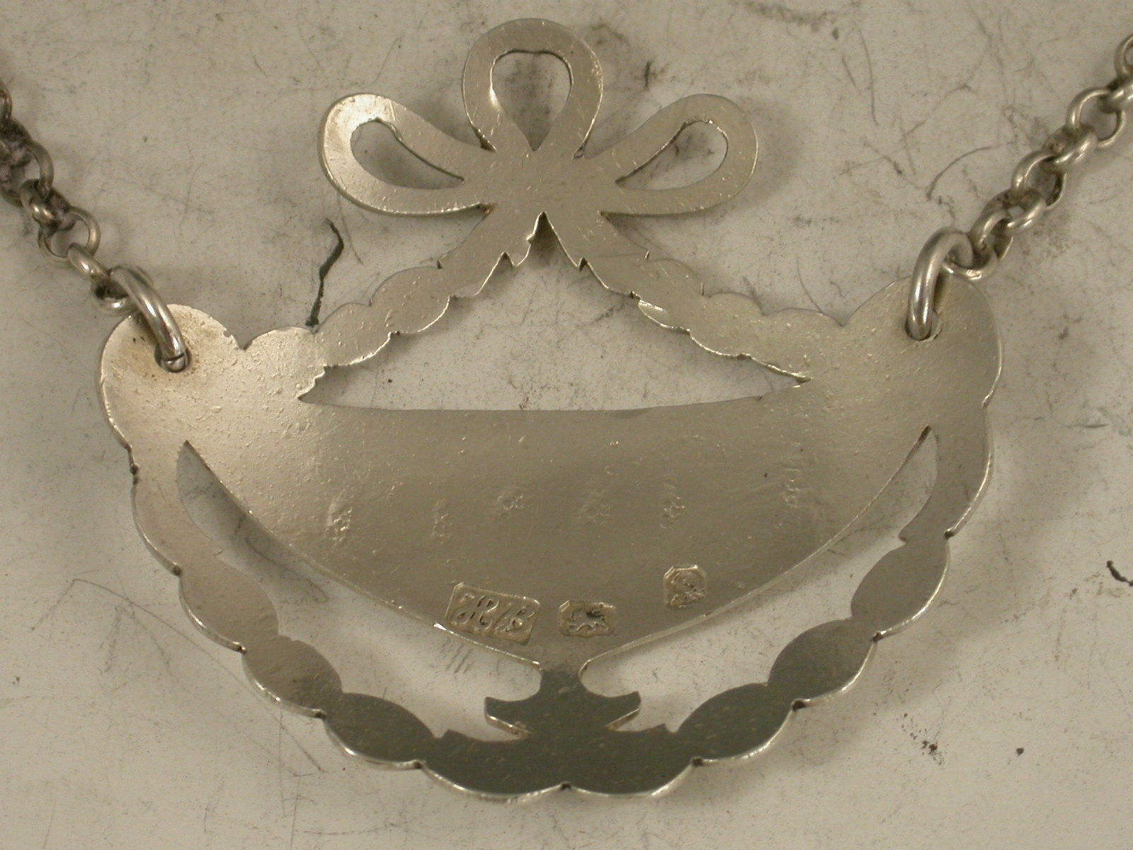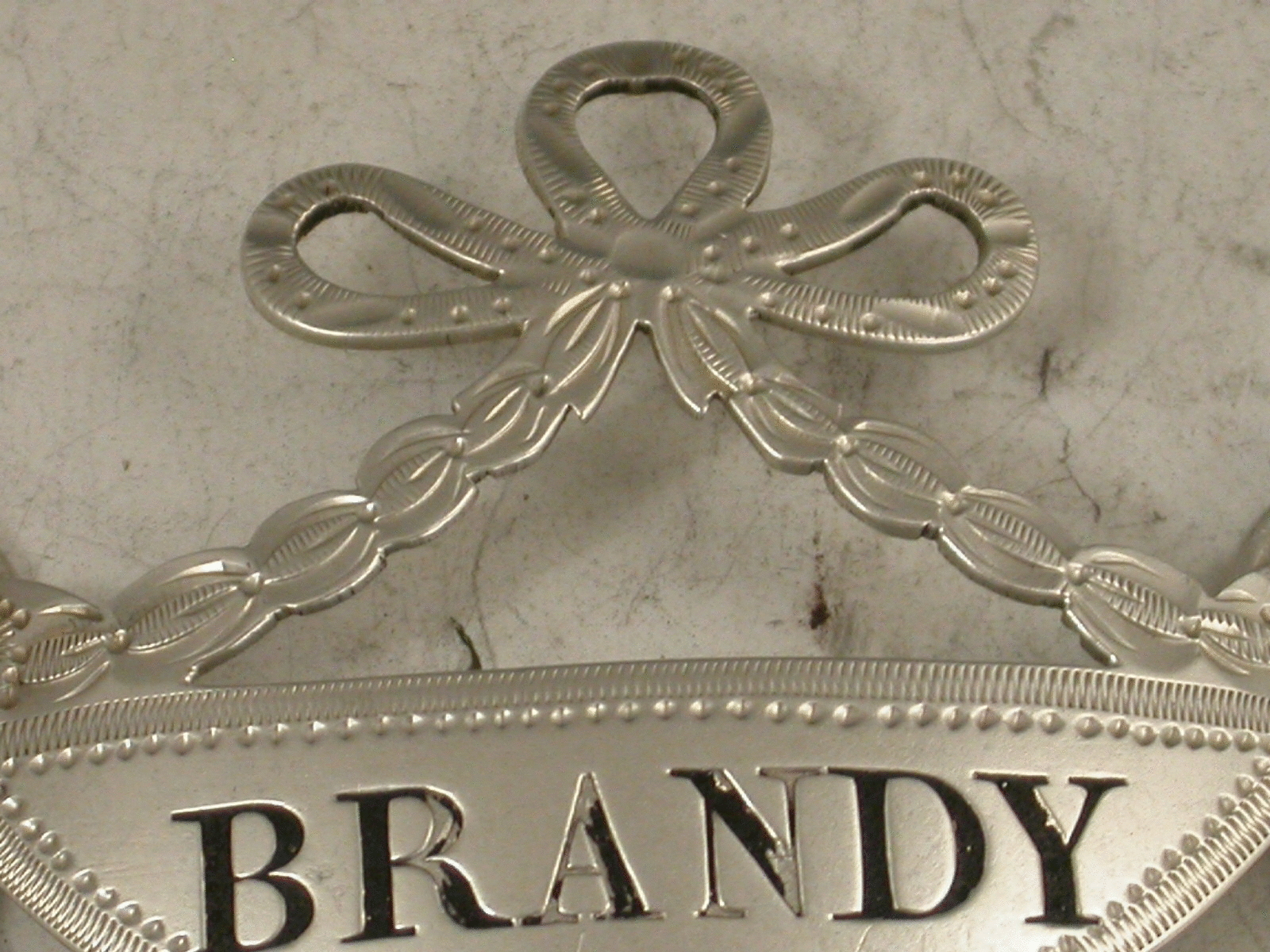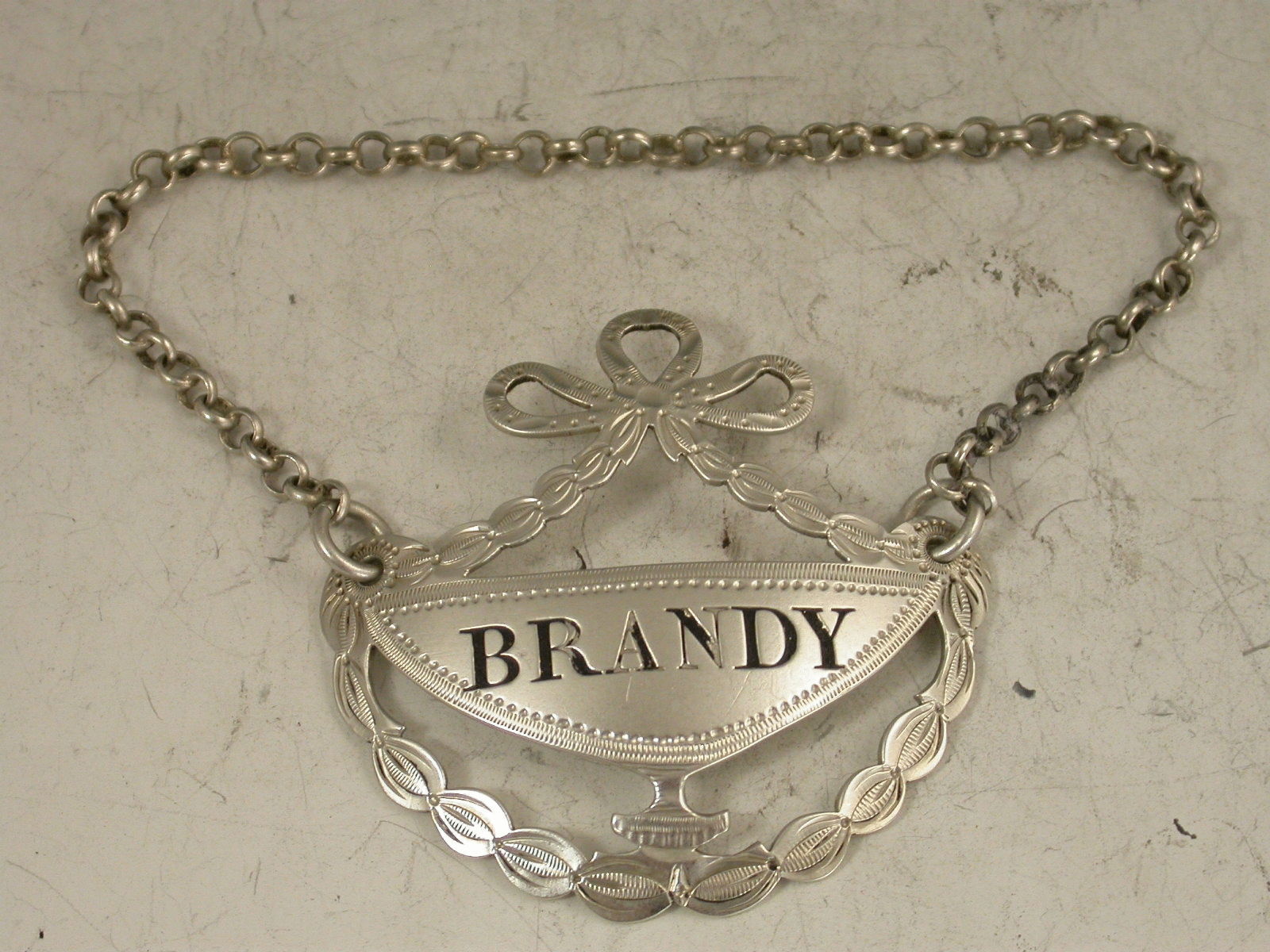 A fine George III 18th century silver Wine Label of ""goblet and festoon"" form with tied ribbon surmount, incised and niello filled for Brandy.