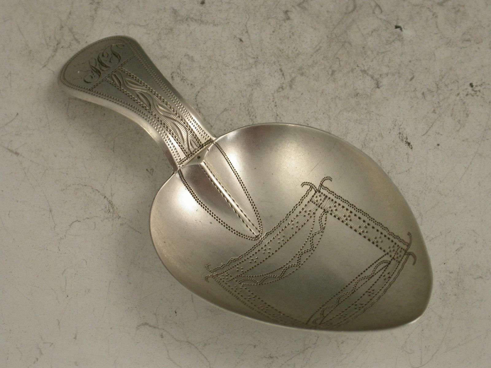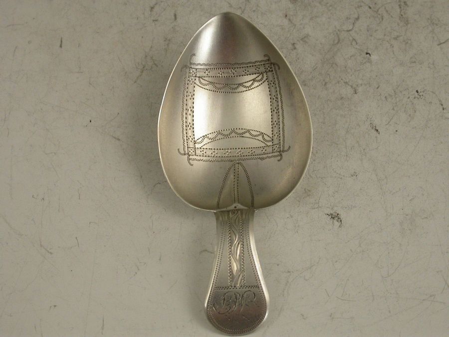A good George III silver Caddy Spoon with bright cut engraved Old Englsh type handle, the heart shaped bowl also with bright cut engraved decoration in an unusual square pattern.